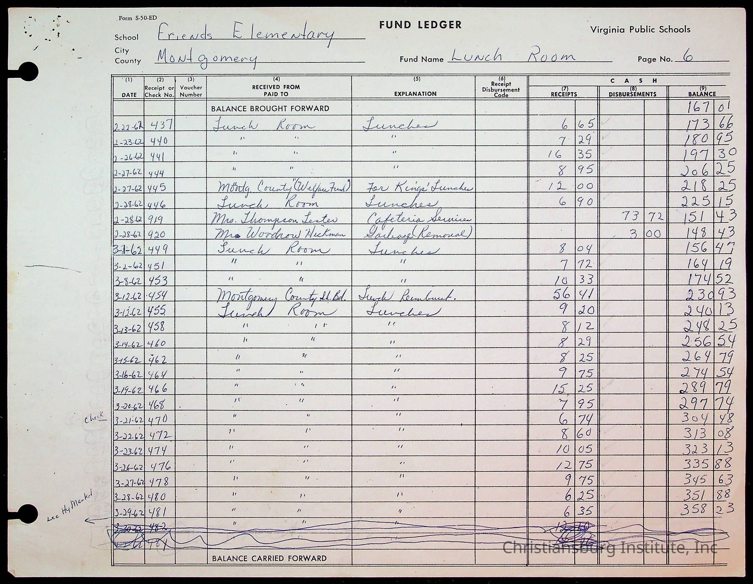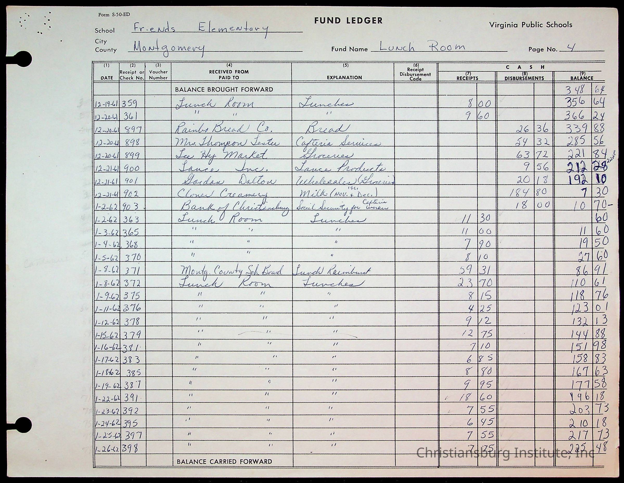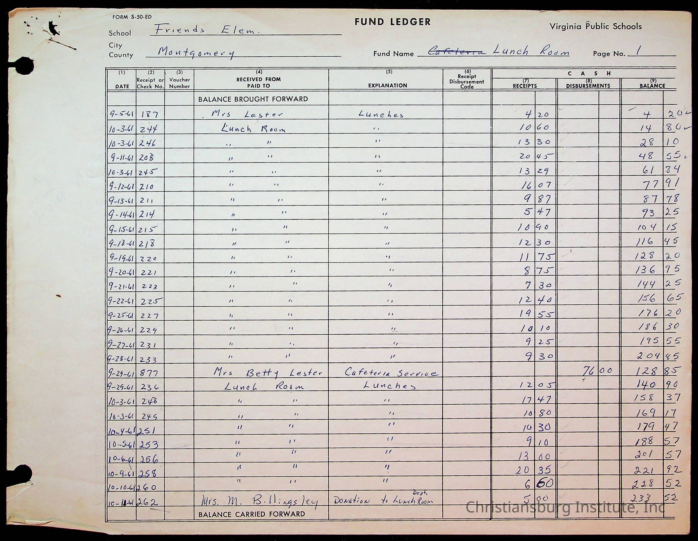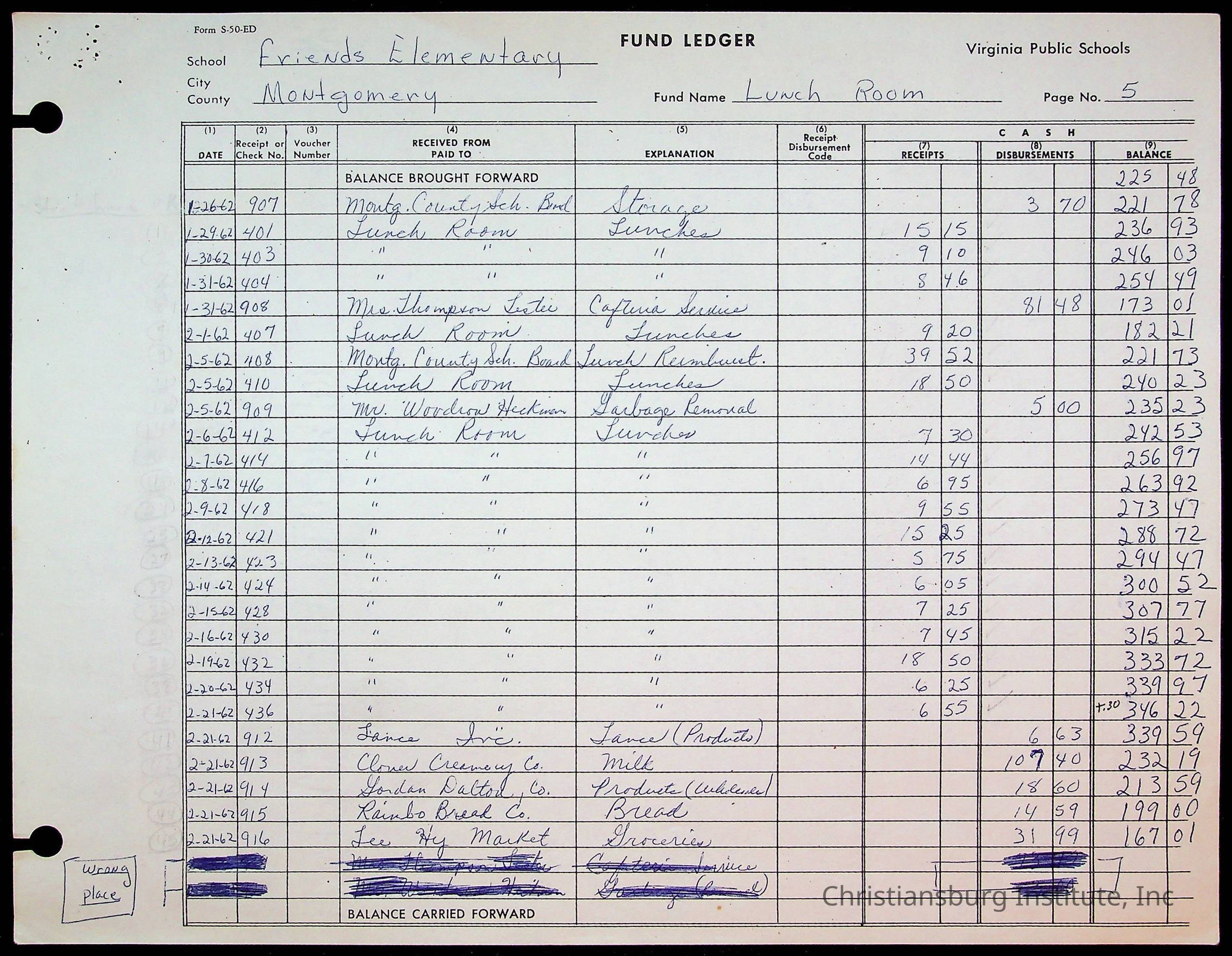 A fund ledger that recorded expenses from the lunch room at Friends Elementary School from 1961-1962.Collection