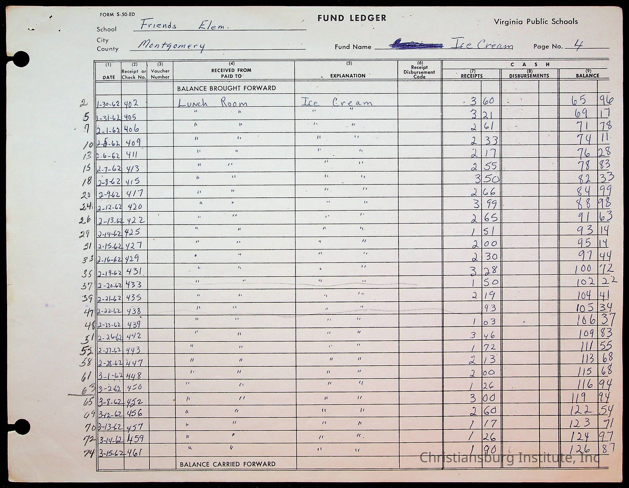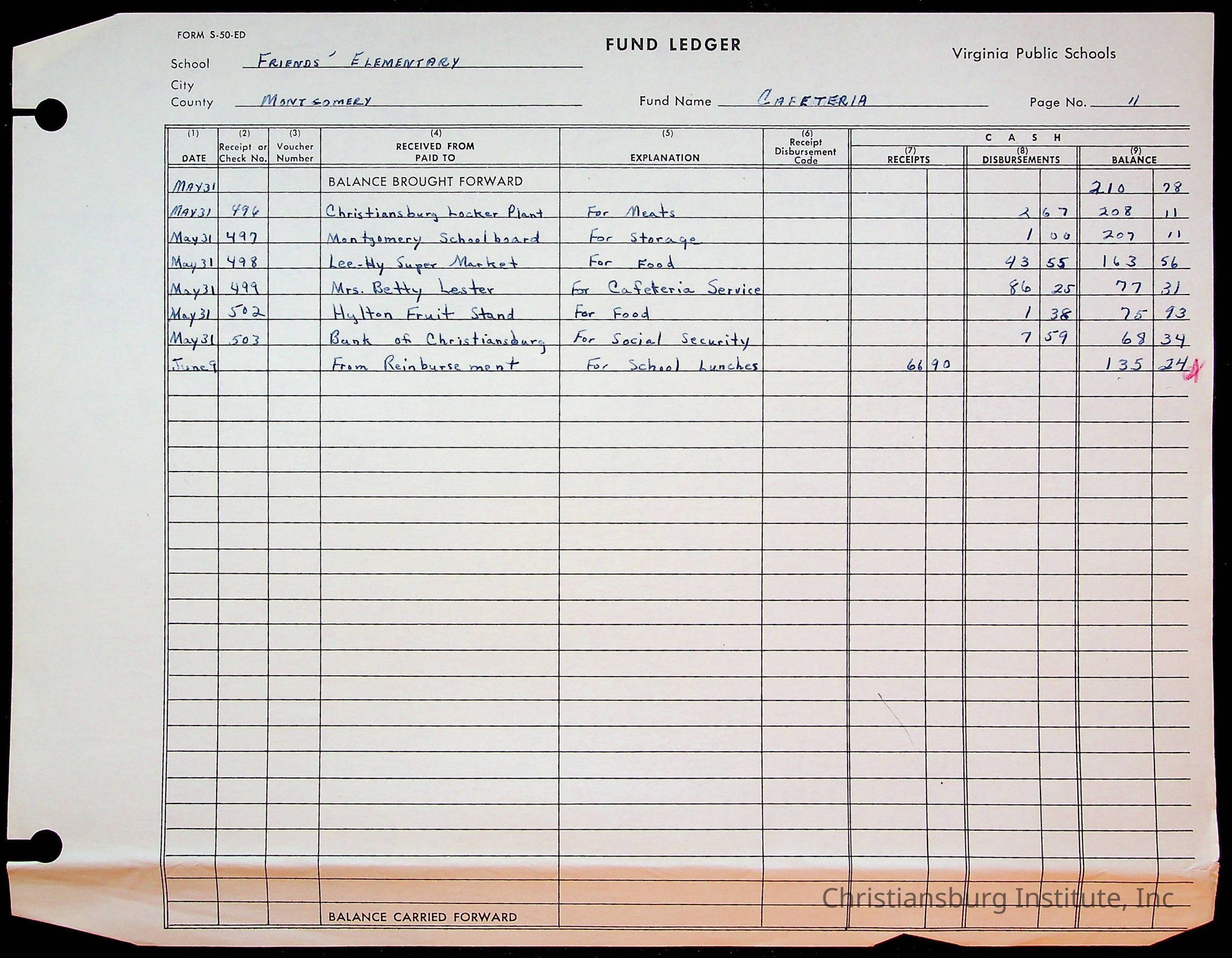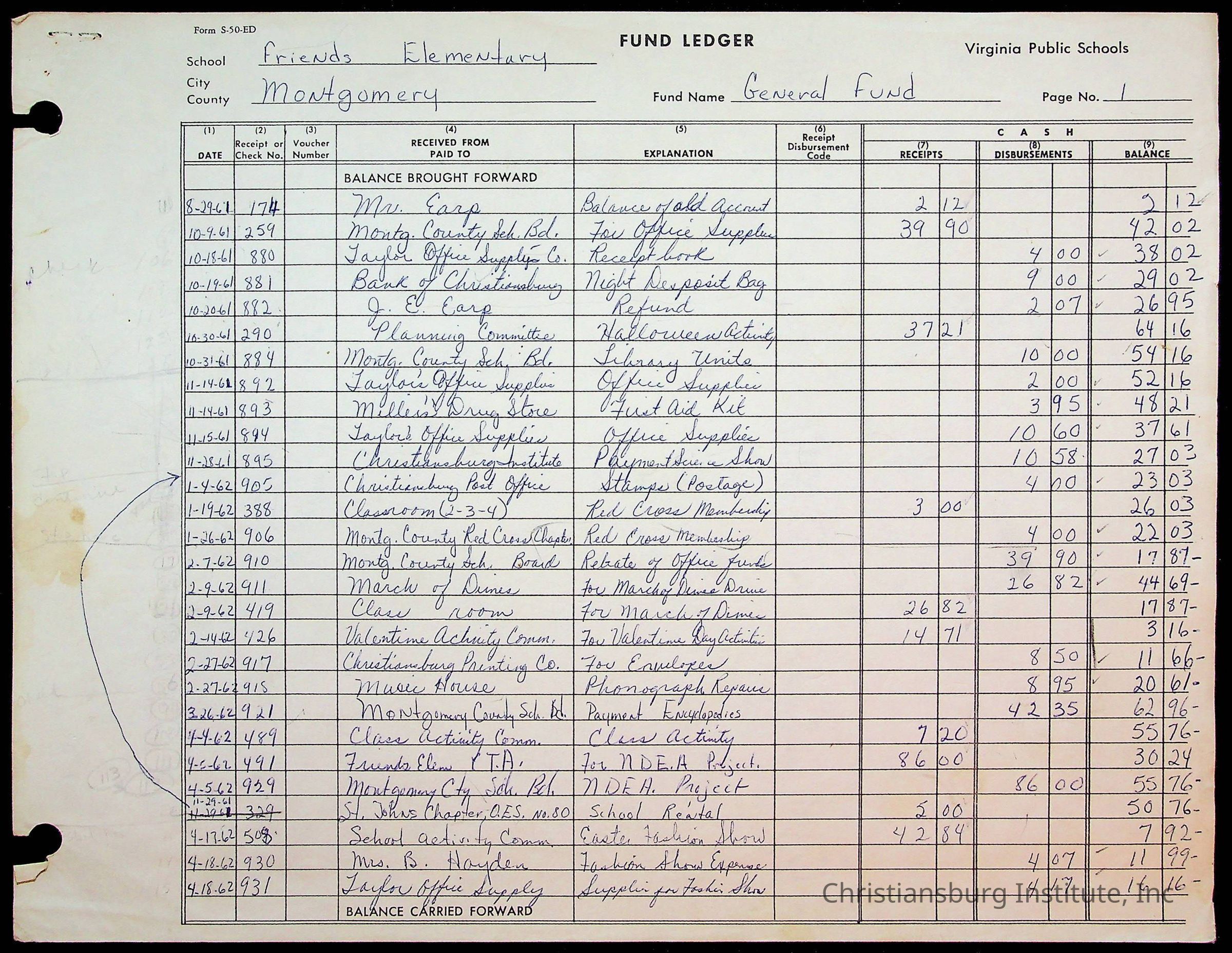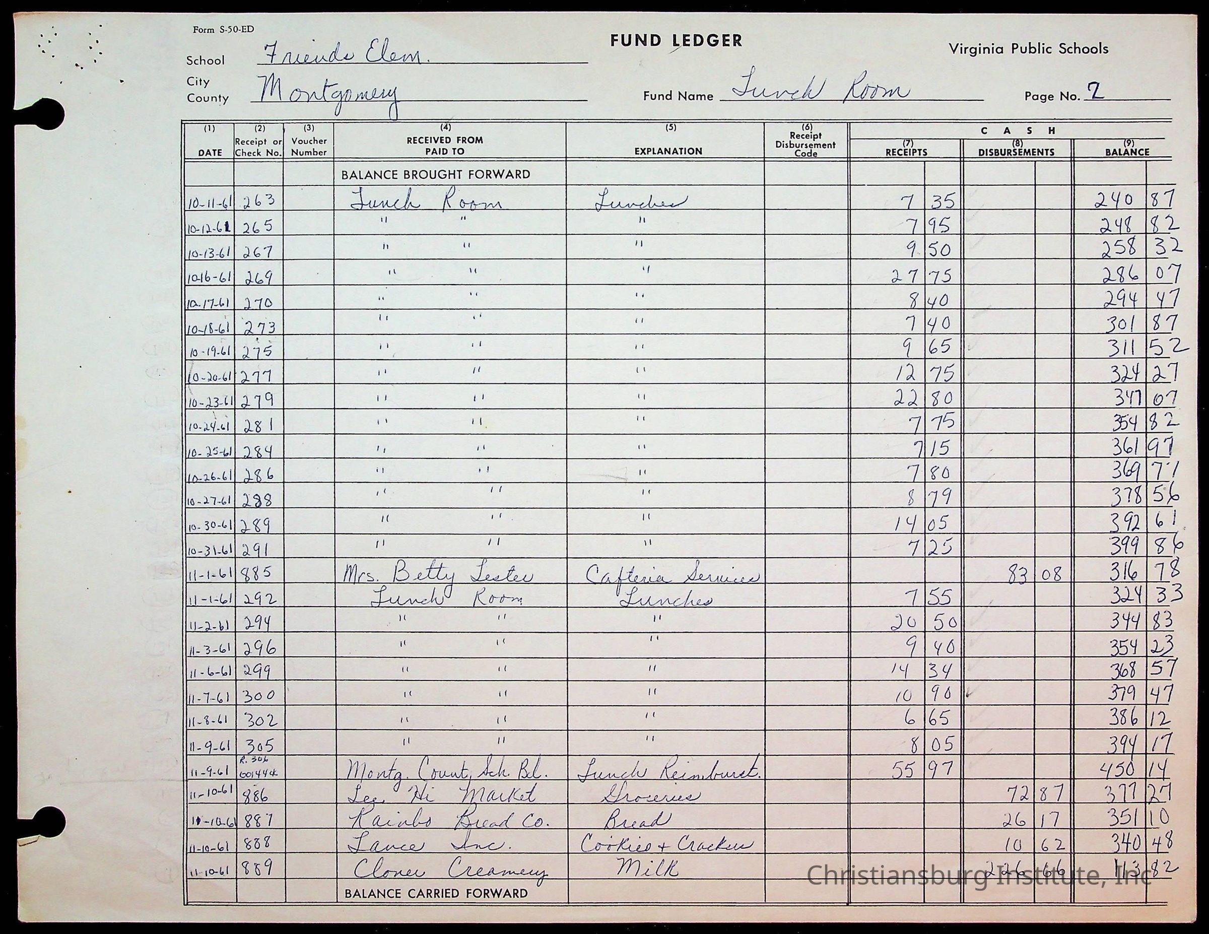 A fund ledger that recorded expenses from the lunch room at Friends Elementary School from 1961-1962.Collection