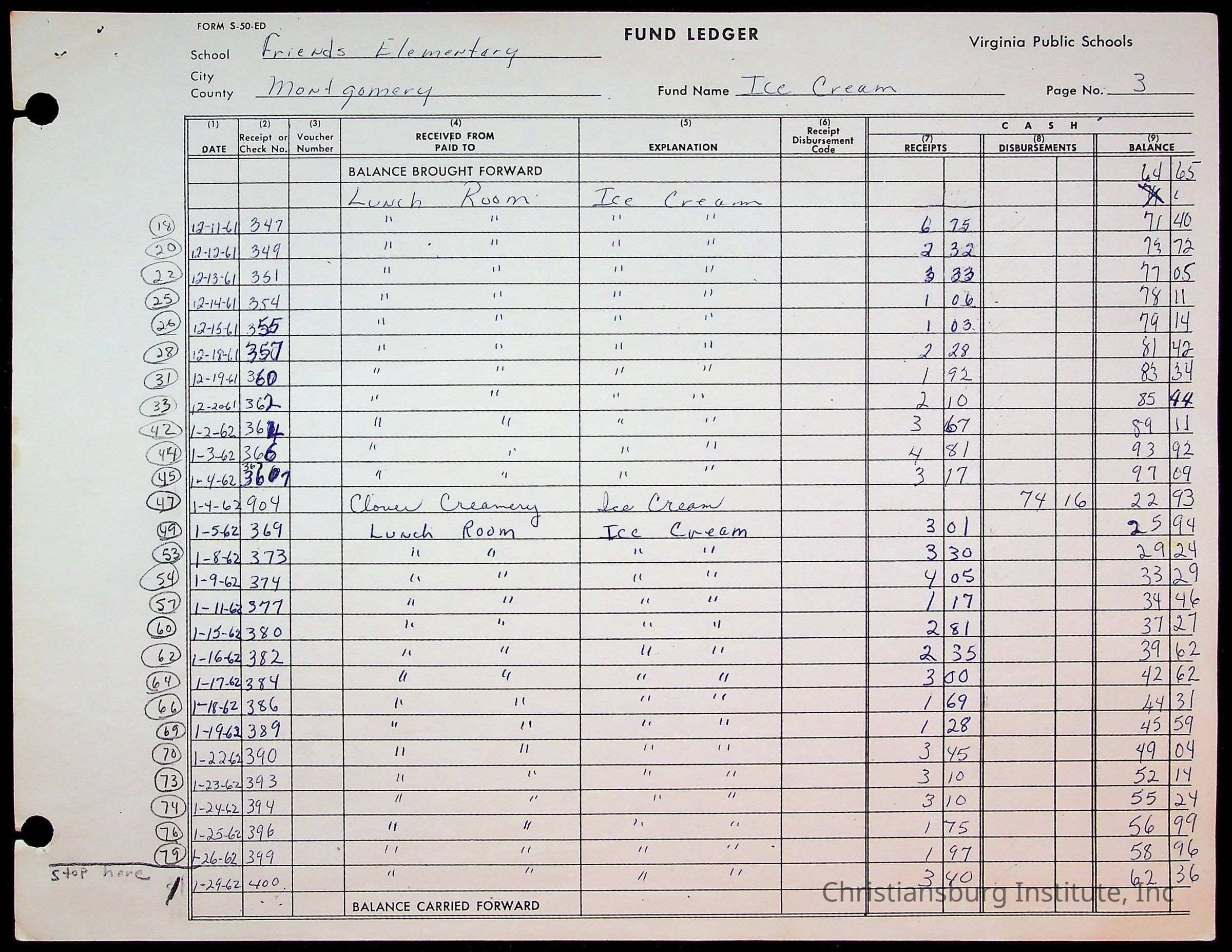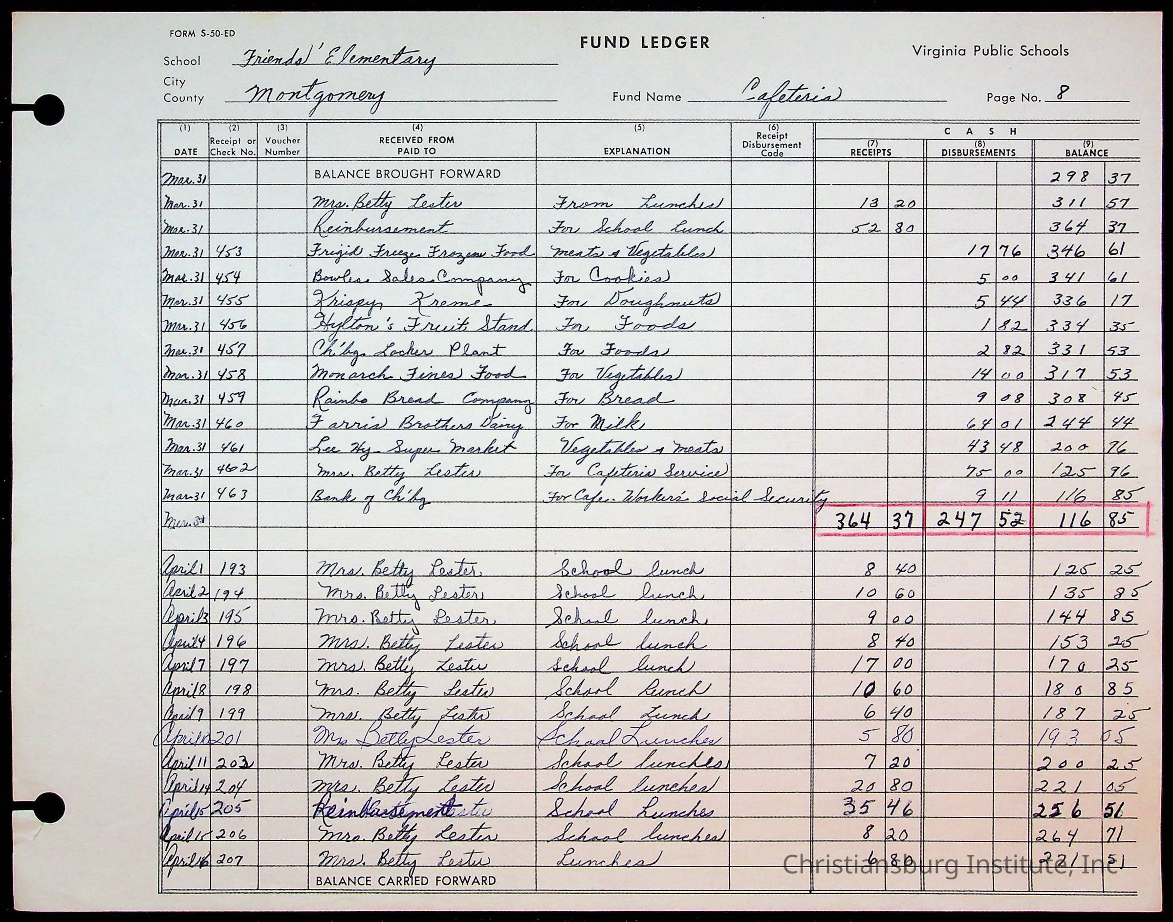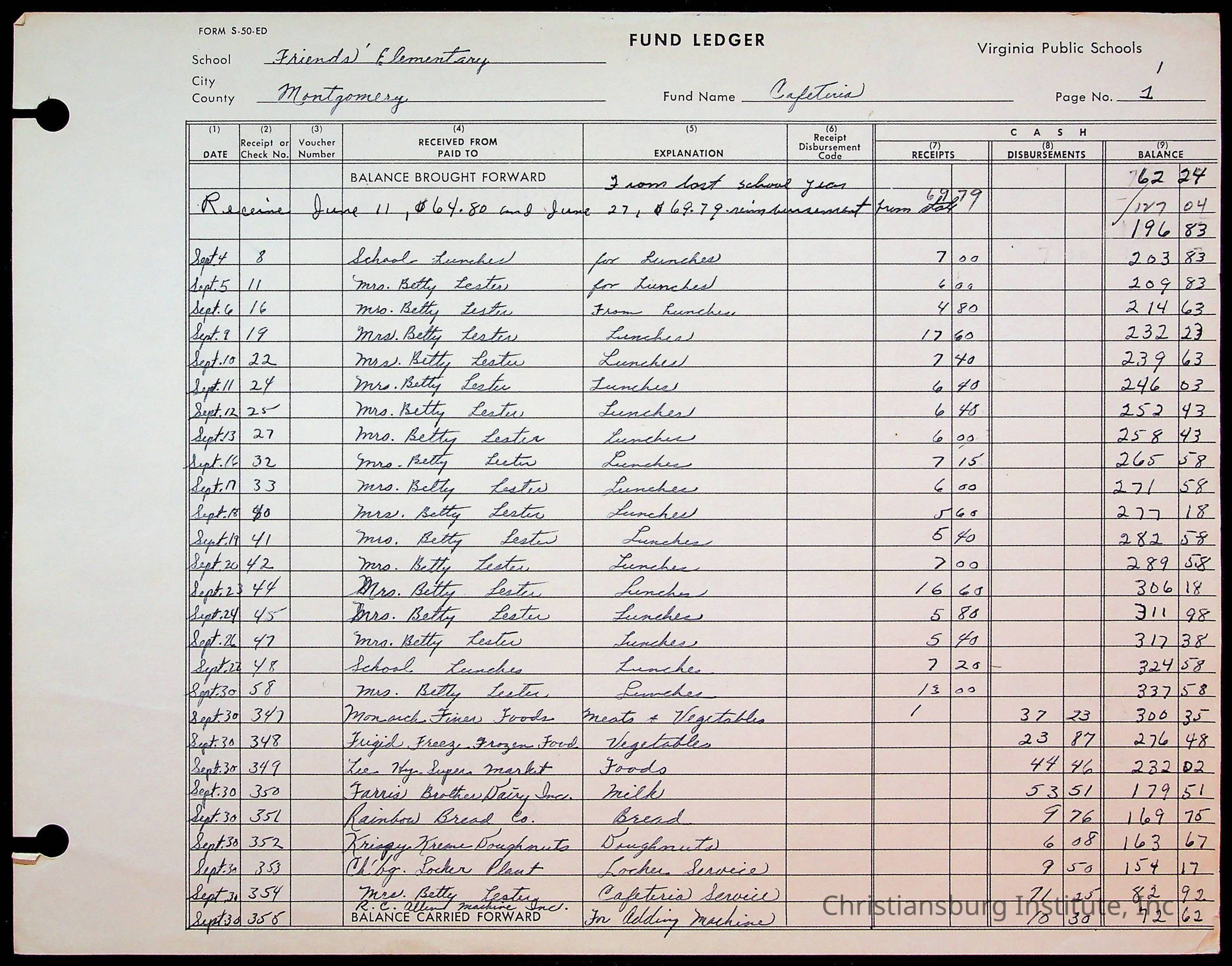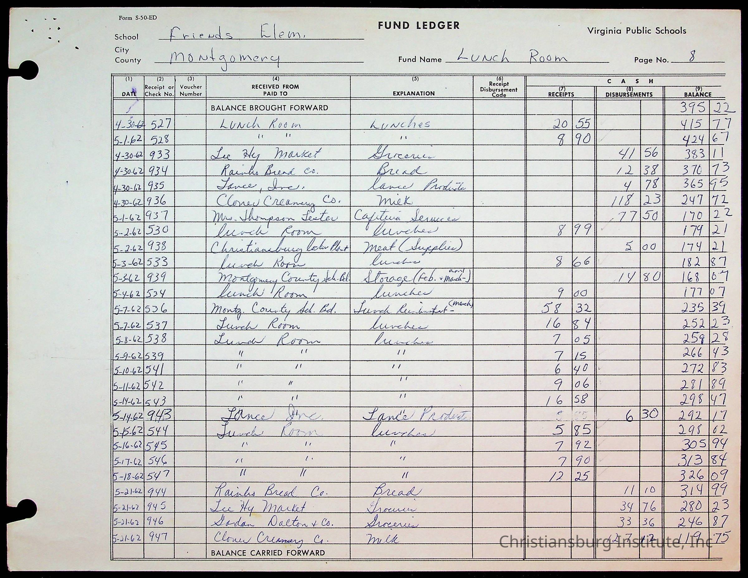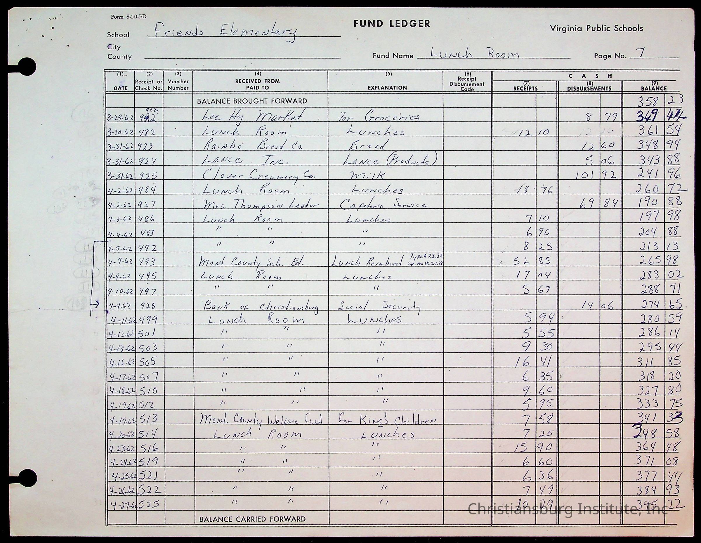 A fund ledger that recorded expenses from the lunch room at Friends Elementary School from 1961-1962.Collection