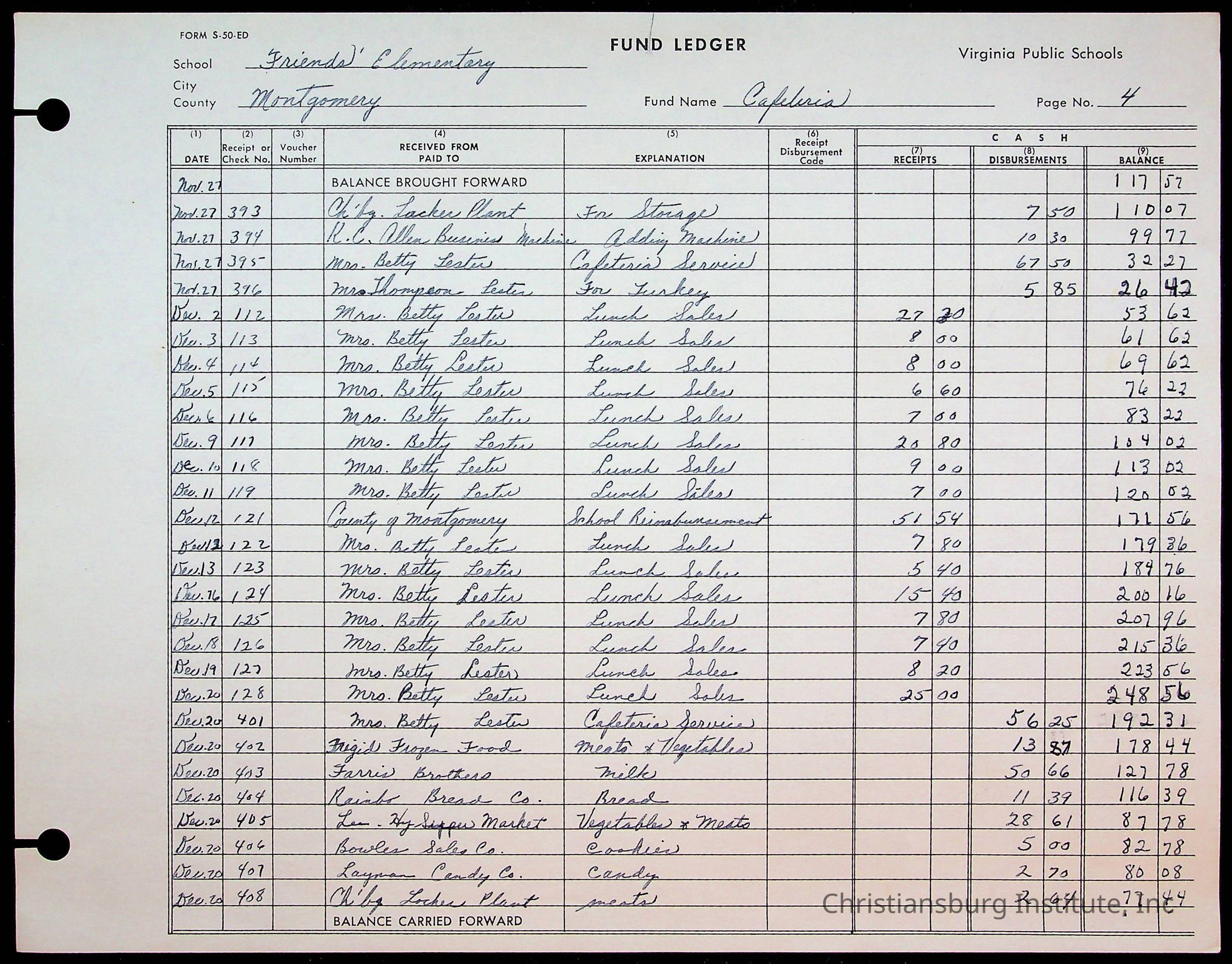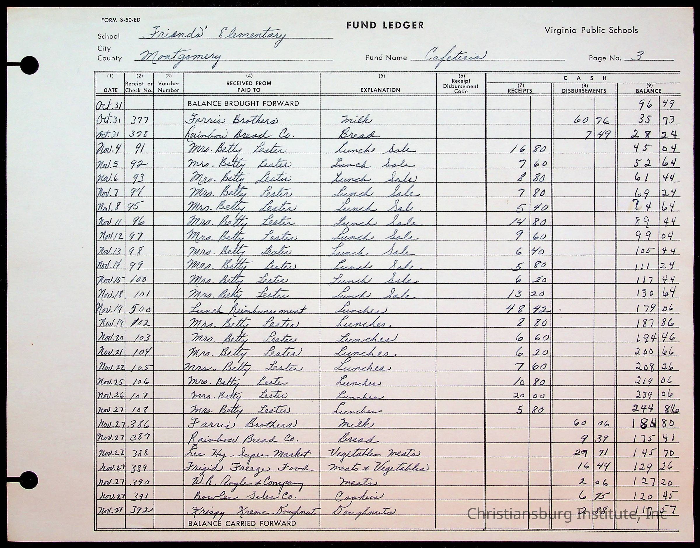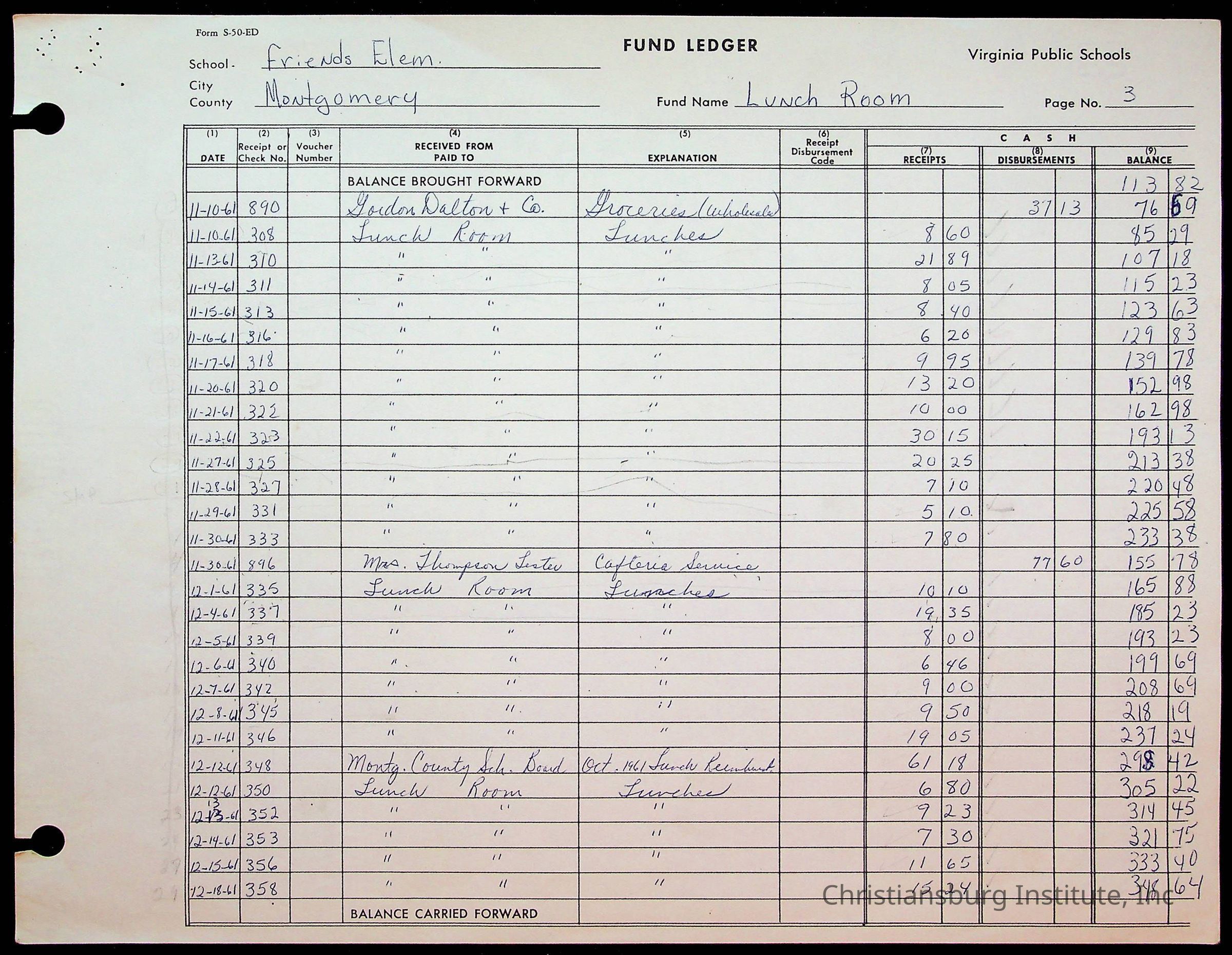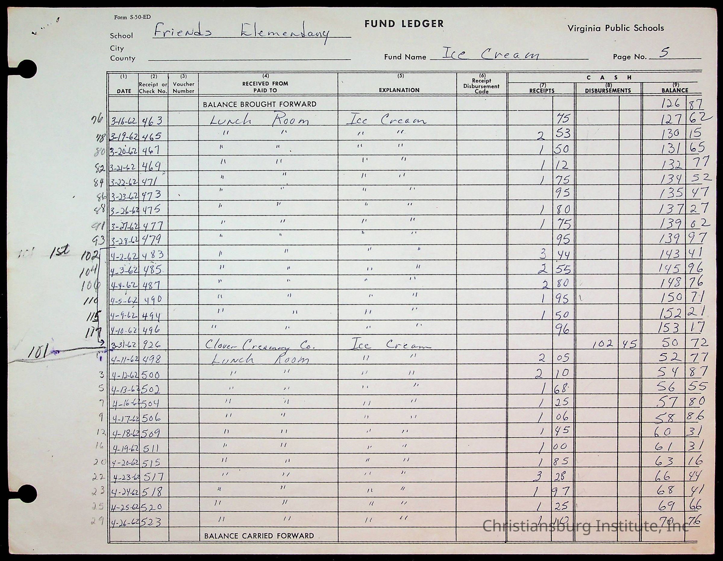 A fund ledger that recorded expenses from the lunch room at Friends Elementary School from 1961-1962.Collection