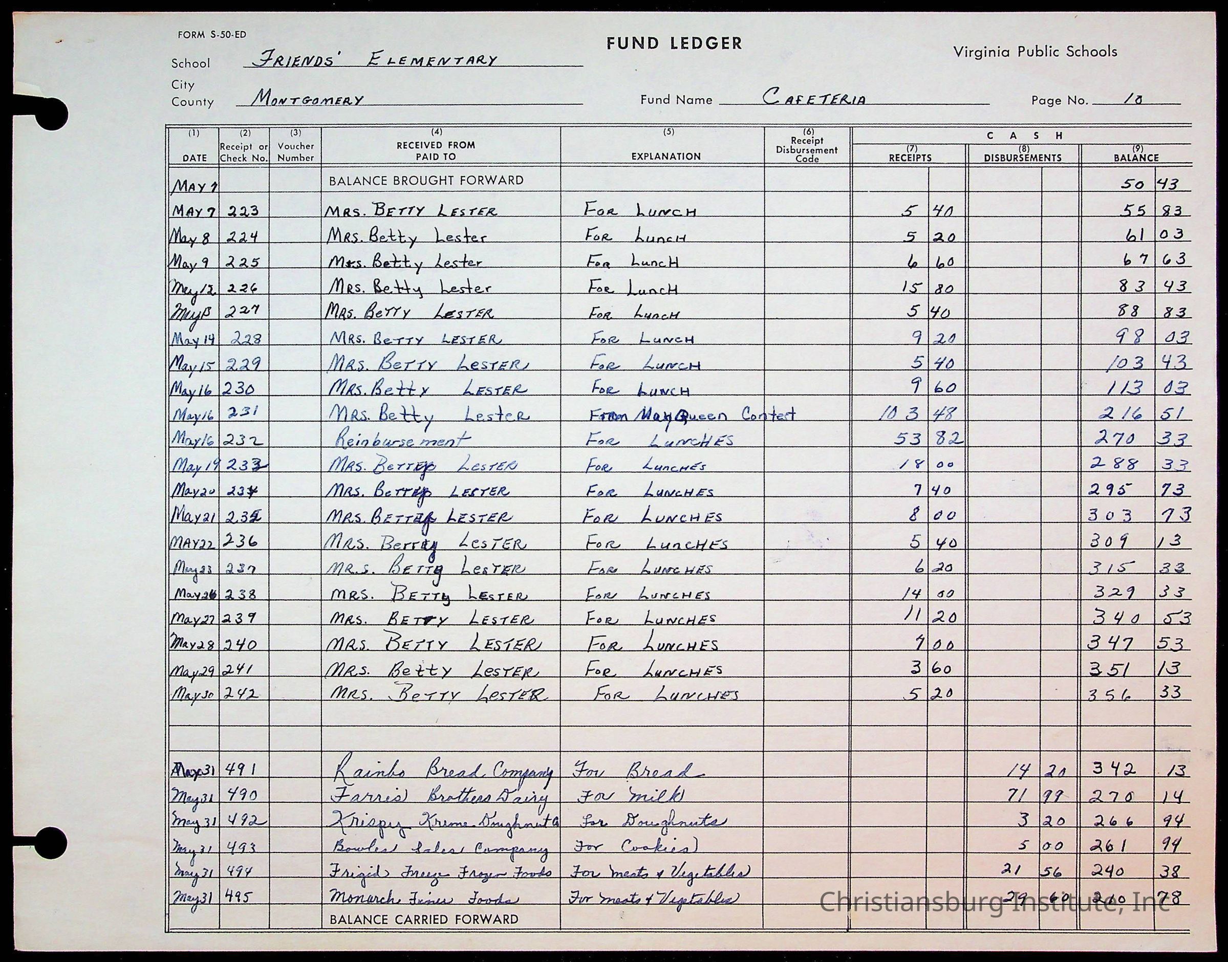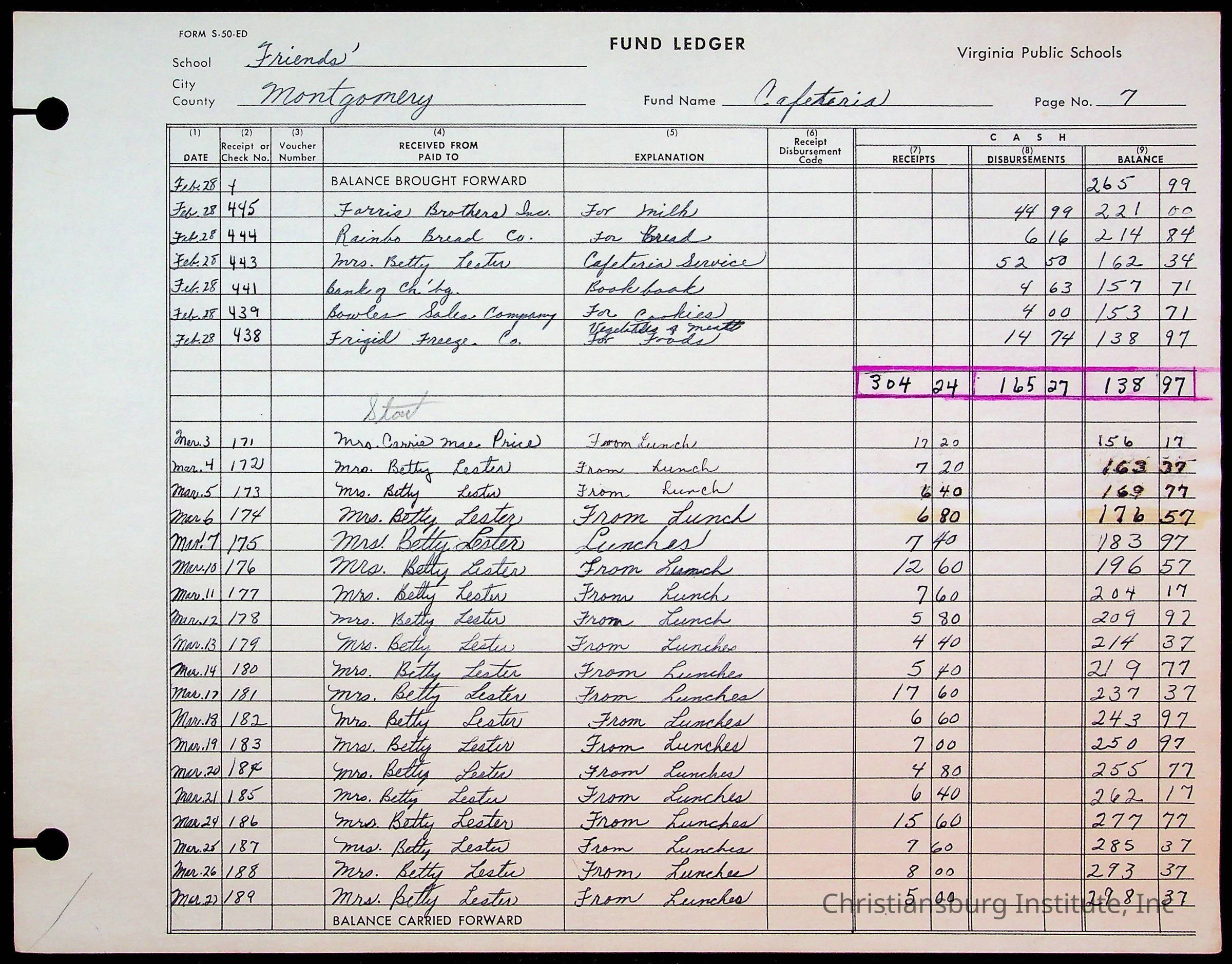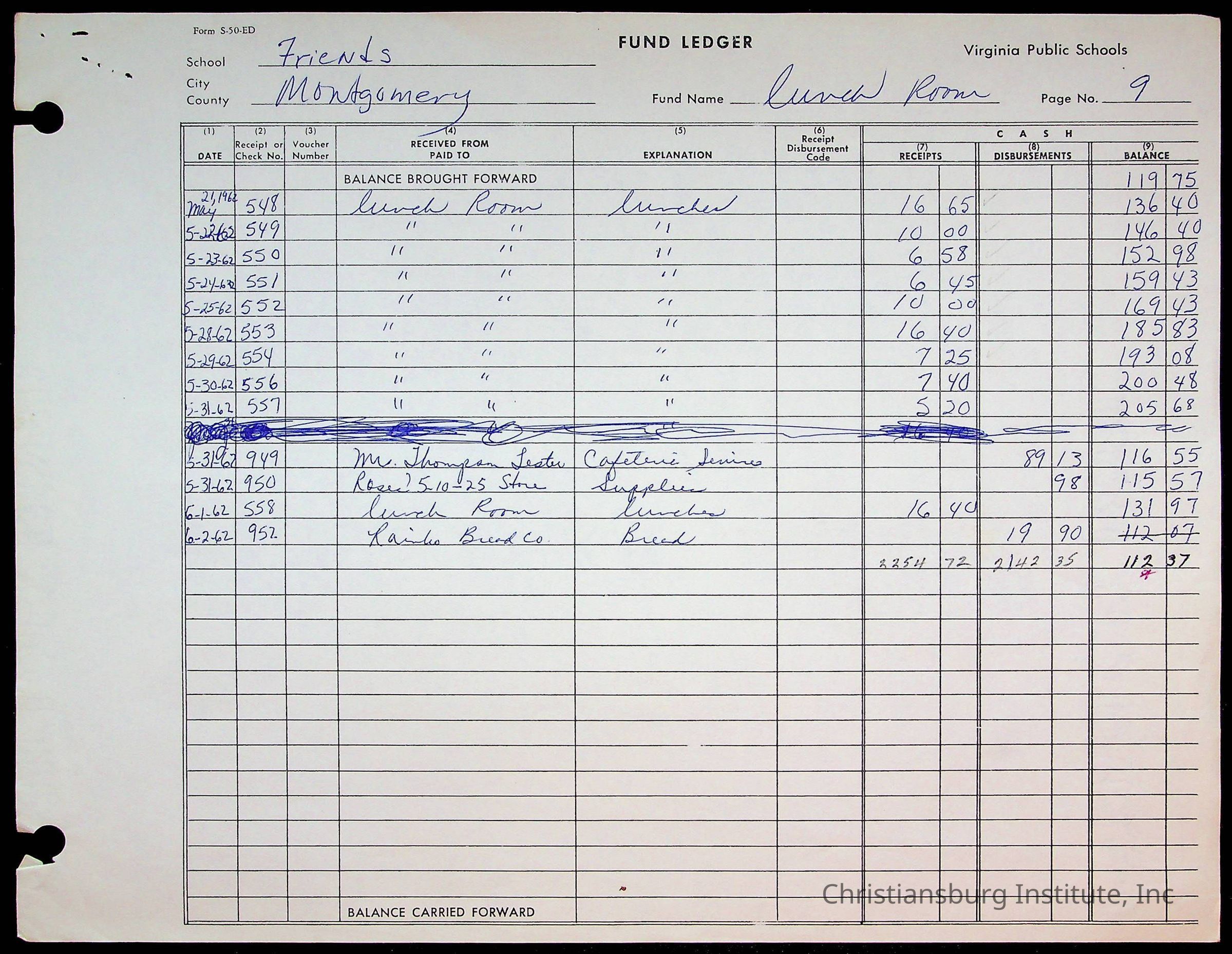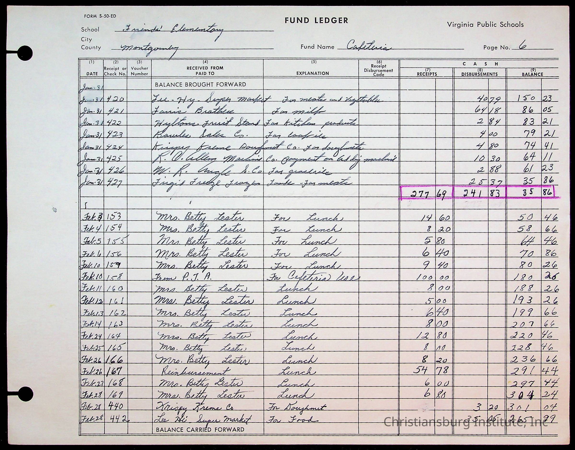 A fund ledger that recorded expenses from the lunch room at Friends Elementary School from 1961-1962.Collection