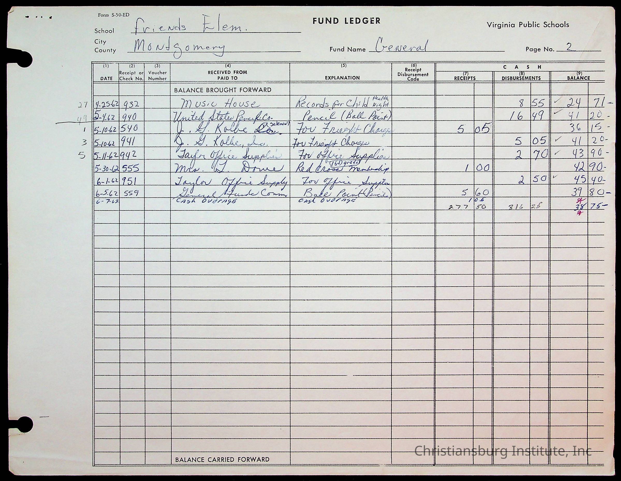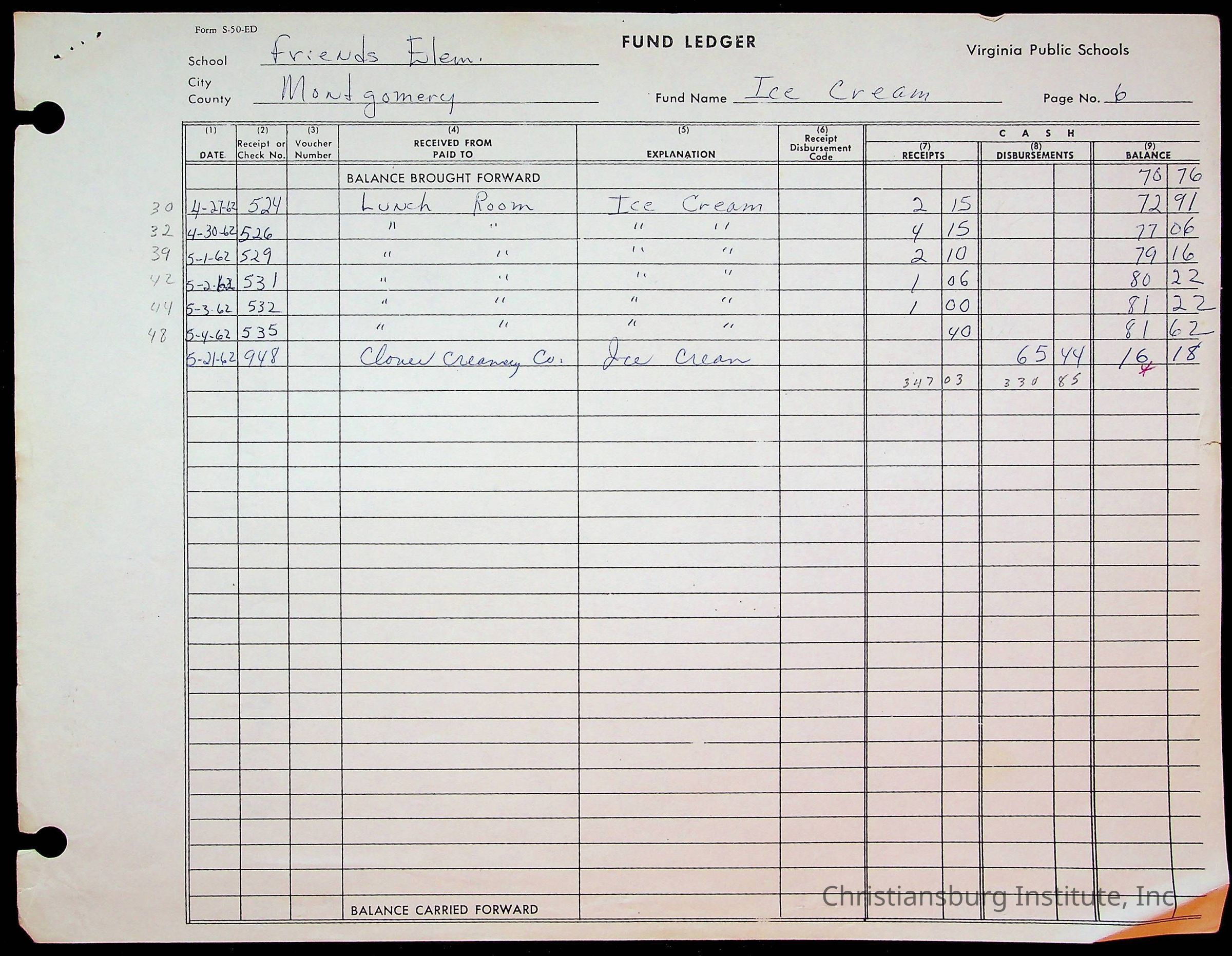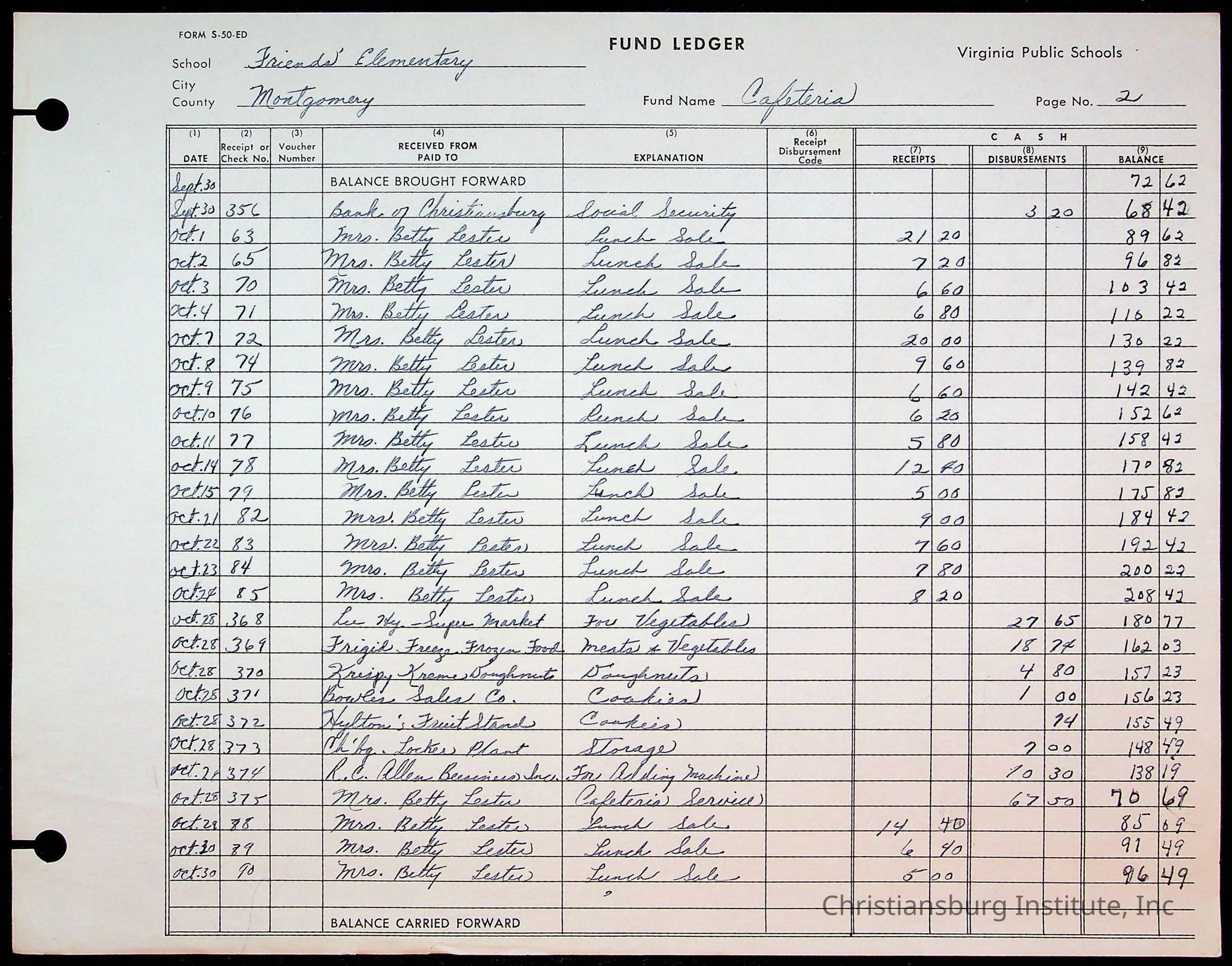 Friends Elementary Fund Ledger (Lunch Room), 1961-1962Tags