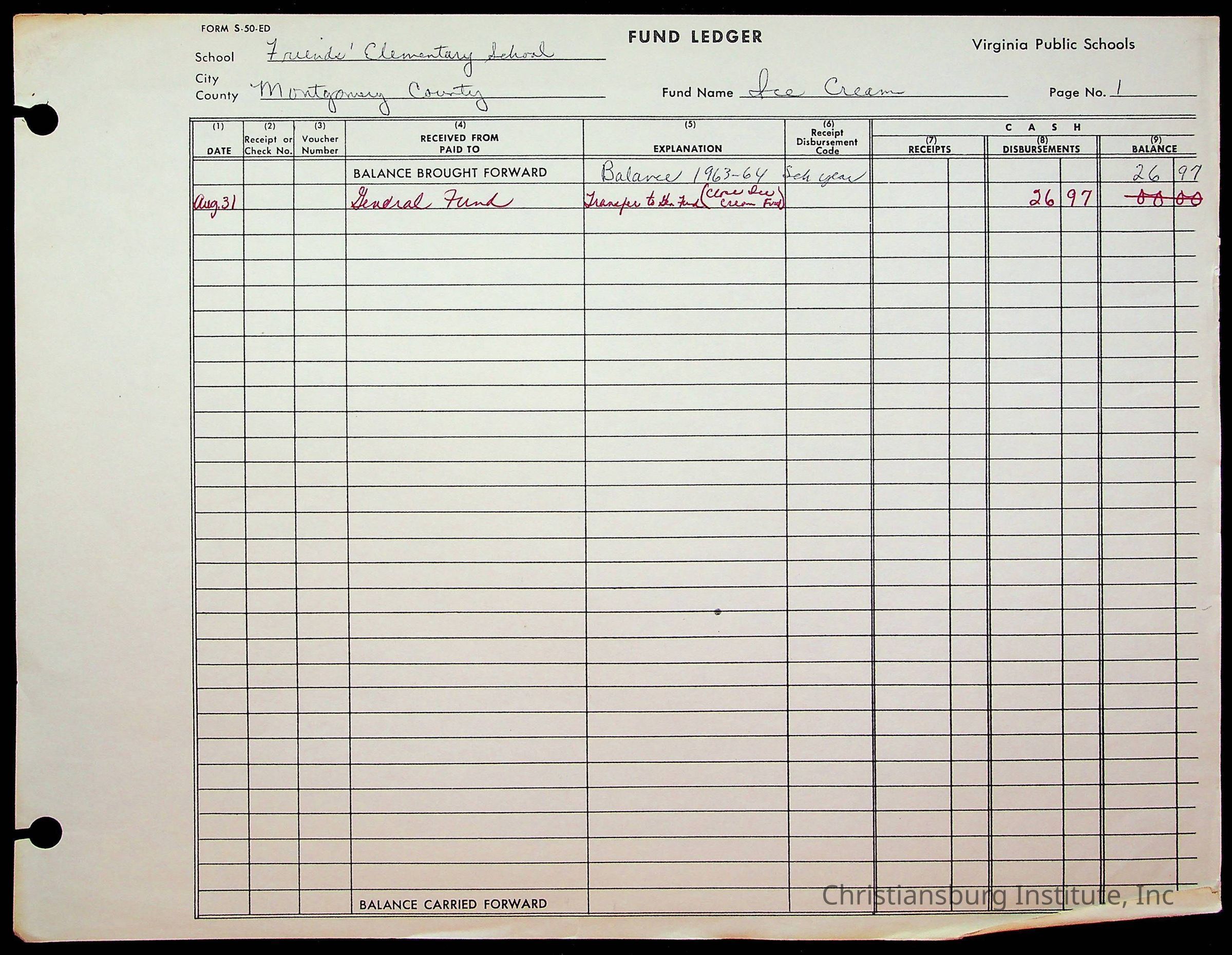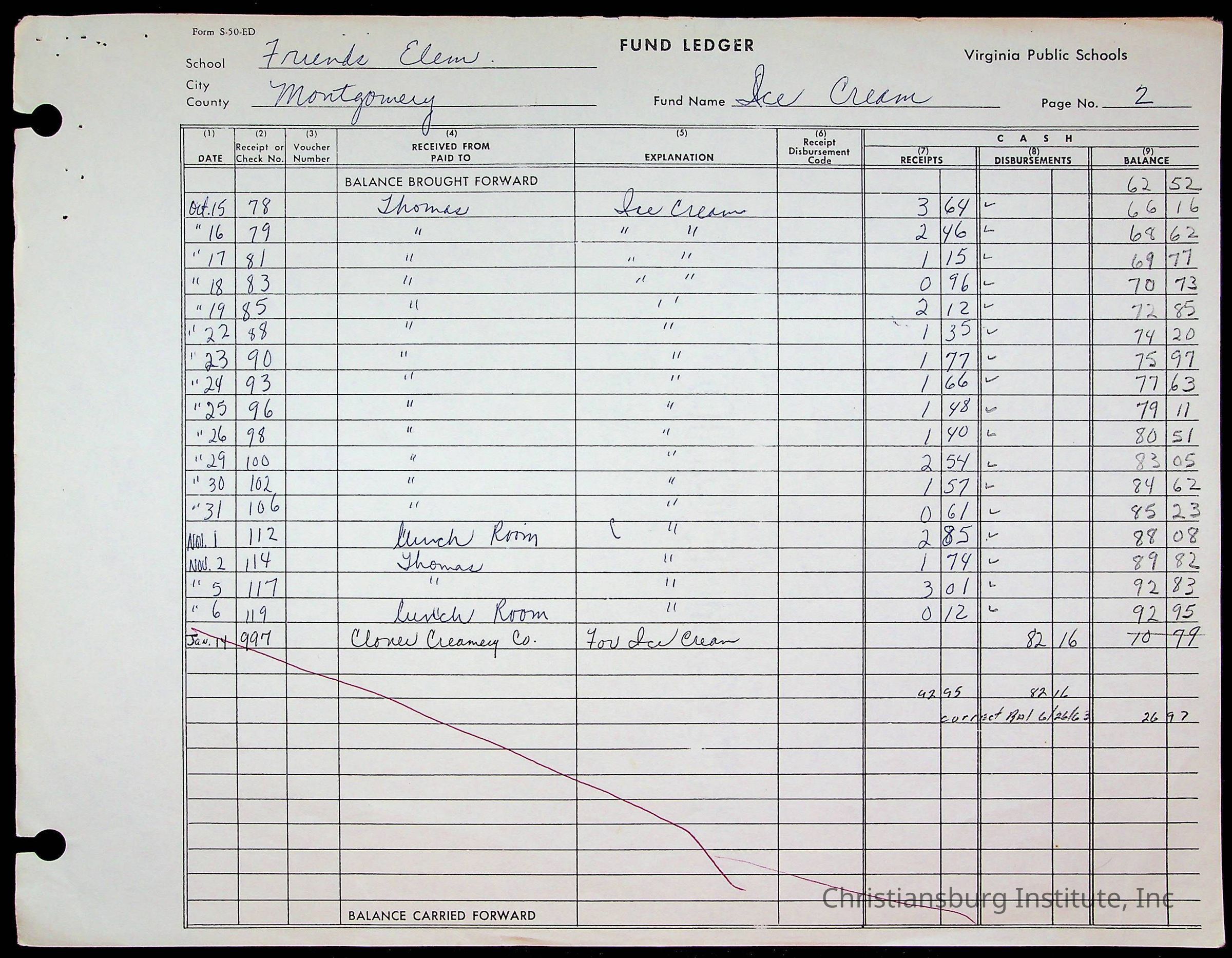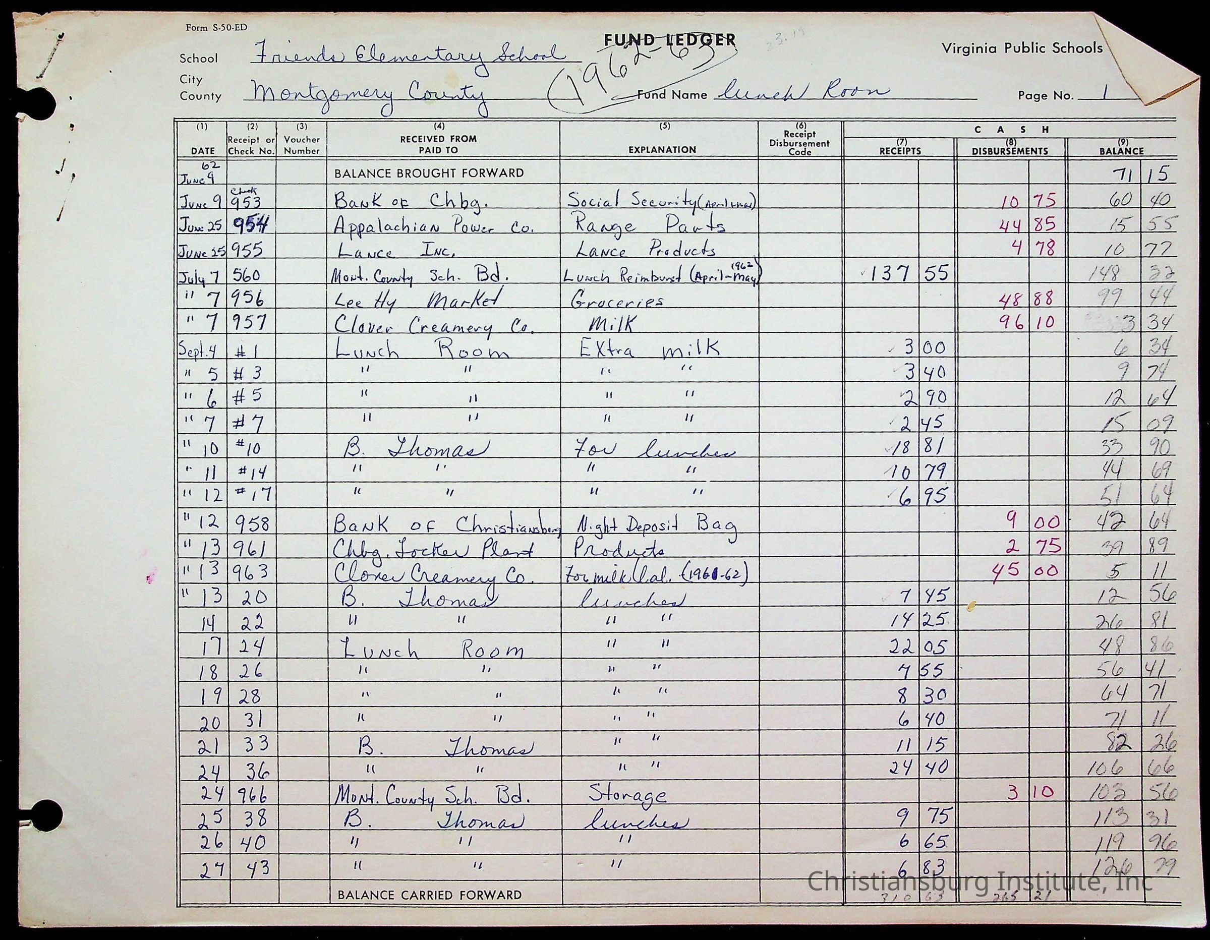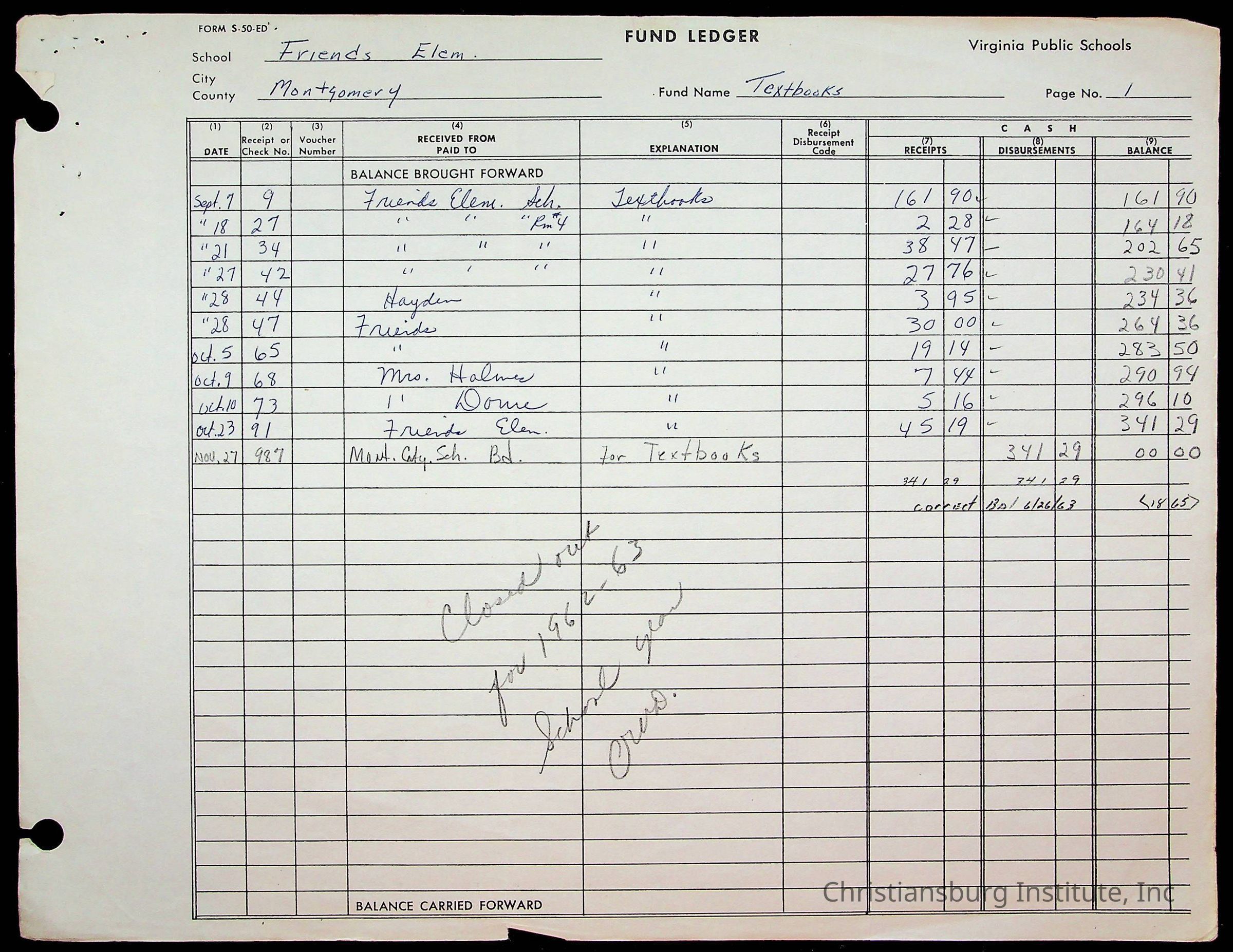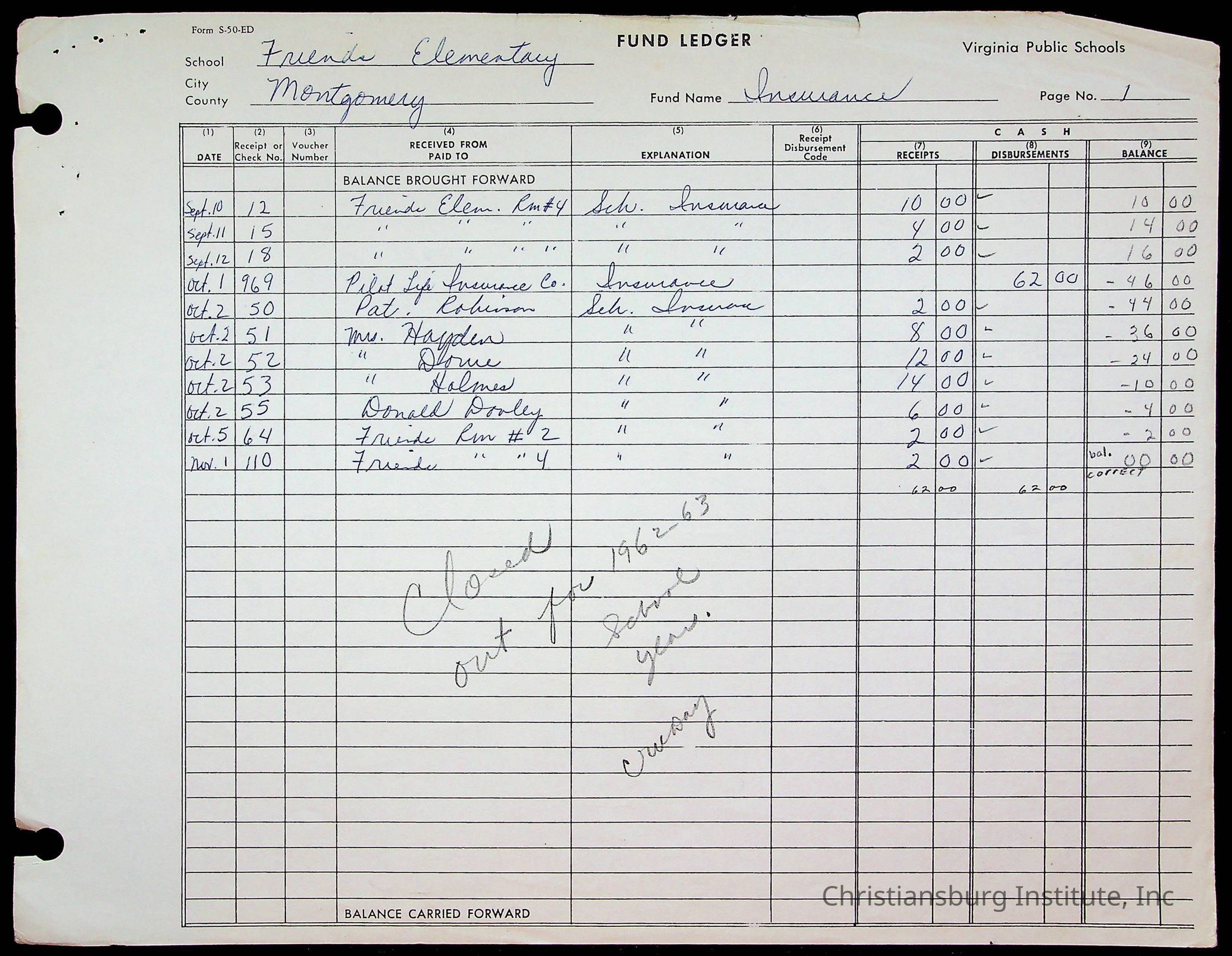 A fund ledger that recorded expenses from Friends Elementary School from 1962-1963.Collection