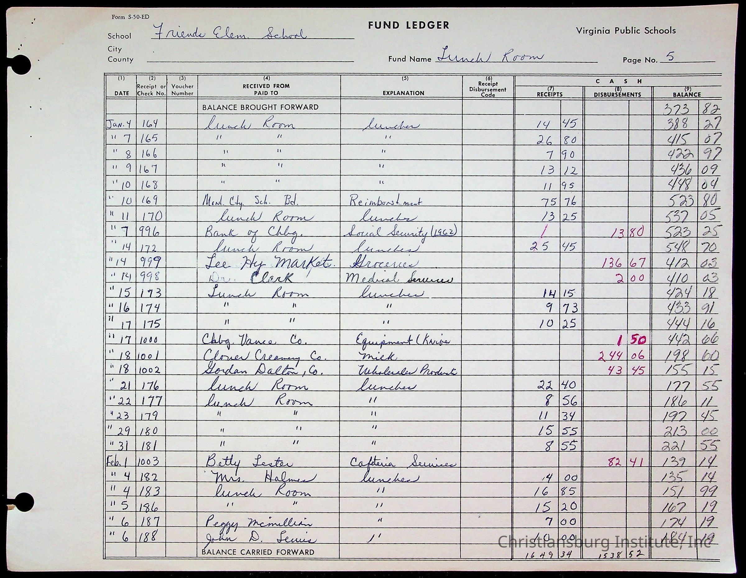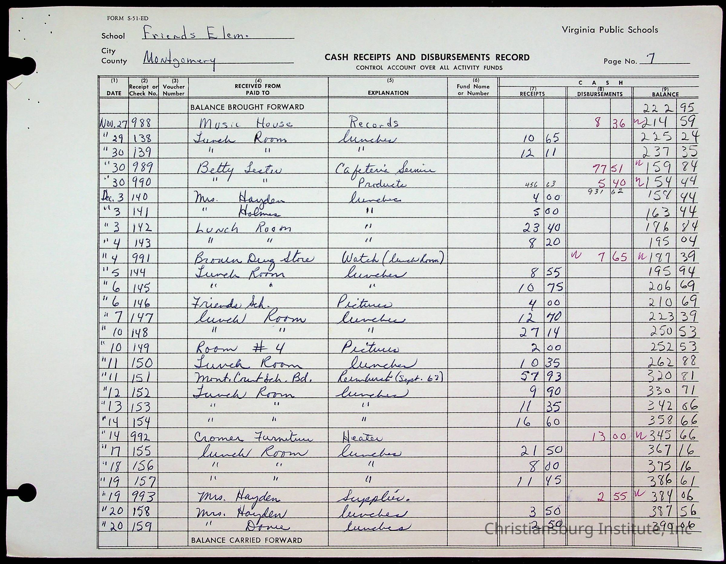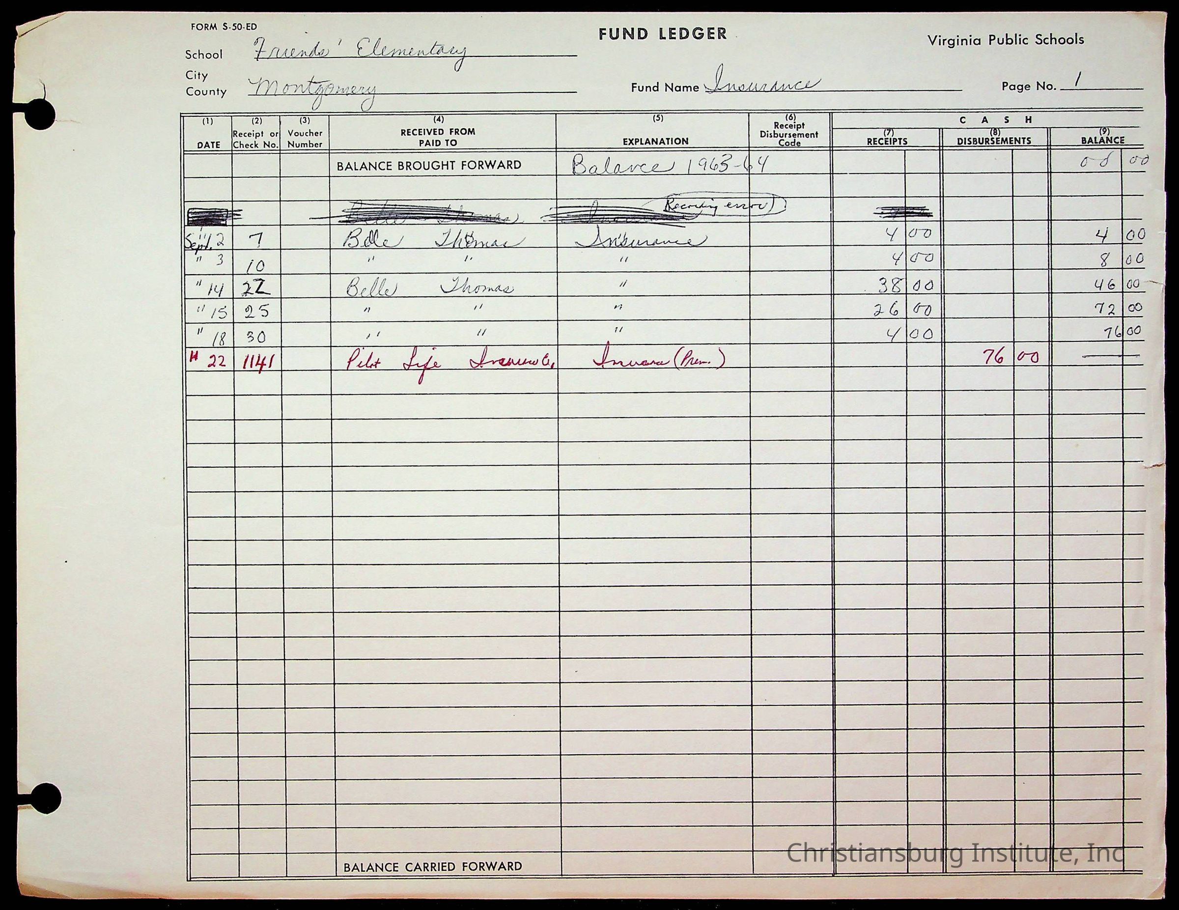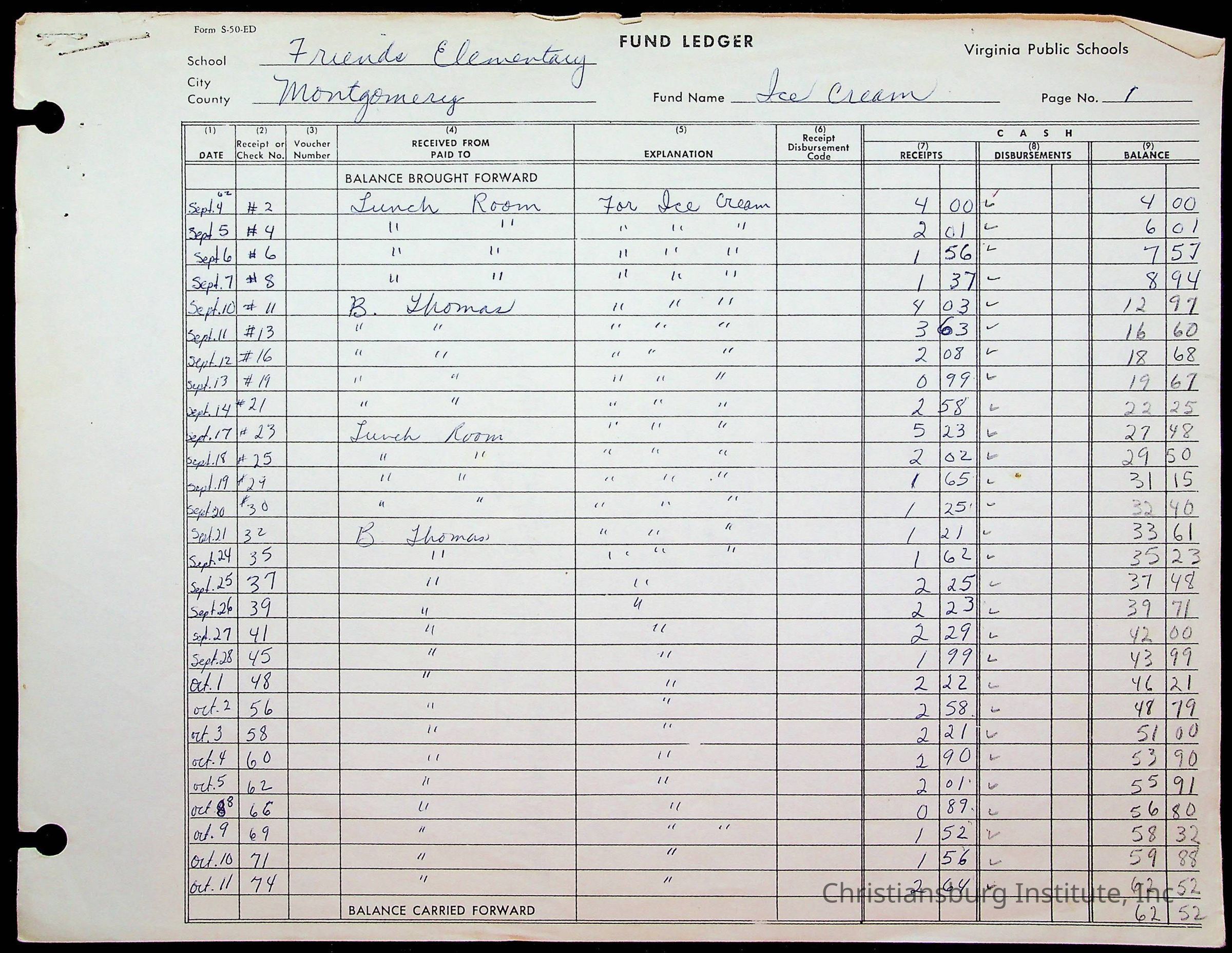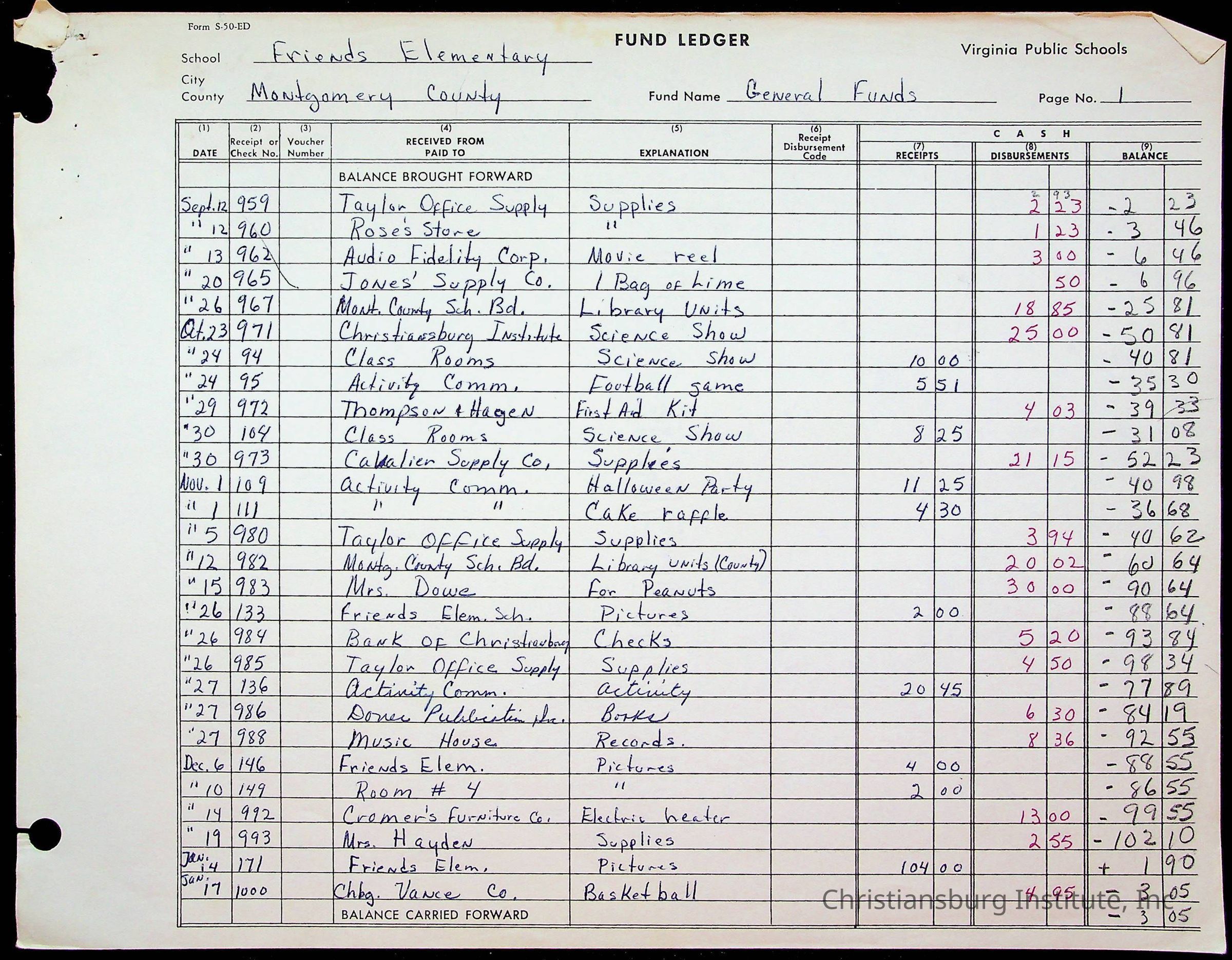 A fund ledger that recorded expenses from Friends Elementary School from 1962-1963.Collection