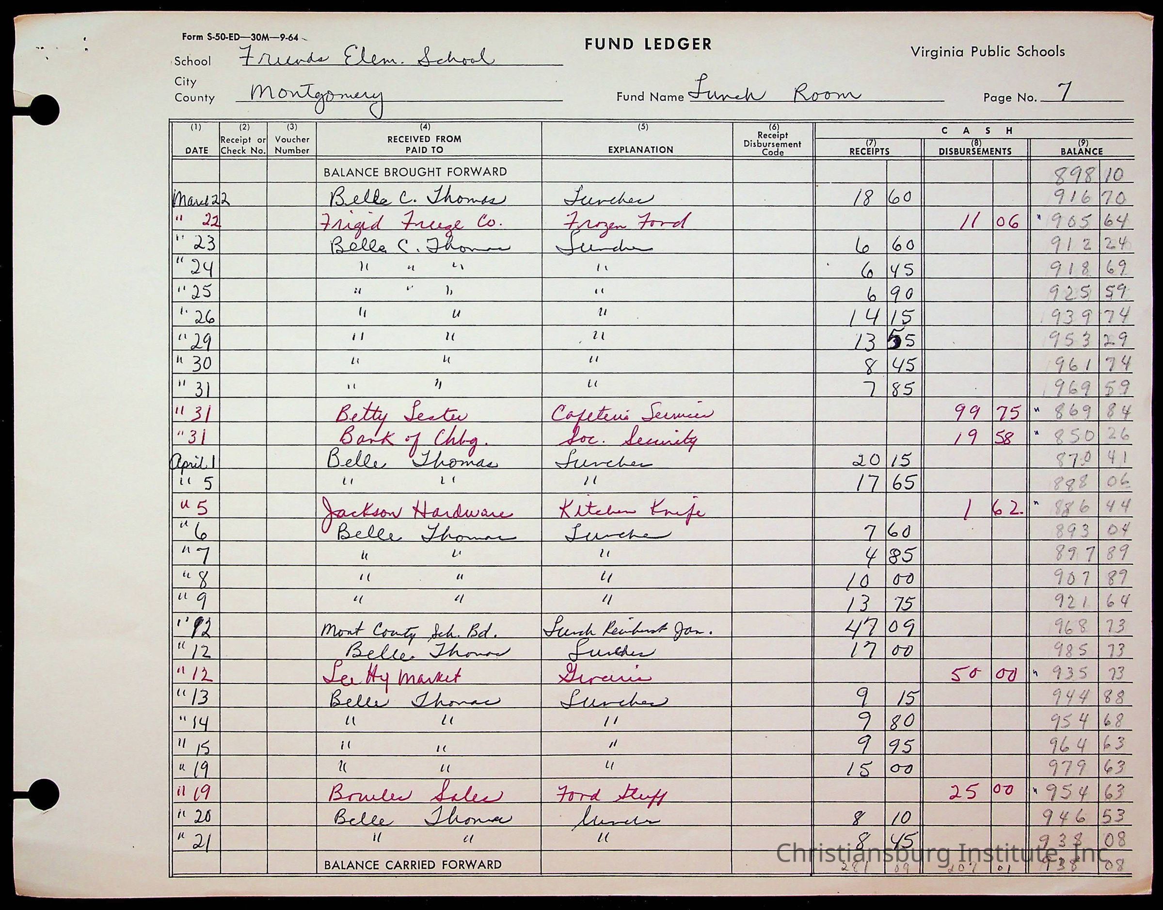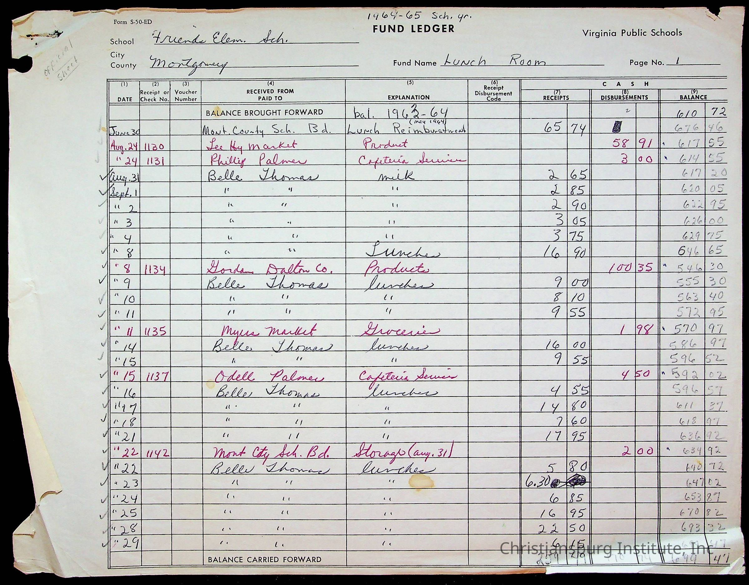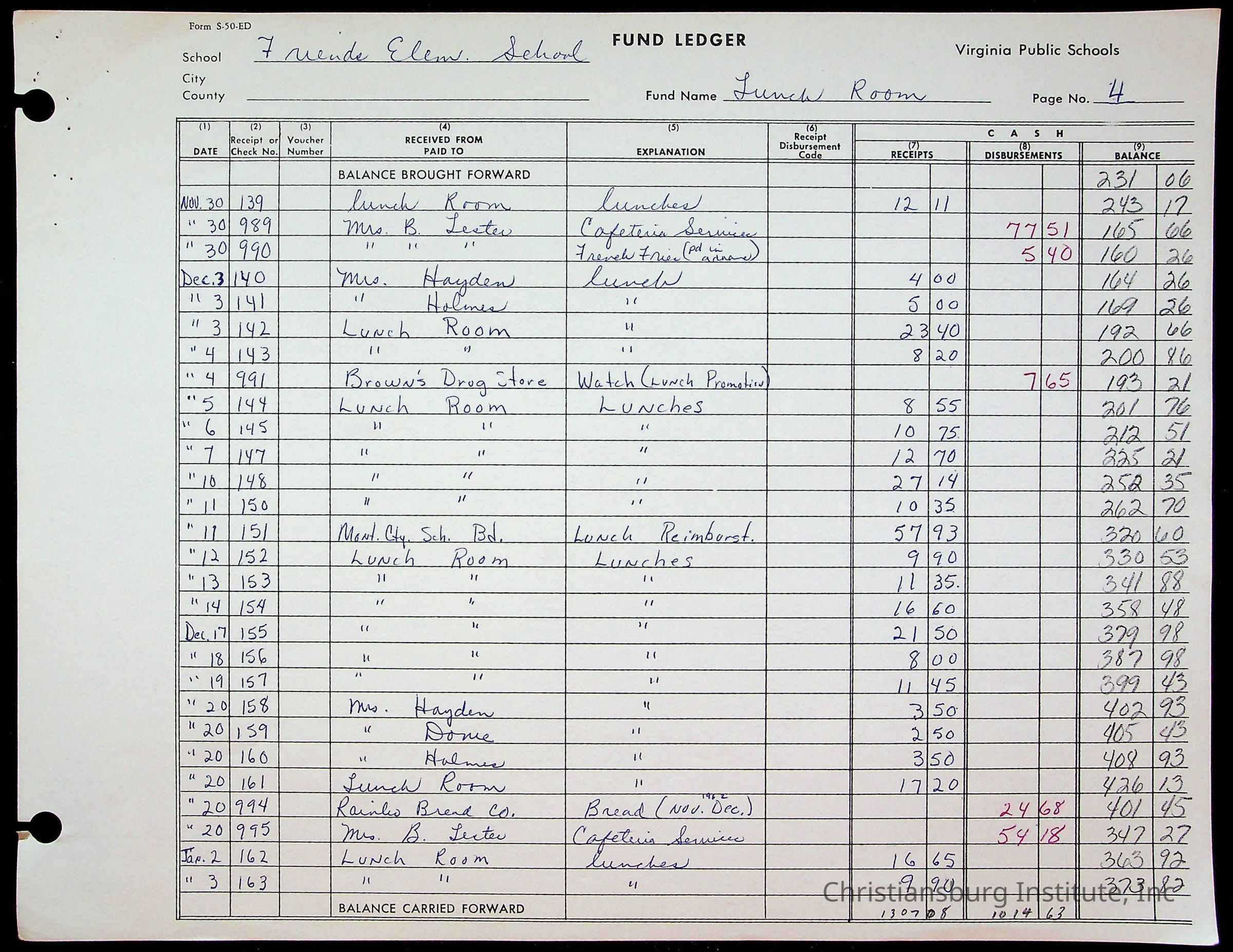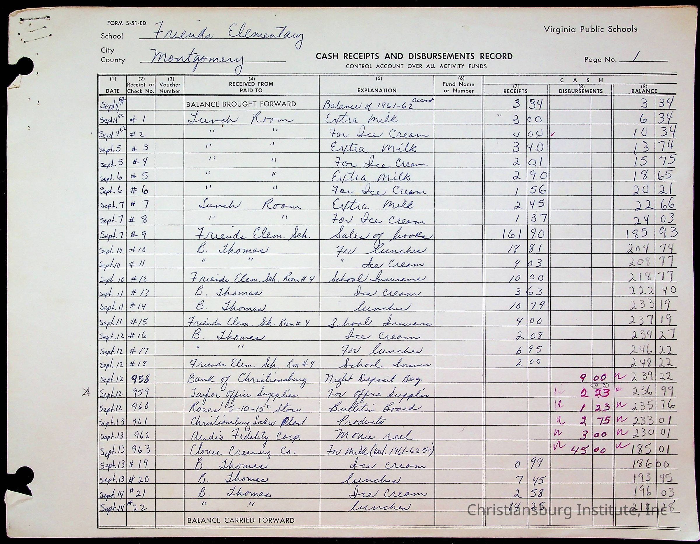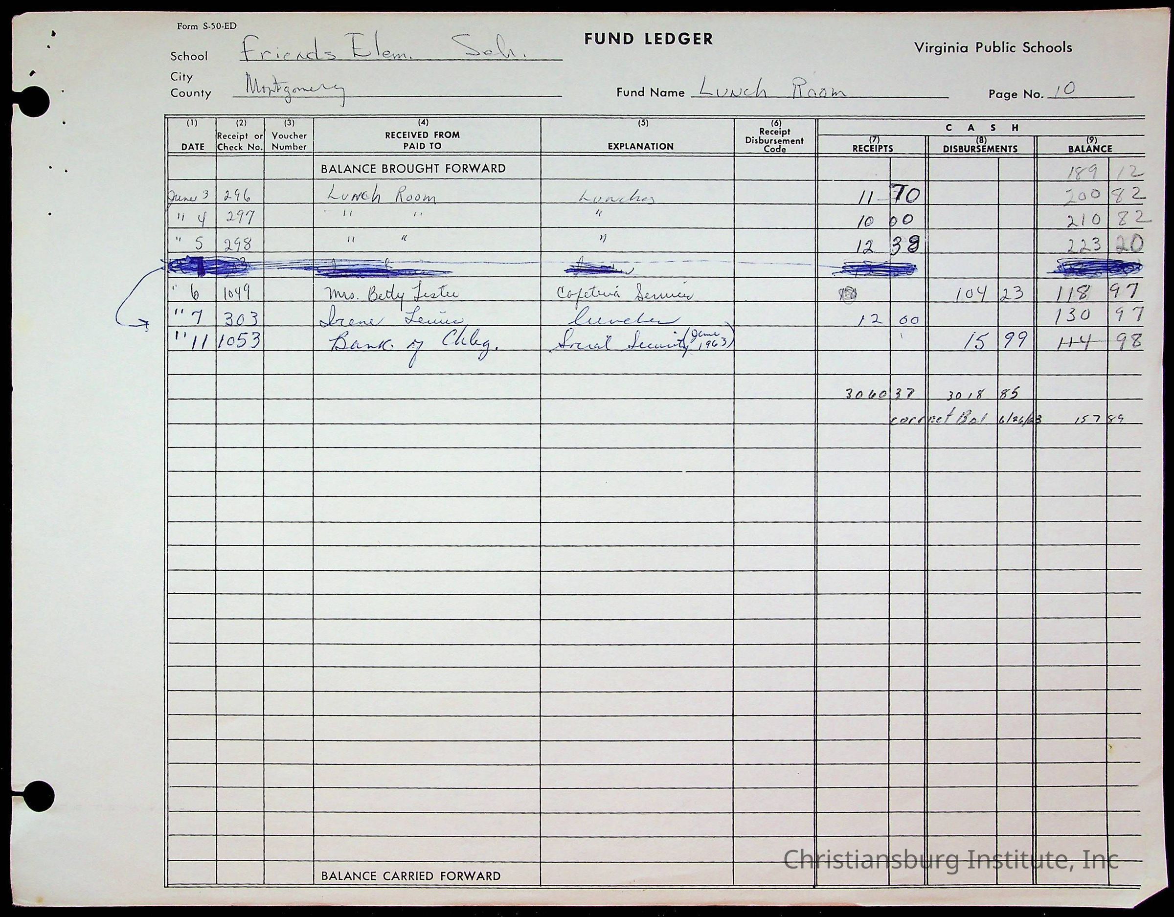 A fund ledger that recorded expenses from Friends Elementary School from 1962-1963.Collection
