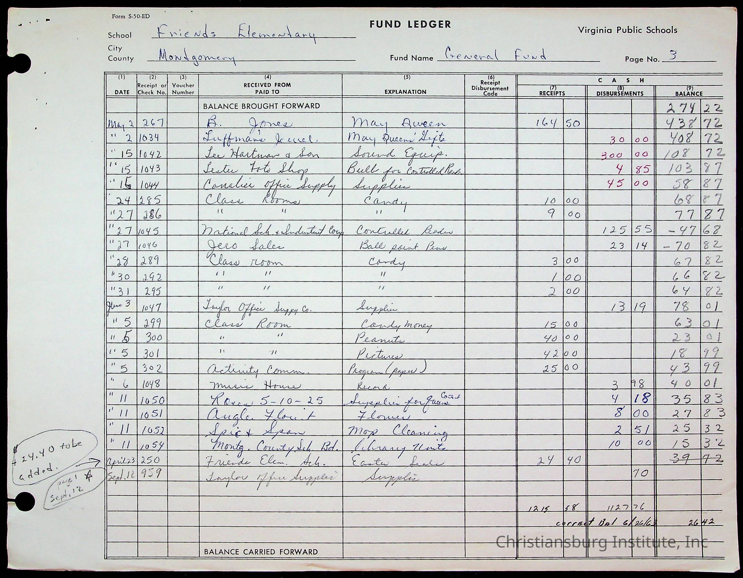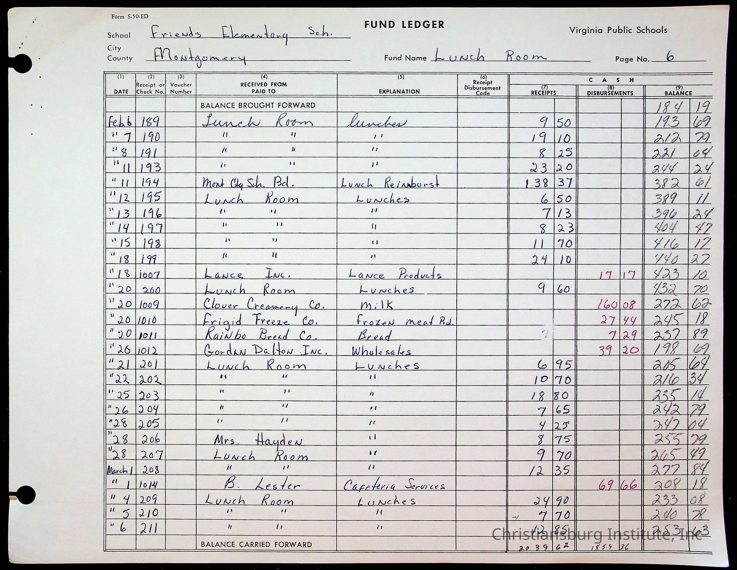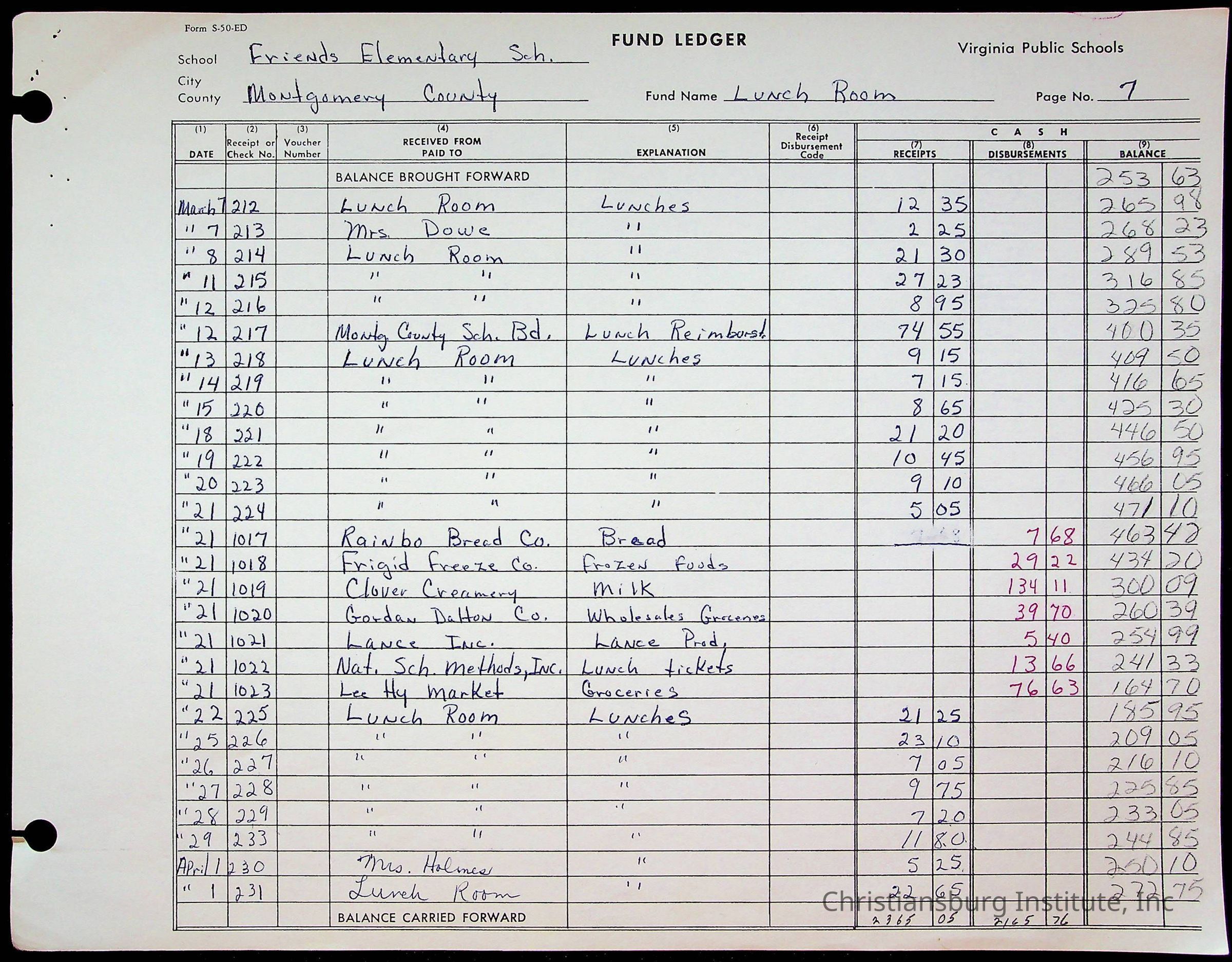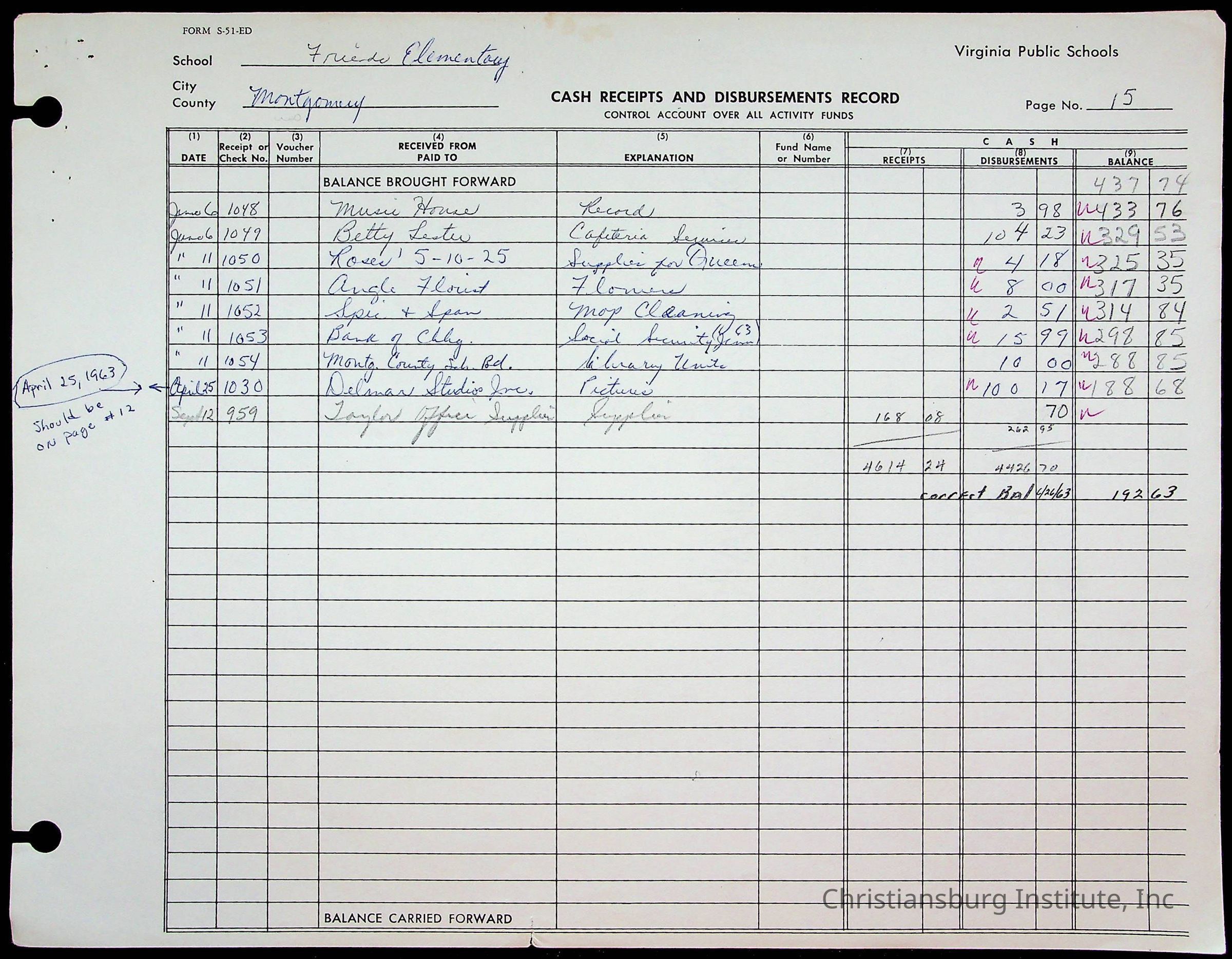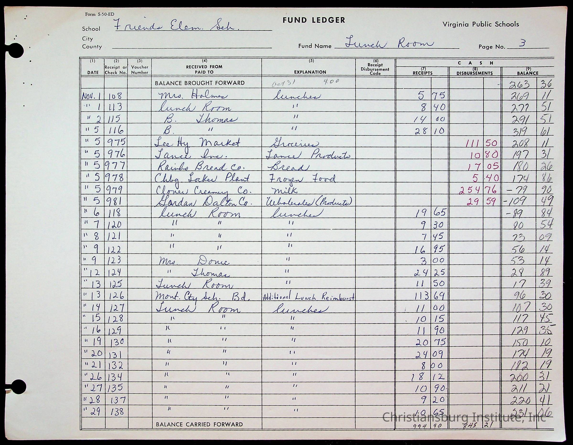 A fund ledger that recorded expenses from Friends Elementary School from 1962-1963.Collection