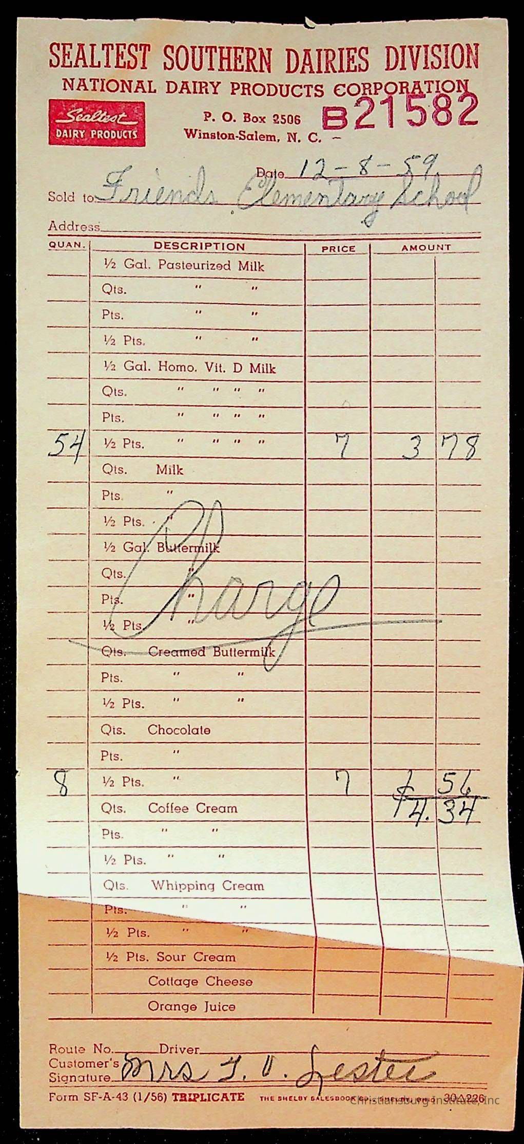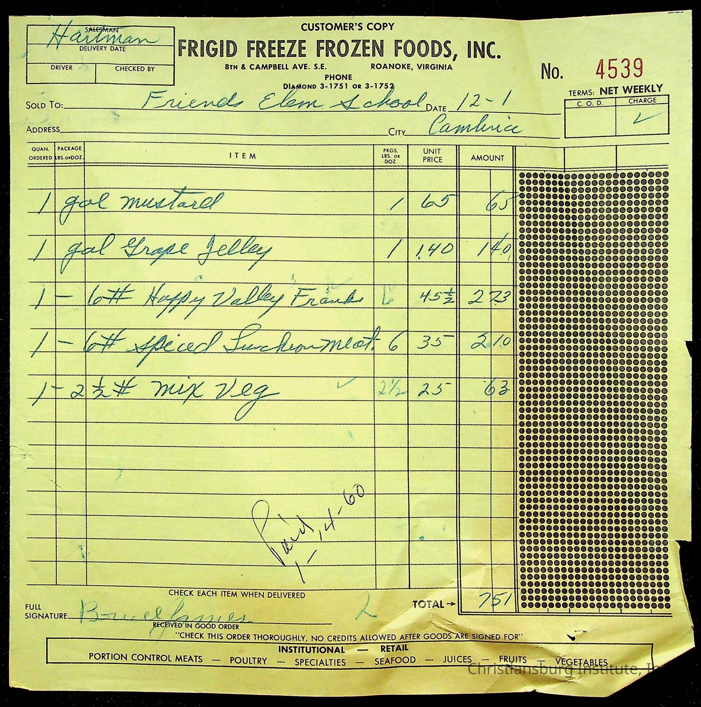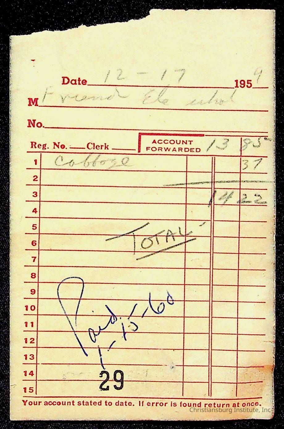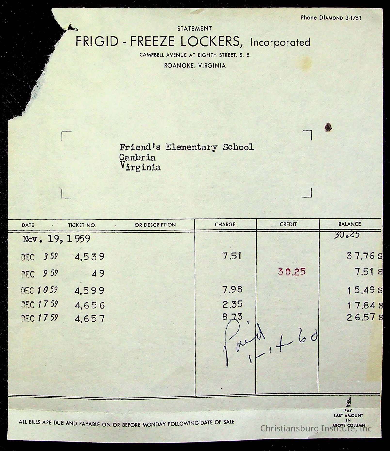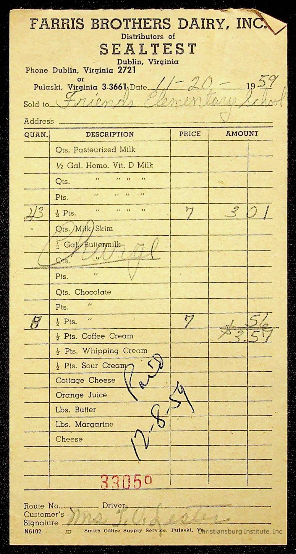 An archive of various receipts and bills for Friends Elementary School, circa 1950s-1960s.Collection