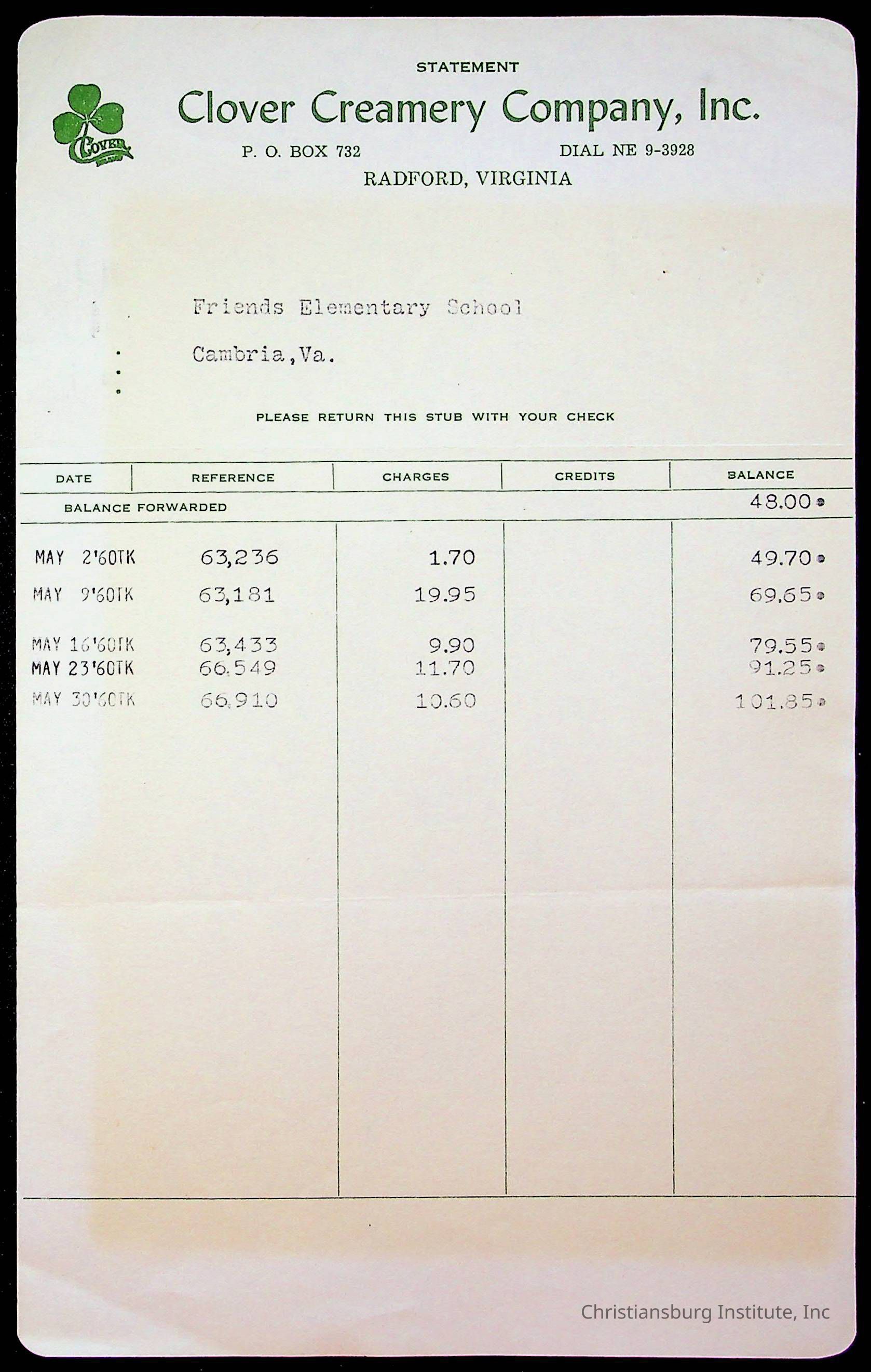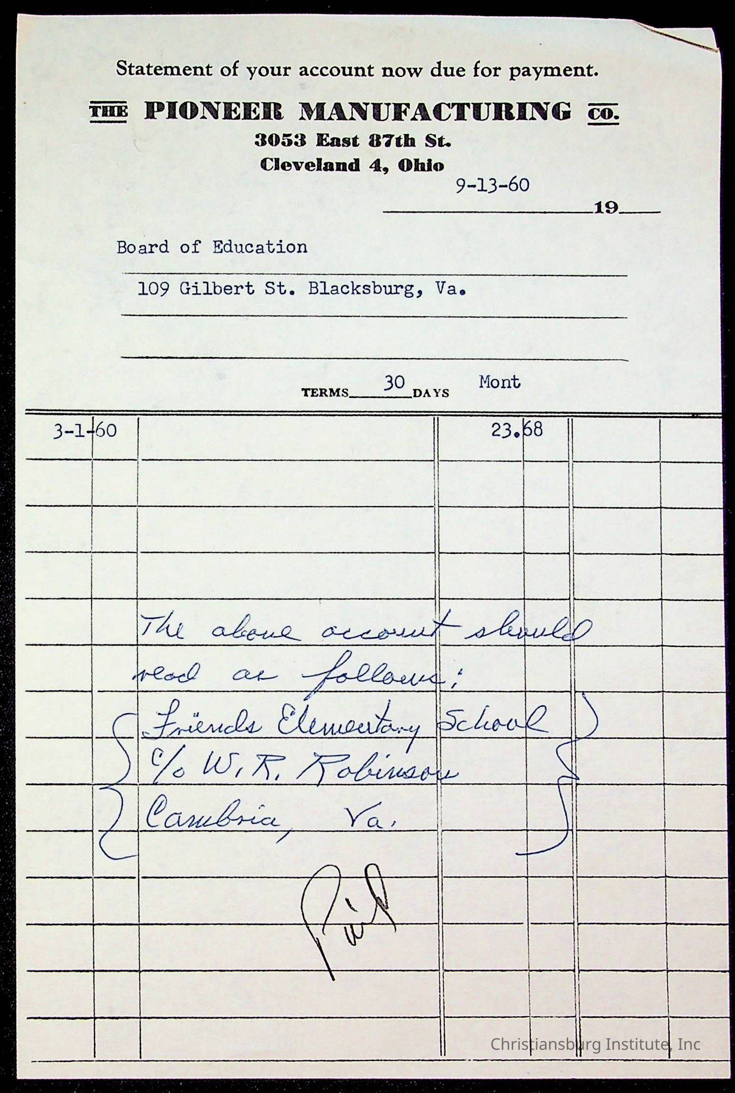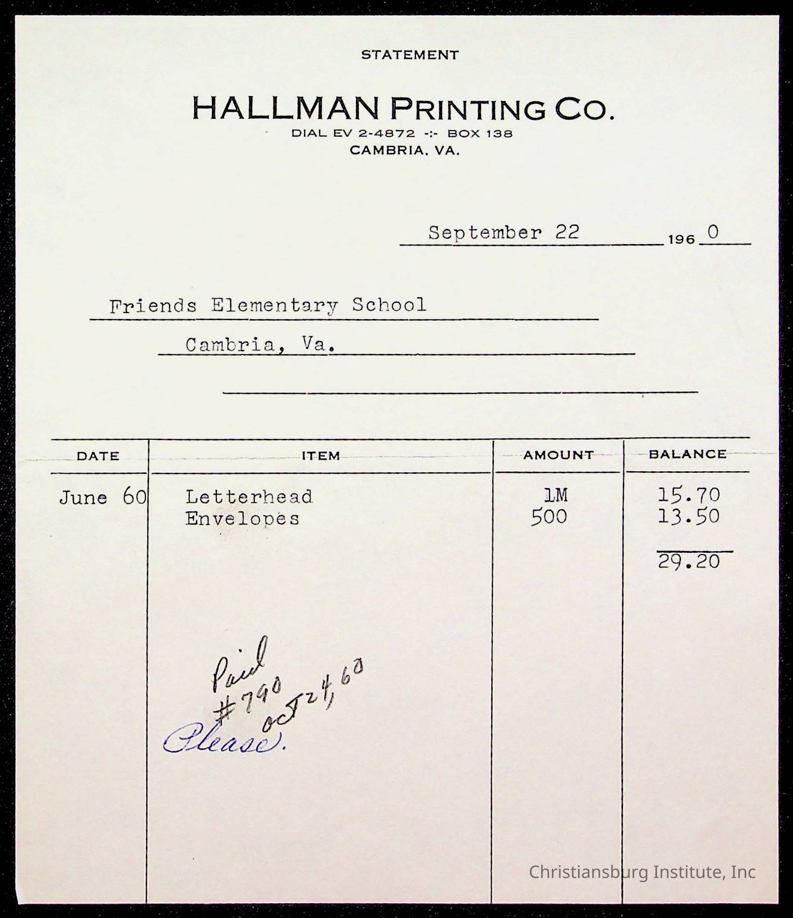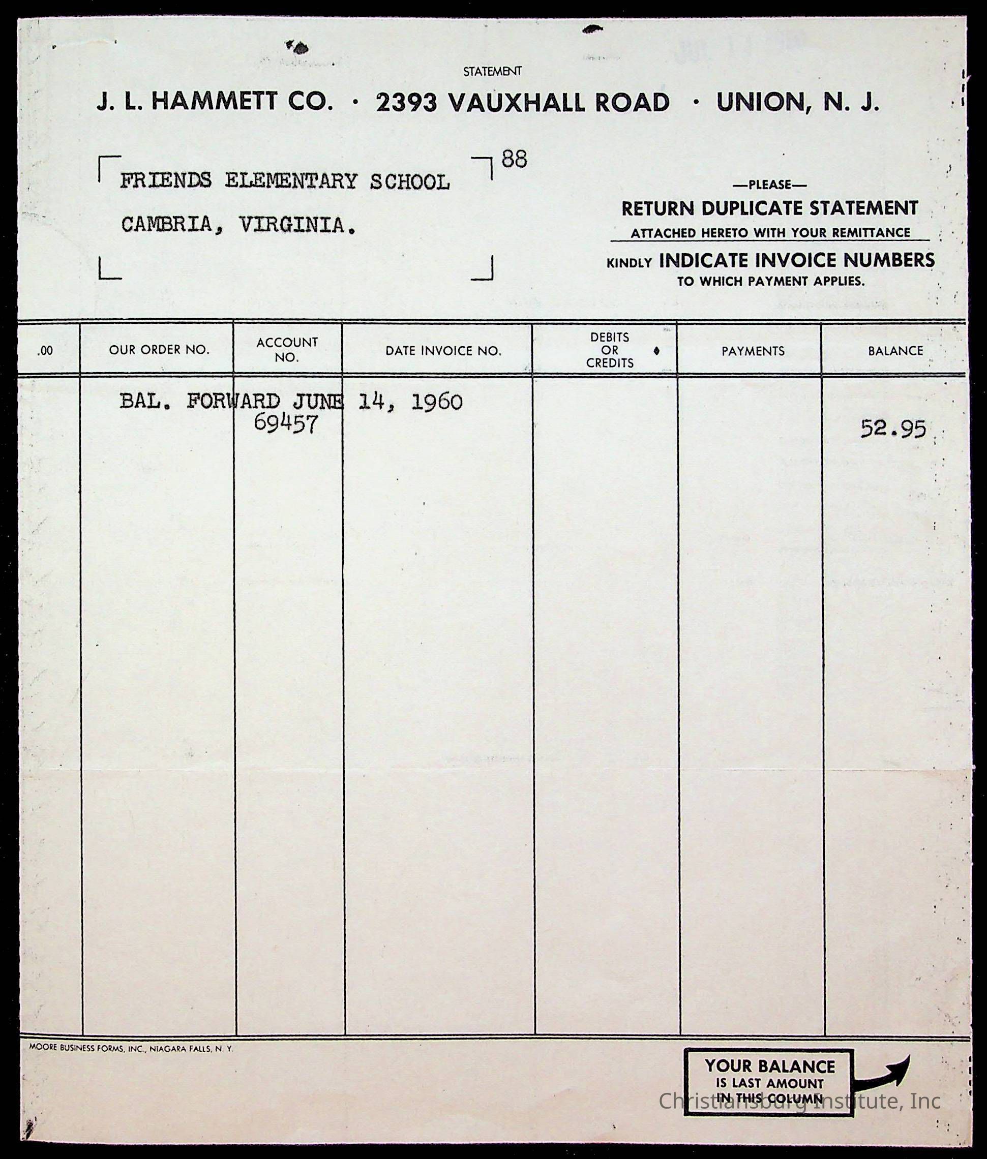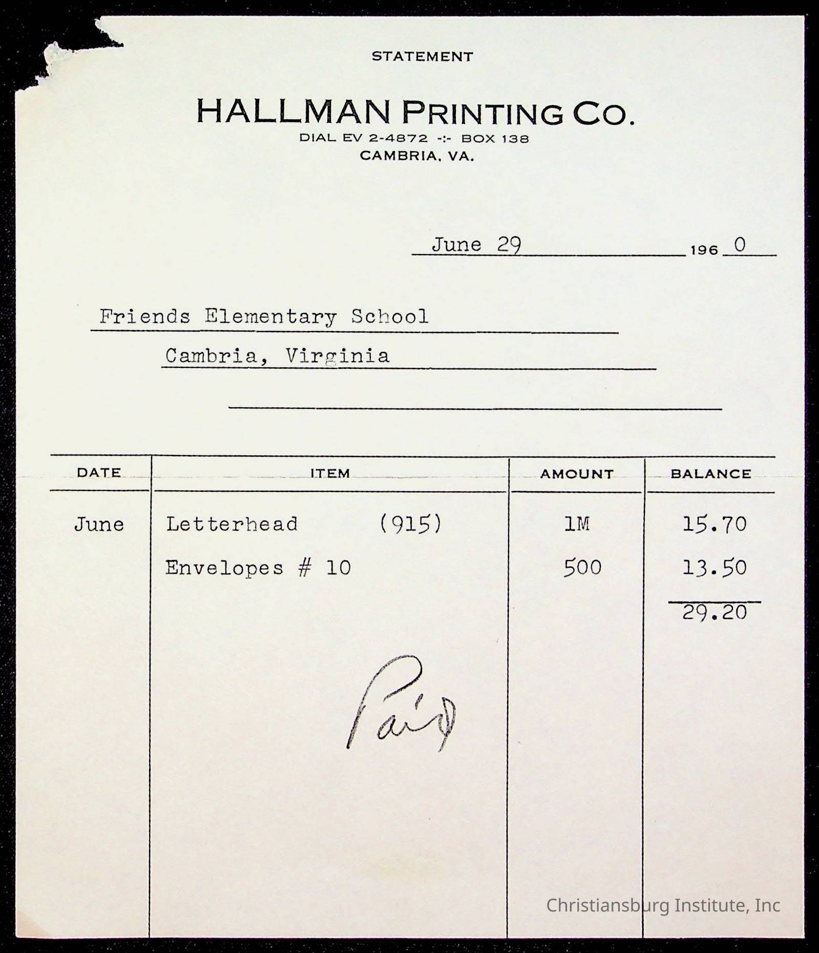 An archive of bills and receipts for Friends Elementary School from the 1959-1960 school year.Collection