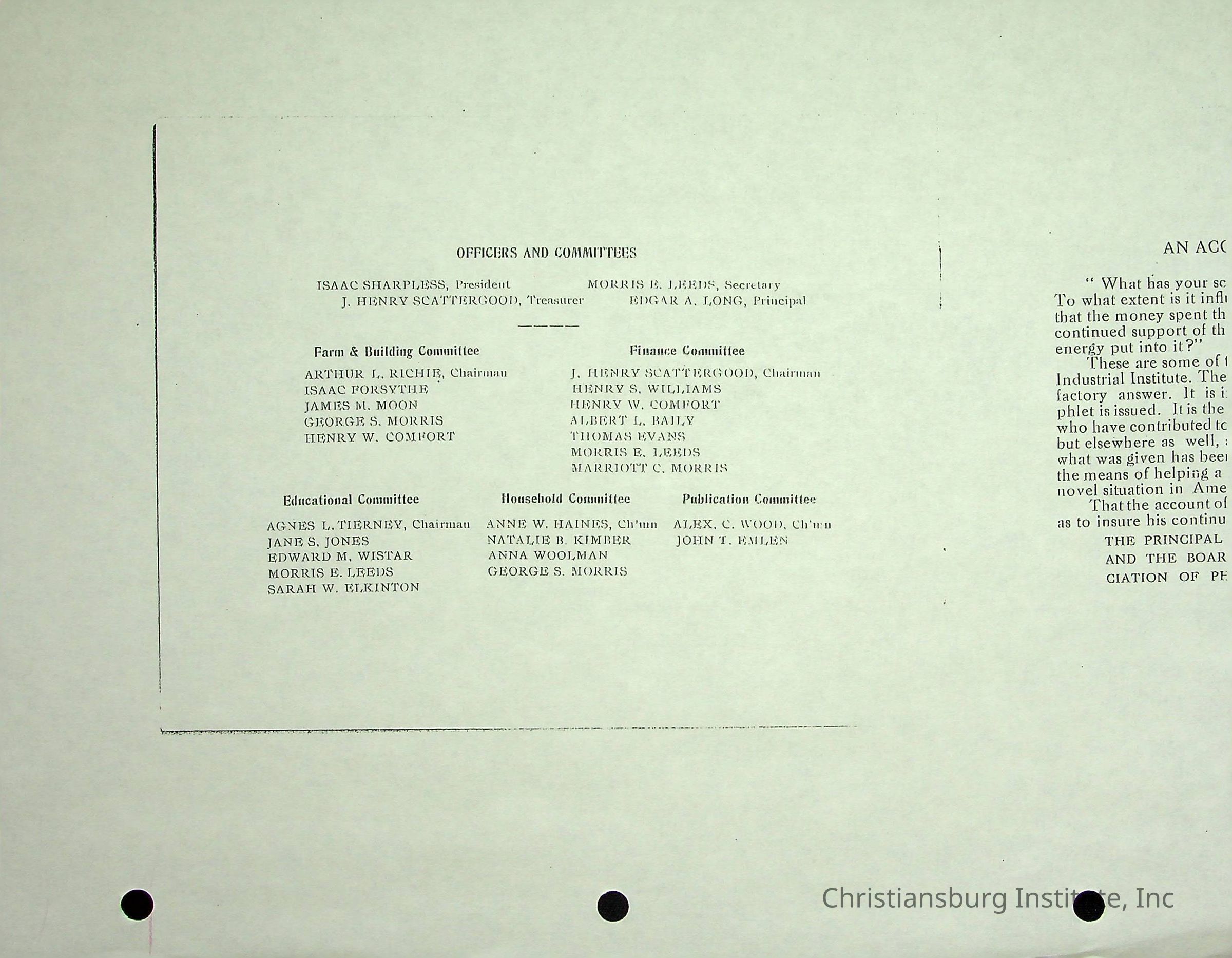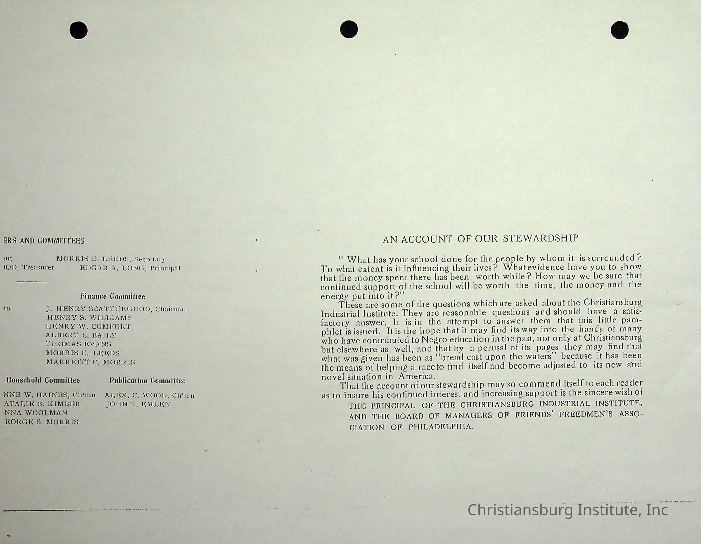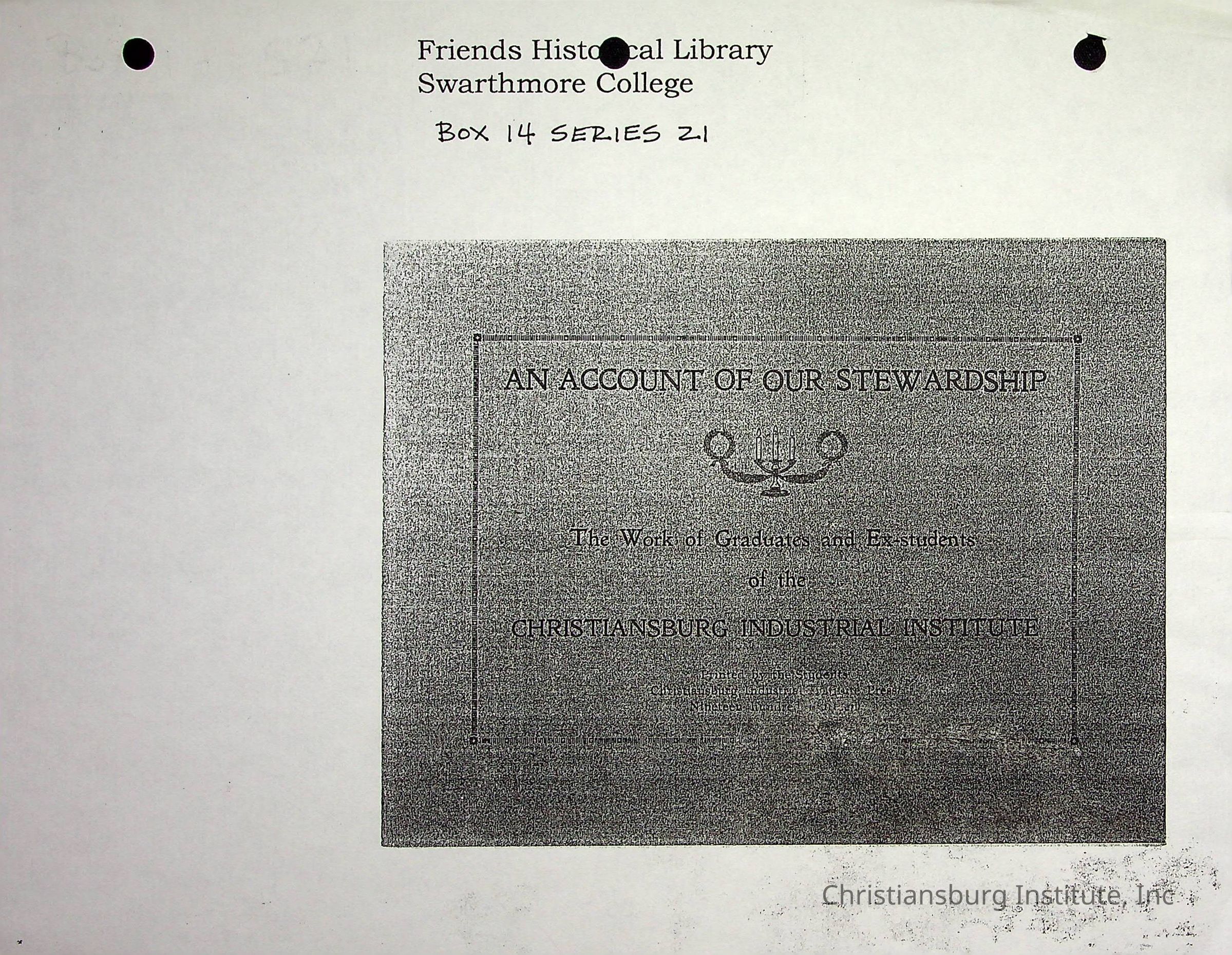 A photocopy version of the Friends Freedman's Association, An Account of our Stewardship dated 1914. This publication was made by graduates of Christiansburg Industrial Institute and the Friends Freedman's Association.Collection