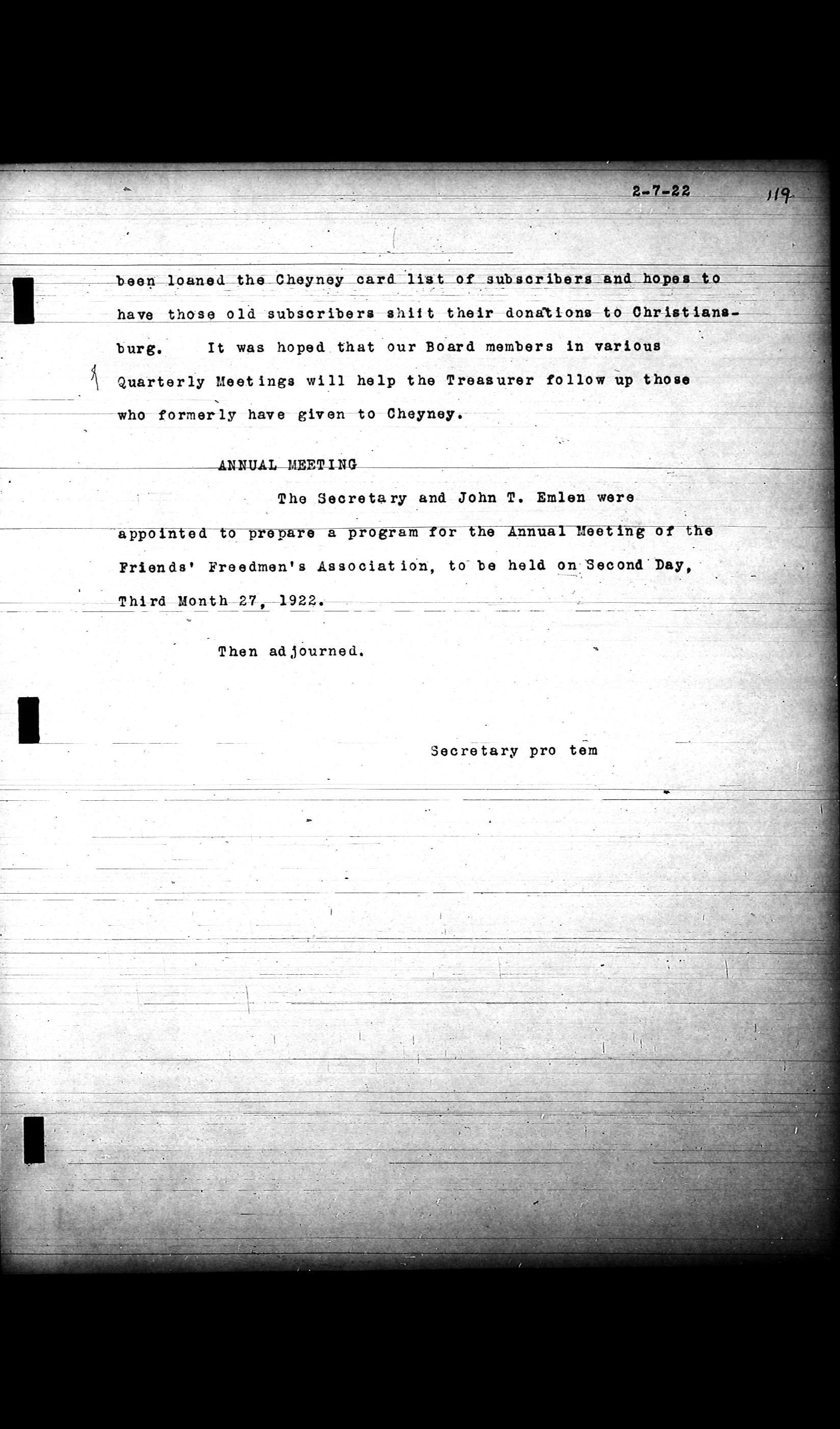 A series of digitally scanned photocopies of Friends Freedman's Association: Executive Committee Minutes 1920-1932 on a DVD disk. Originally scanned on April 8th, 1974 by Princeton Datafilm Inc.Collection