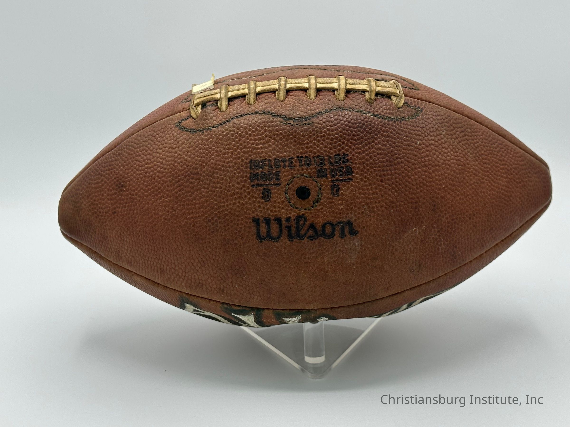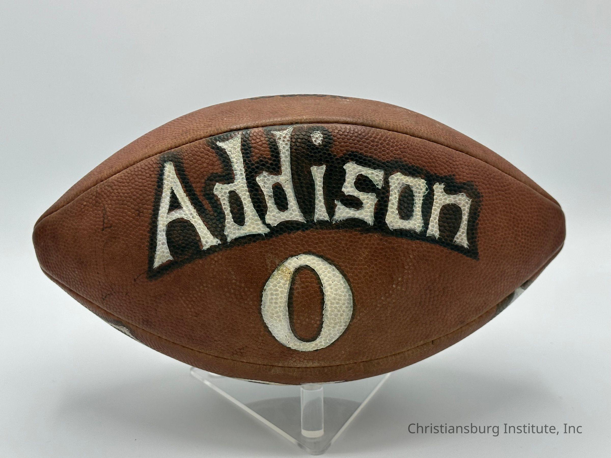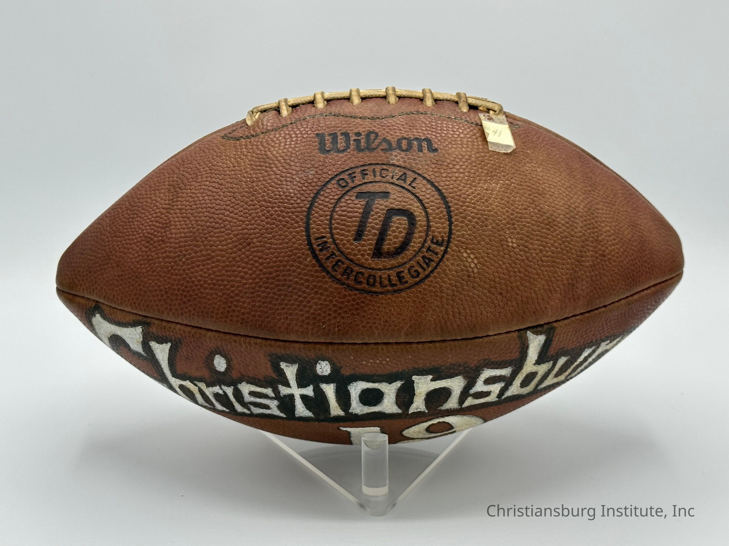 A football with a game score painted on it, Christiansburg Institute score 19 points and Lucy Addison High School score 0 points, undated.