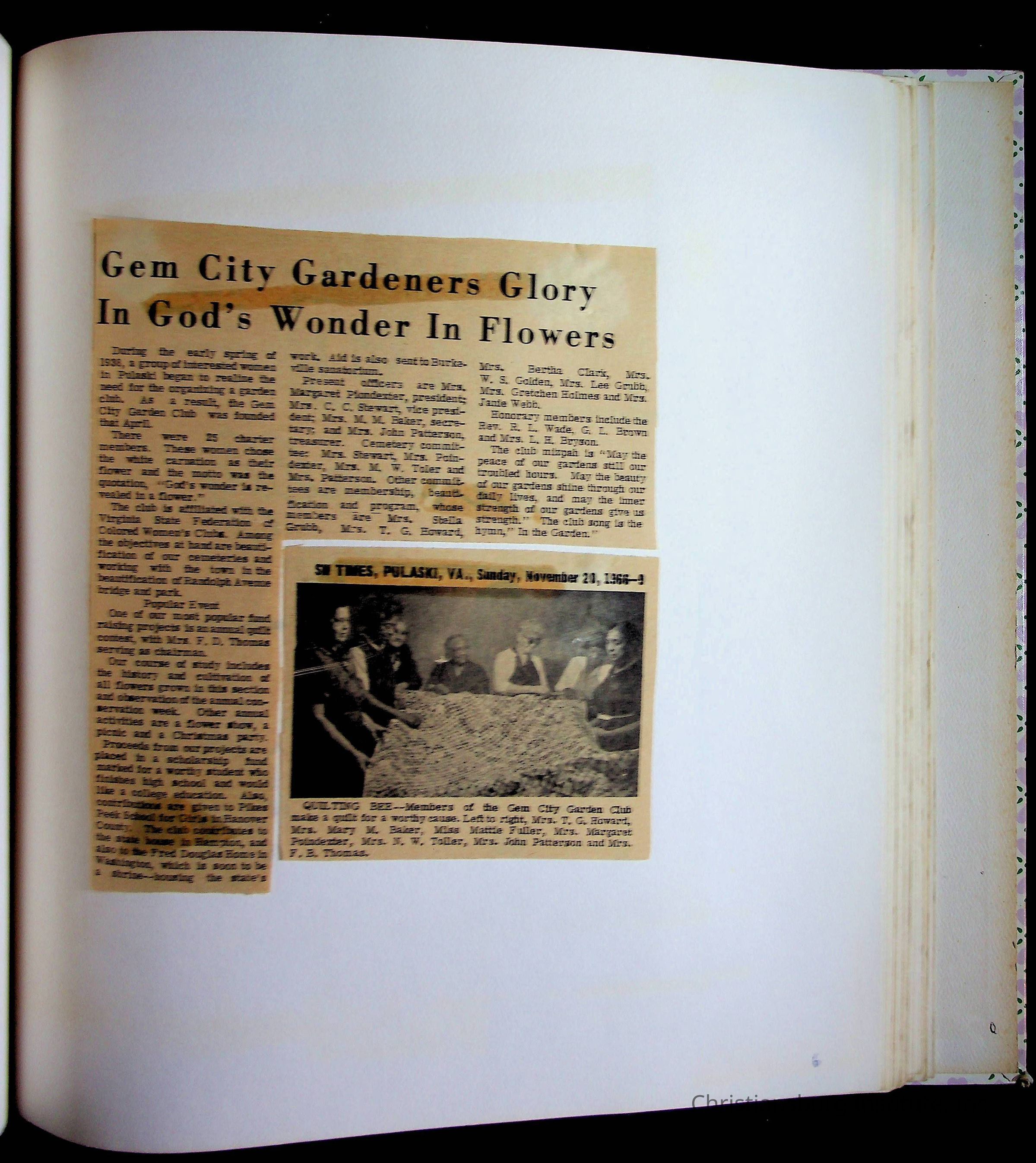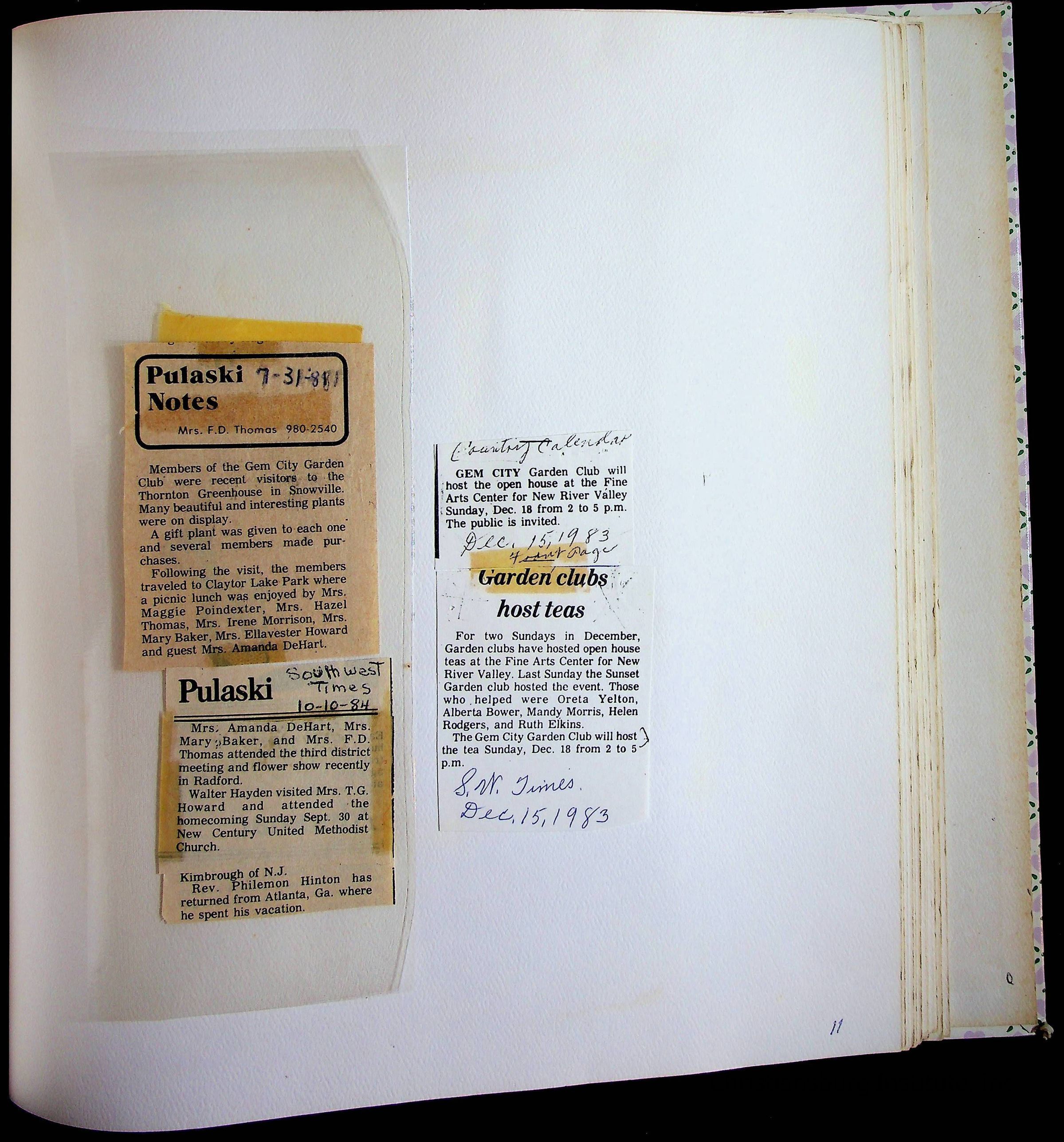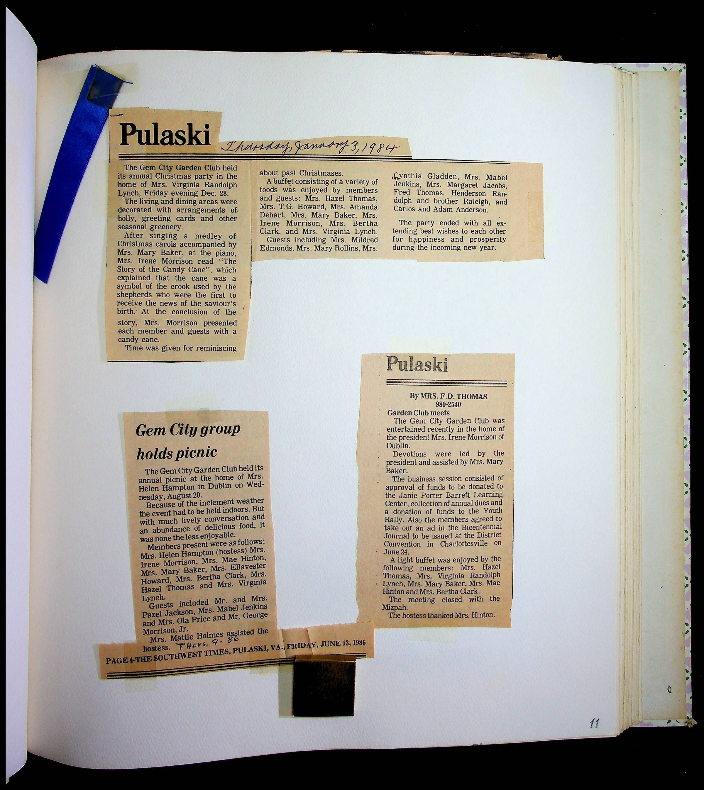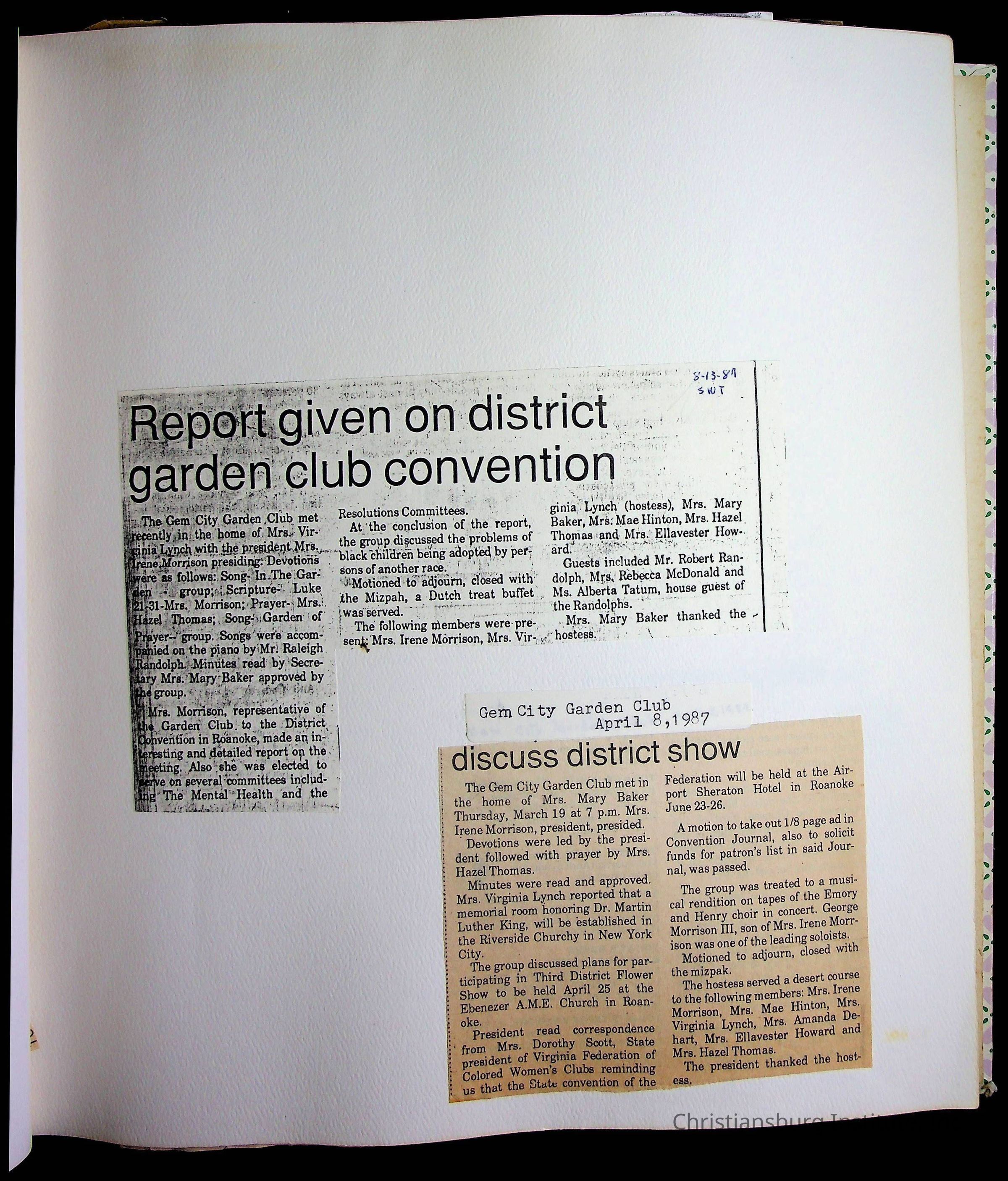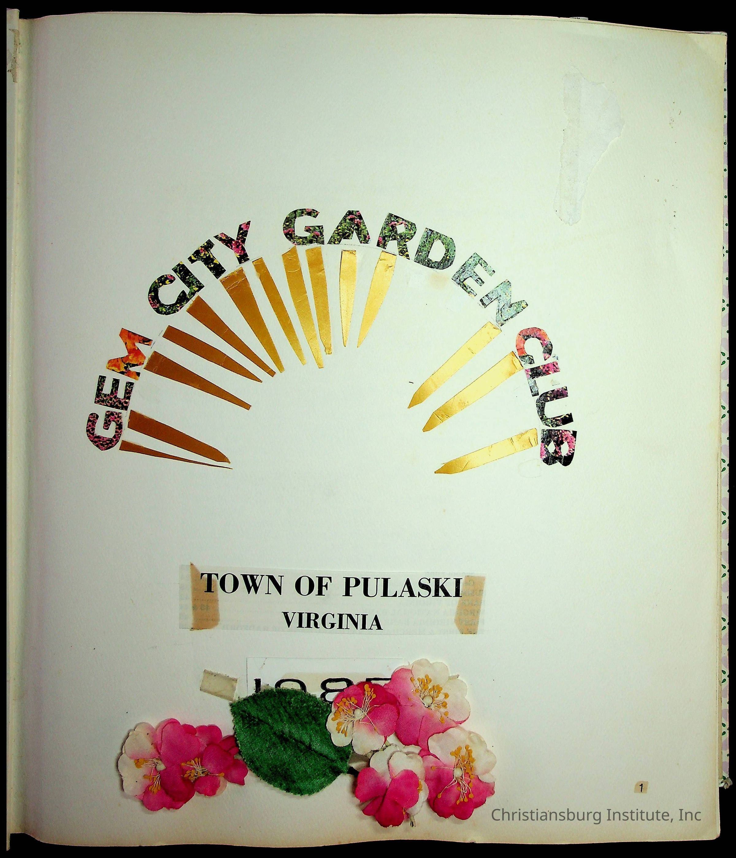 A scrapbook compiled by Amanda DeHart for the Gem City Garden Club of Pulaski, Virginia dated 1985-1989.
