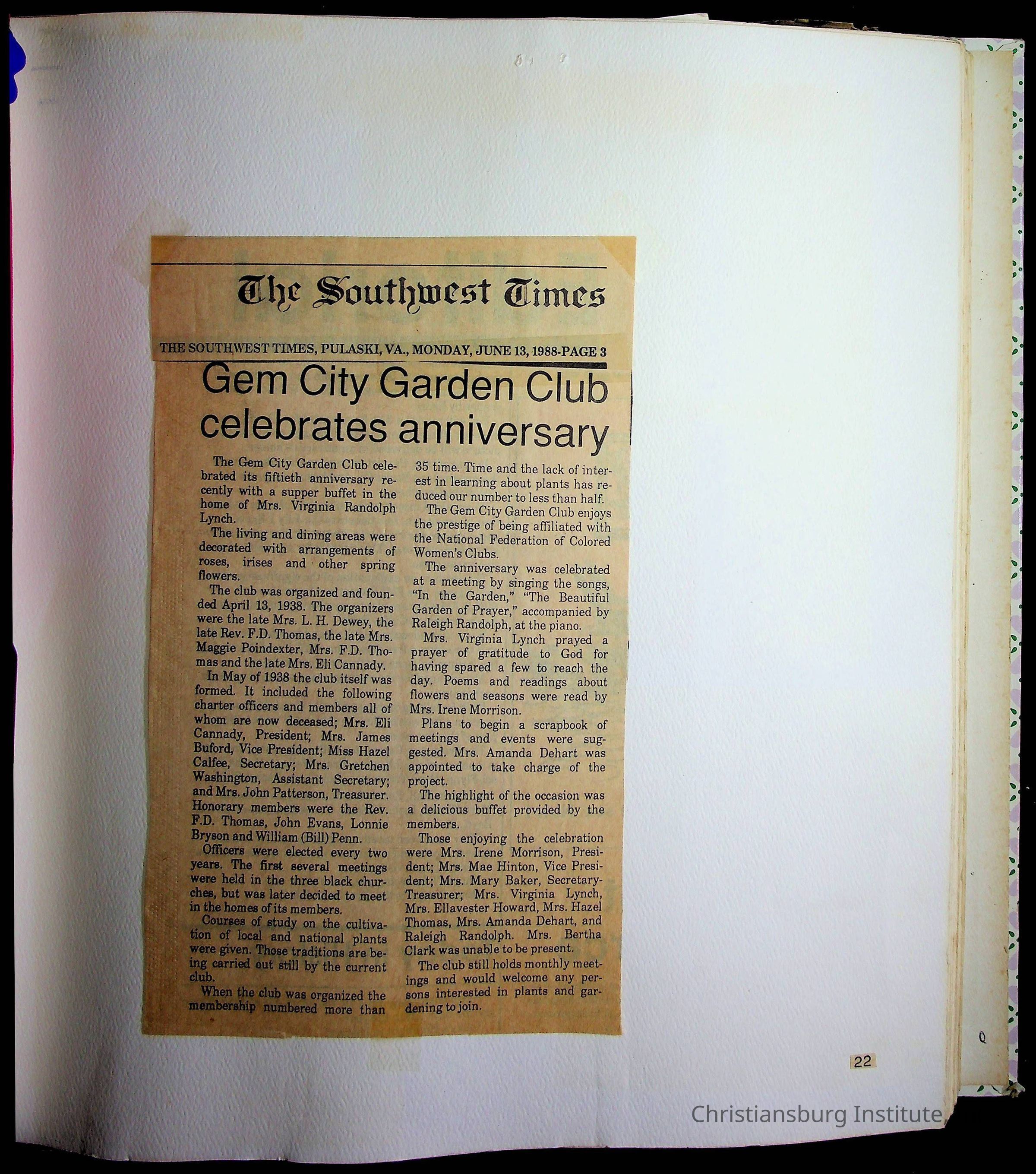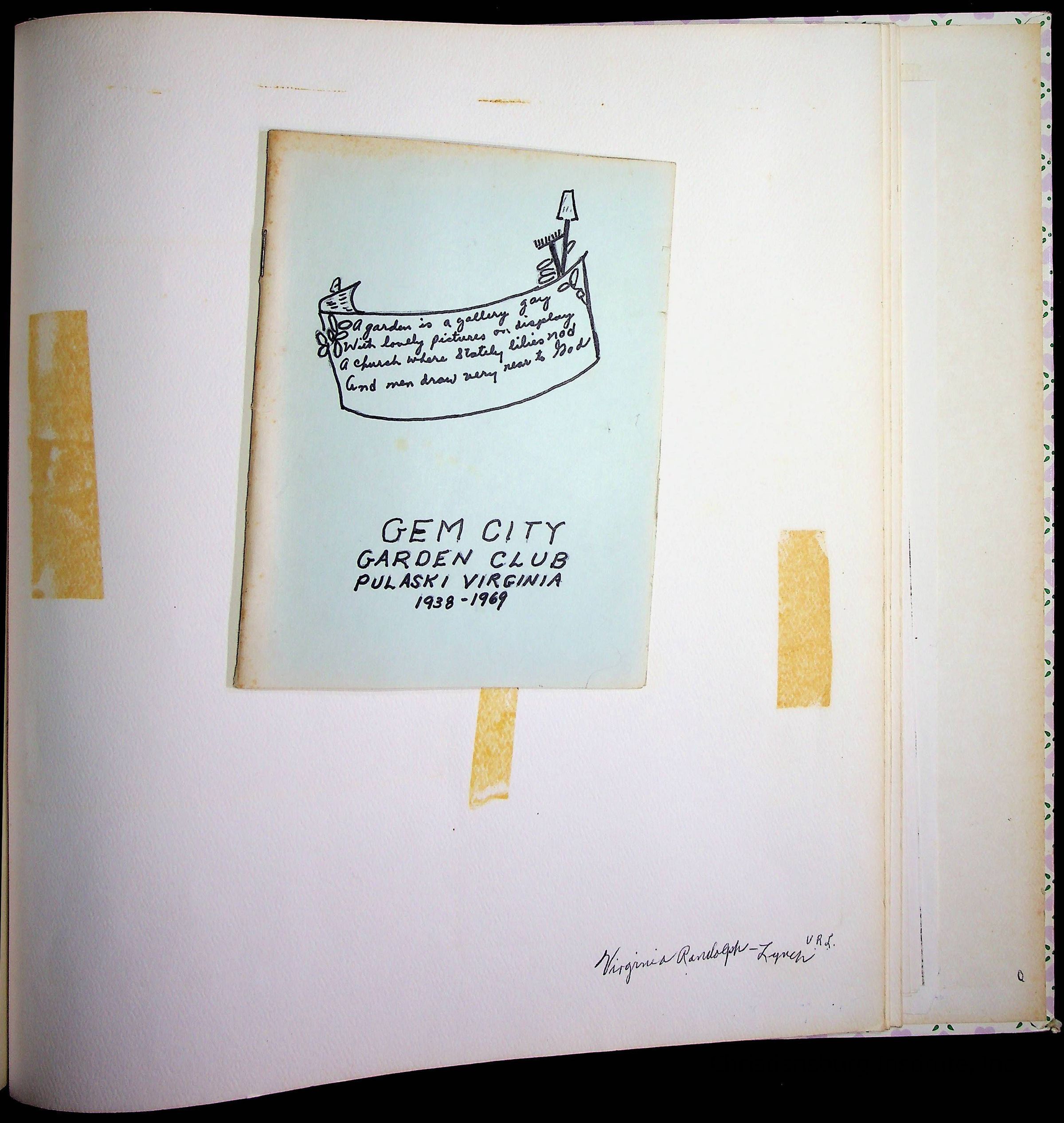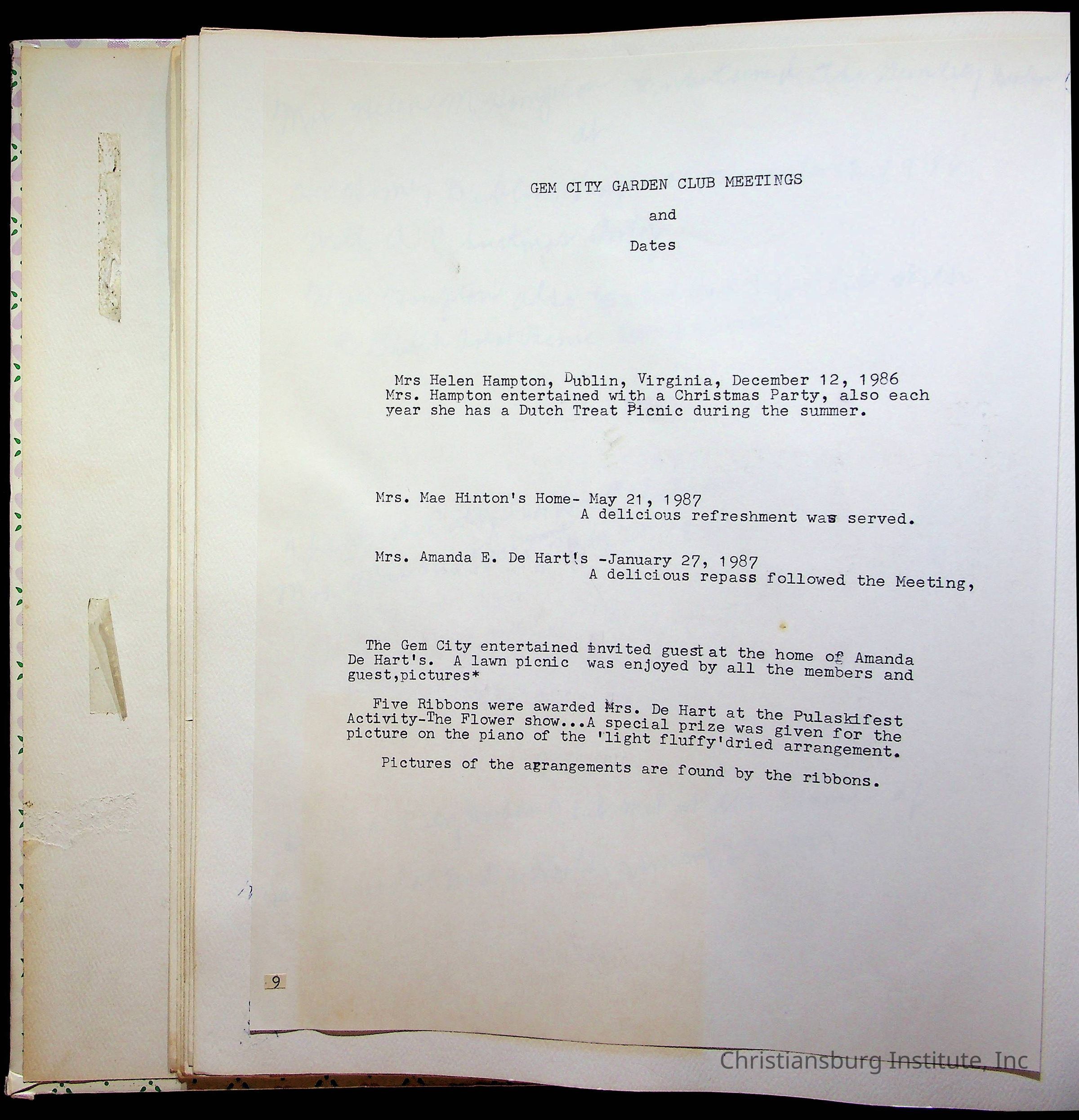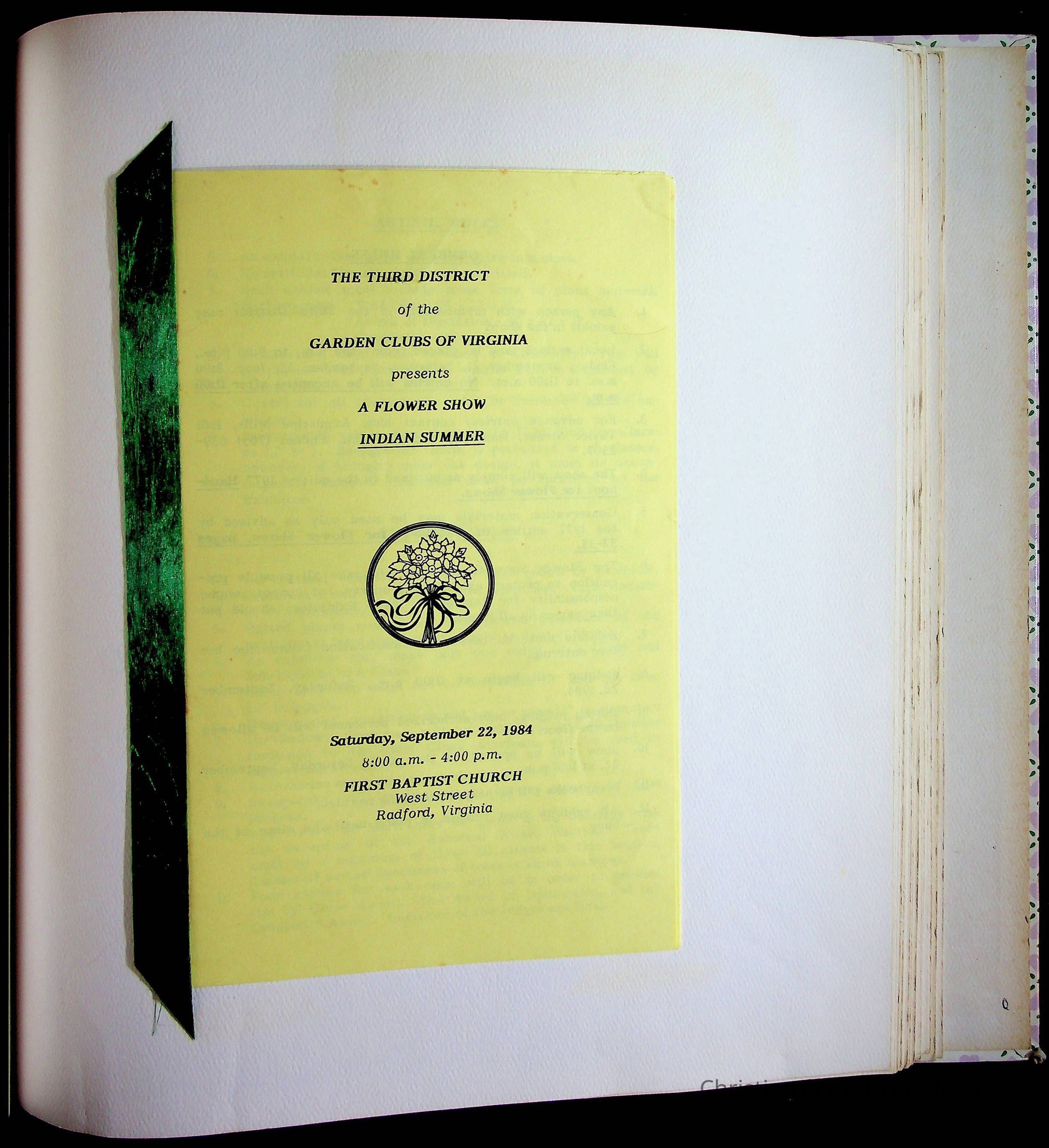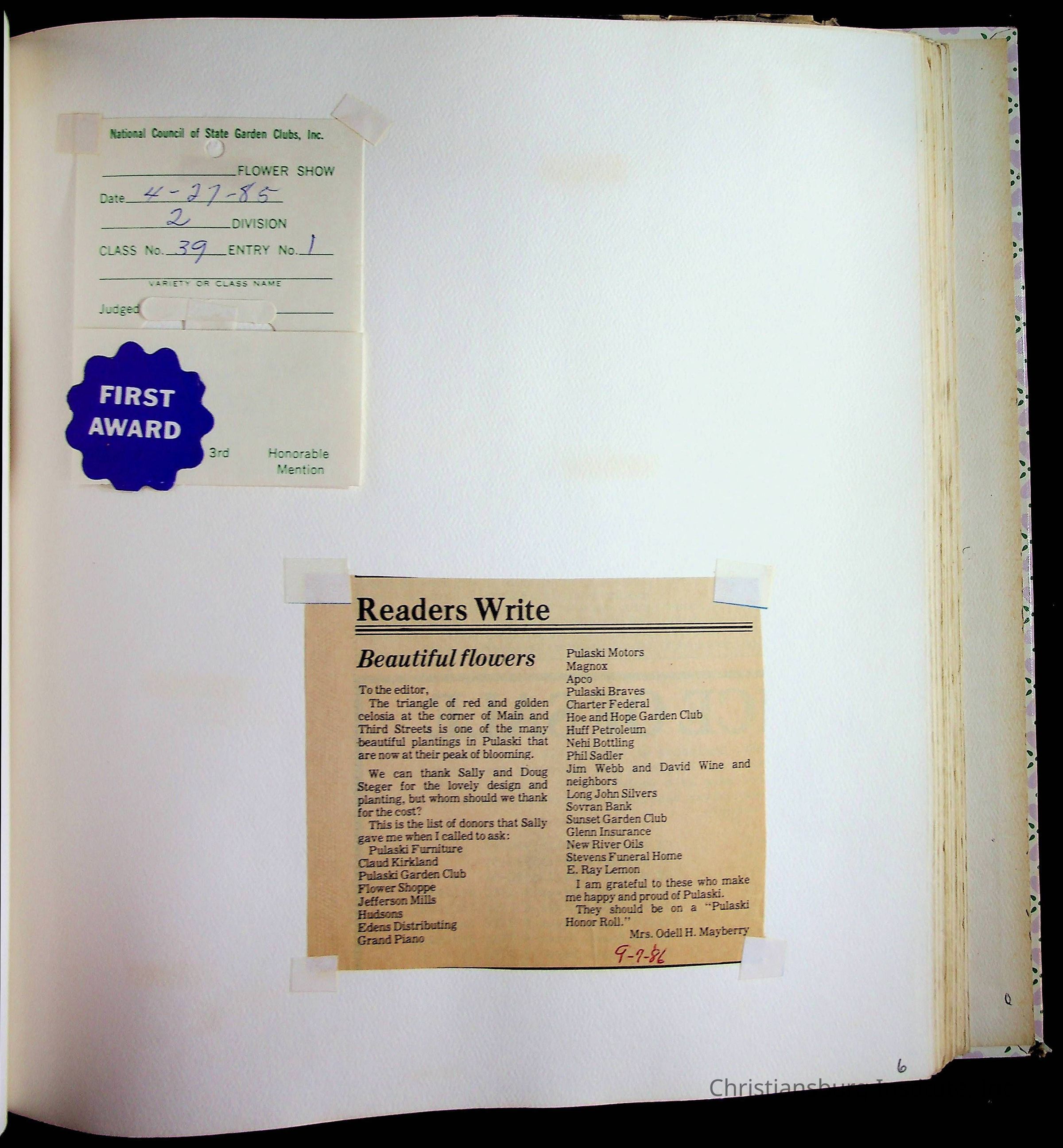 A scrapbook compiled by Amanda DeHart for the Gem City Garden Club of Pulaski, Virginia dated 1985-1989.