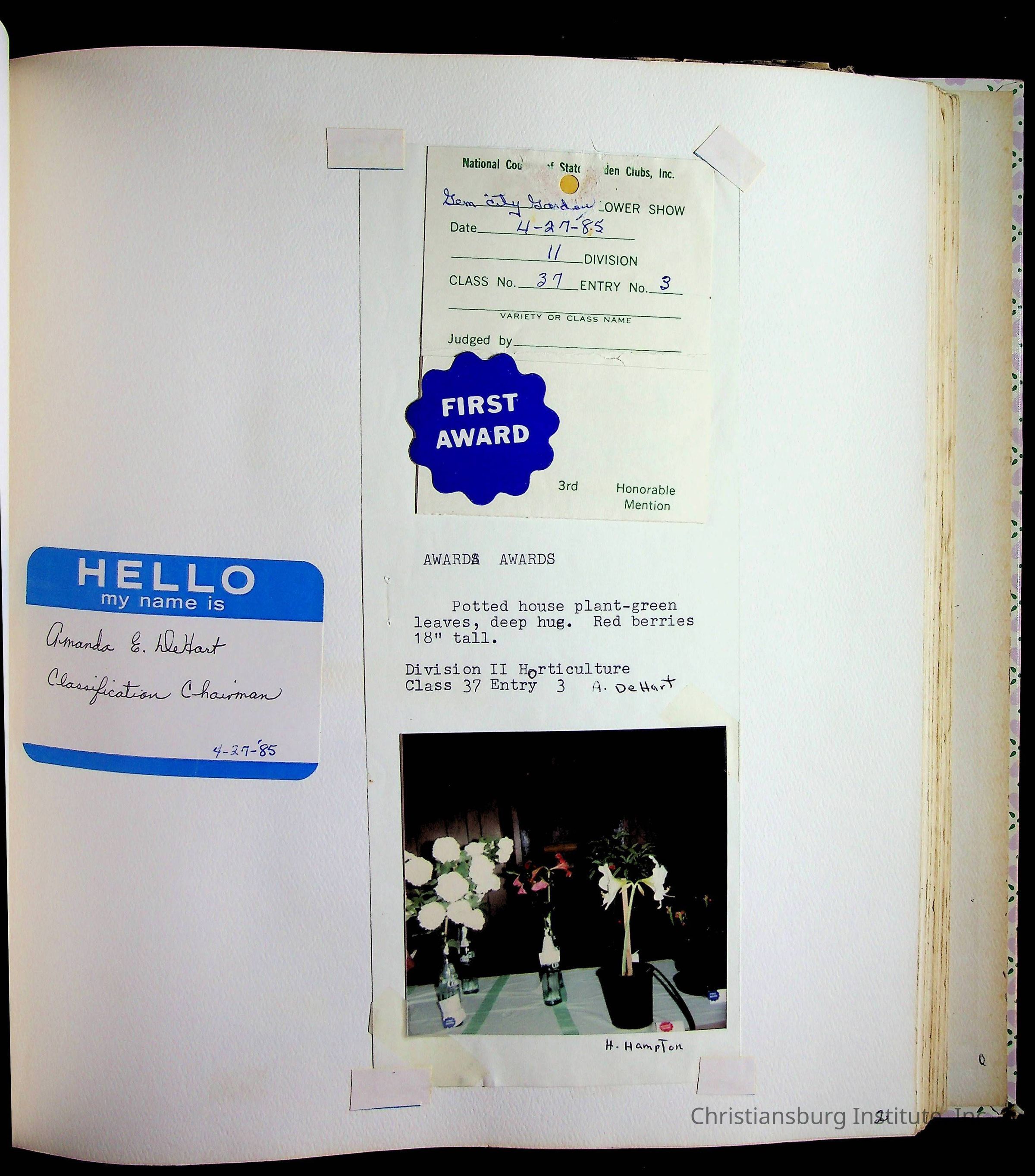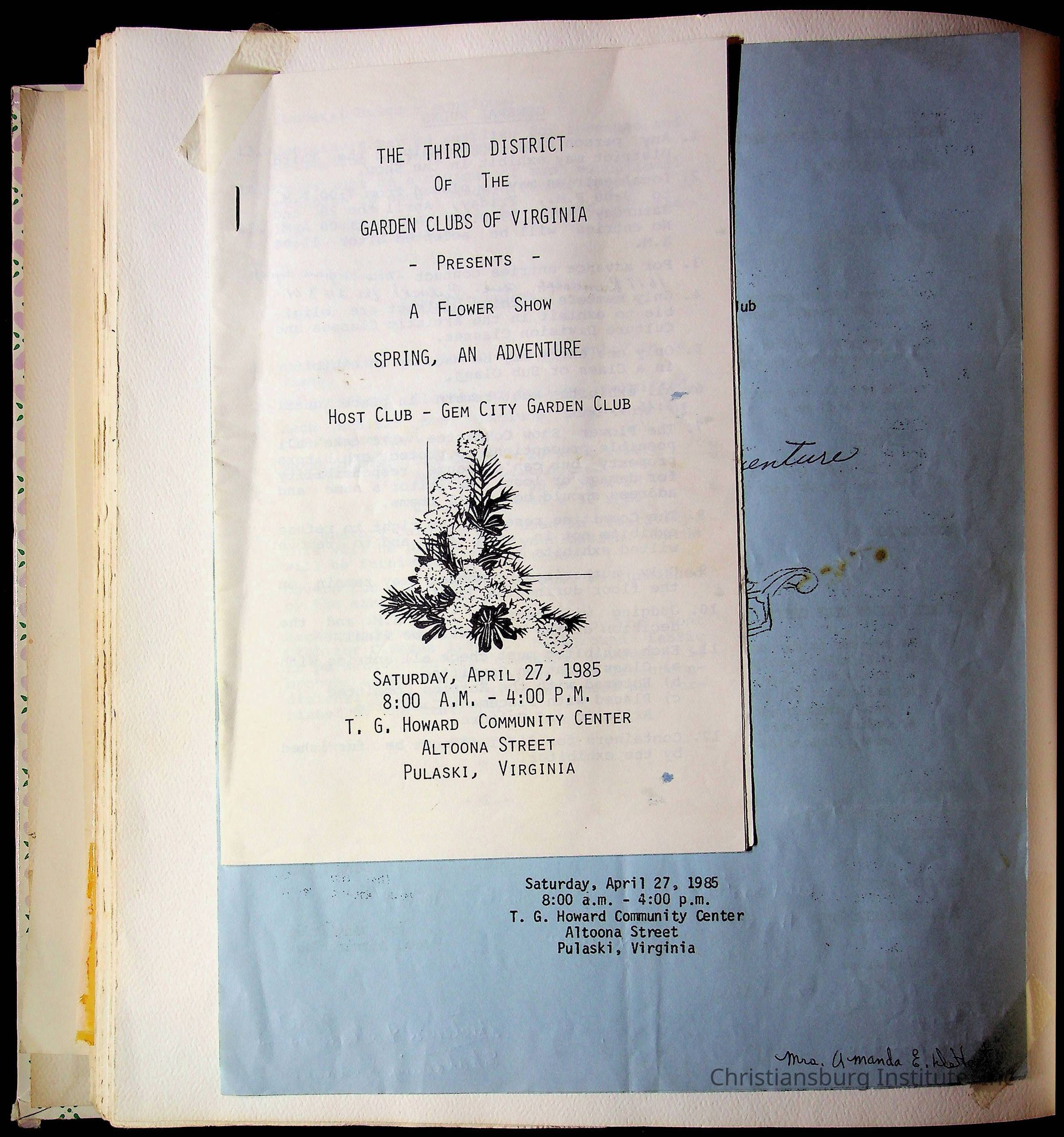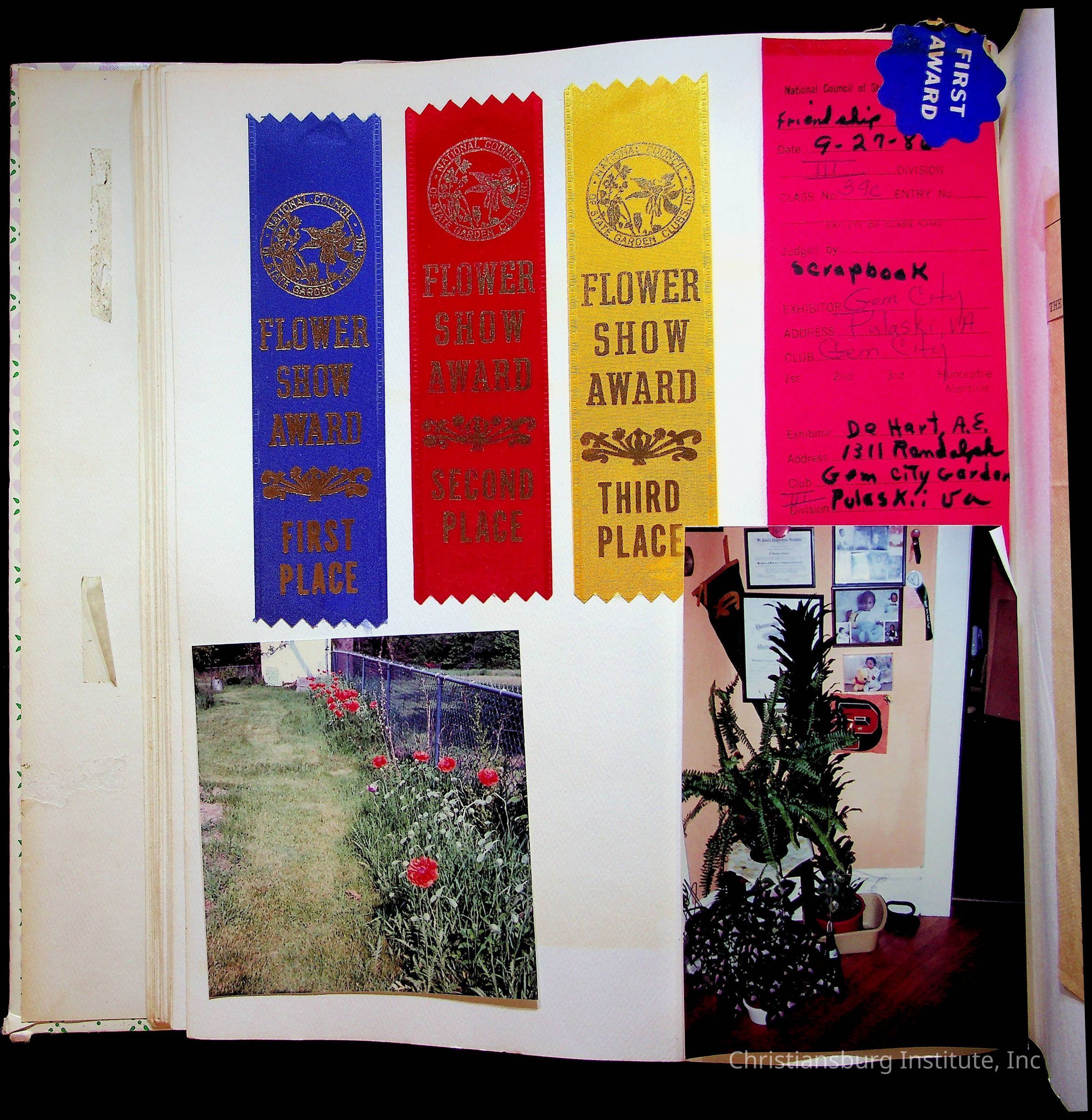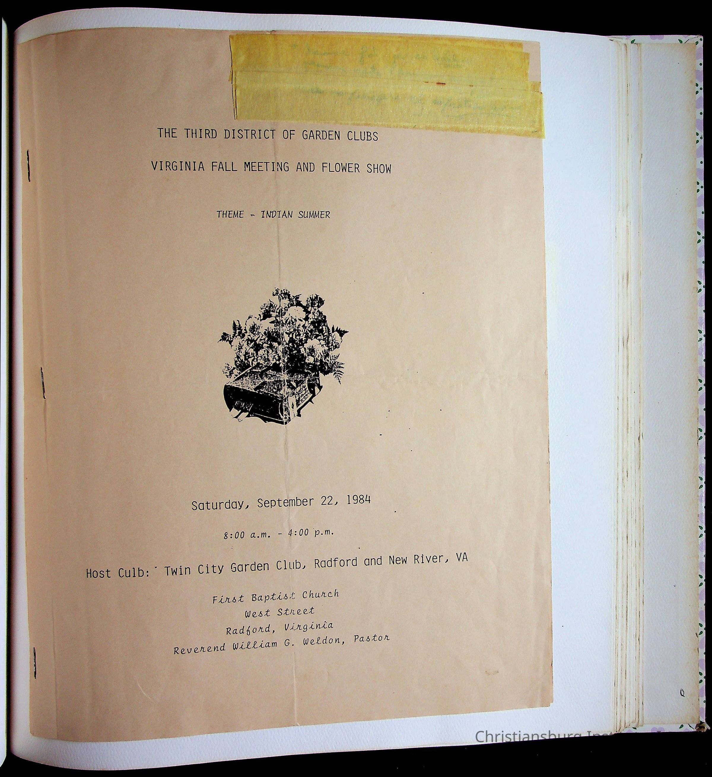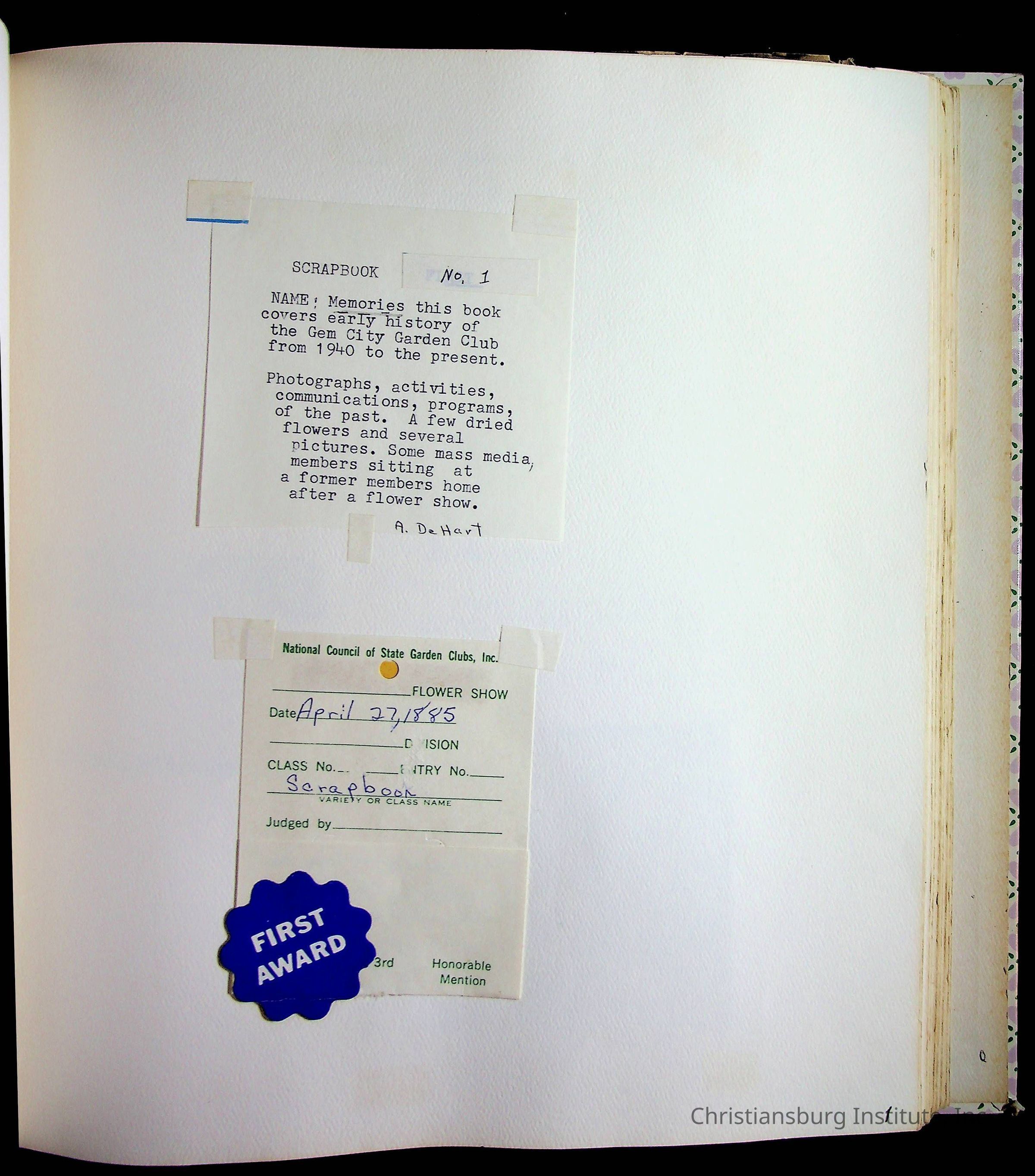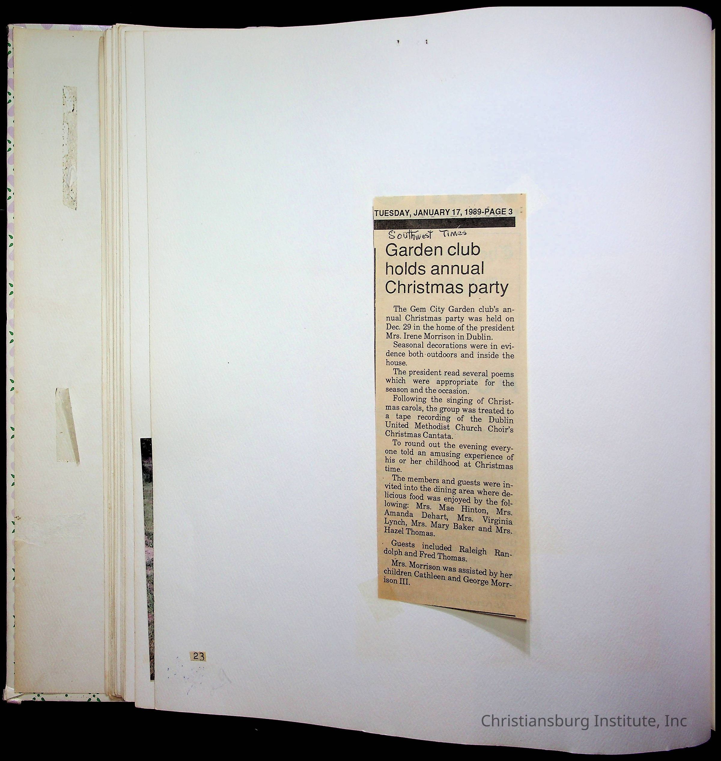 A scrapbook compiled by Amanda DeHart for the Gem City Garden Club of Pulaski, Virginia dated 1985-1989.