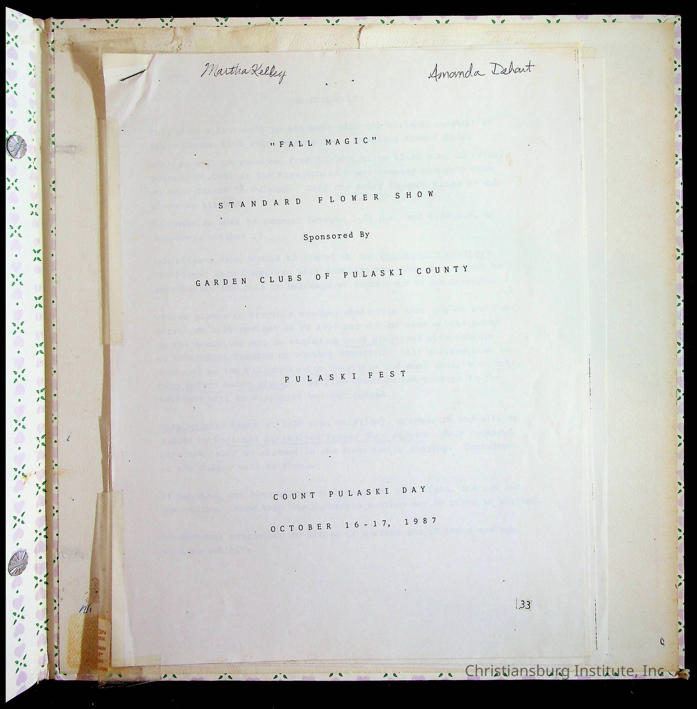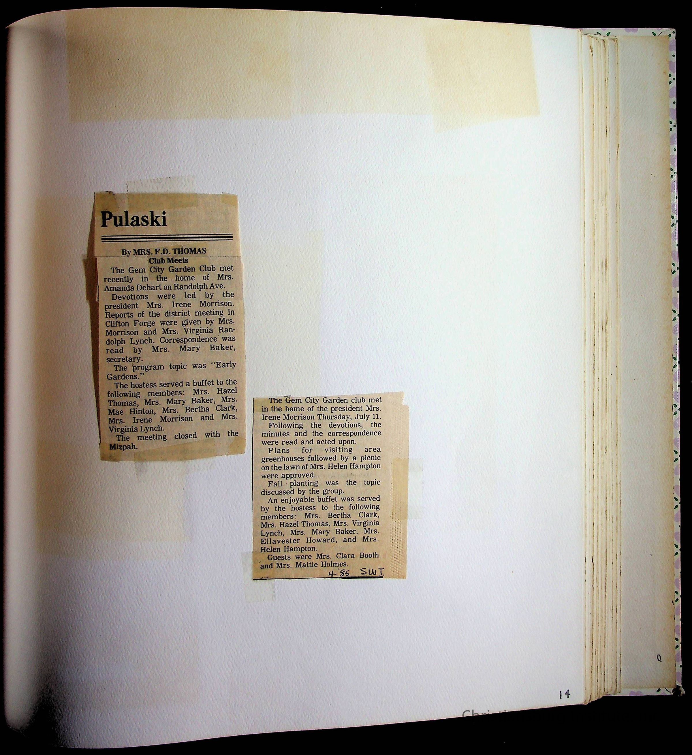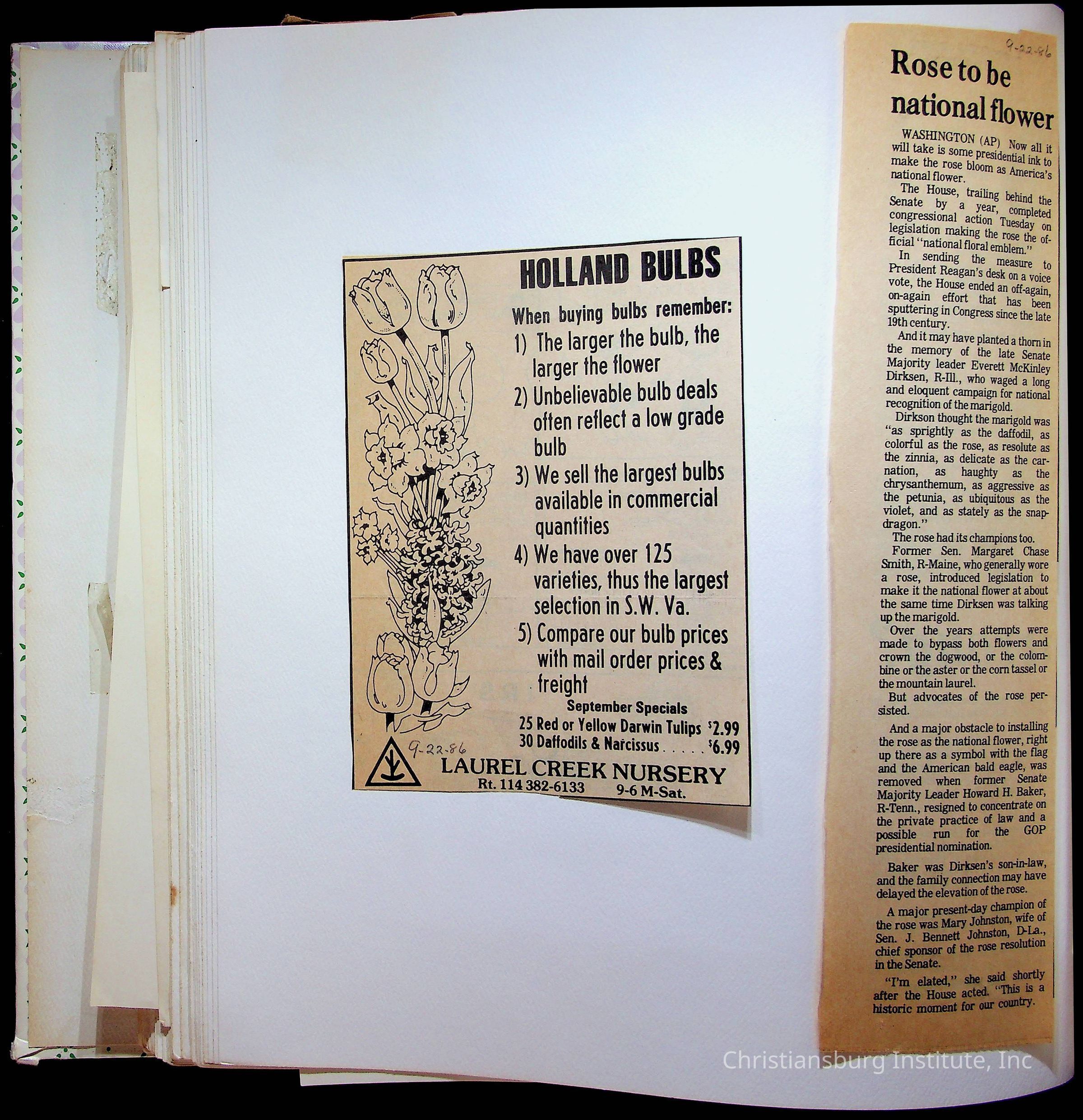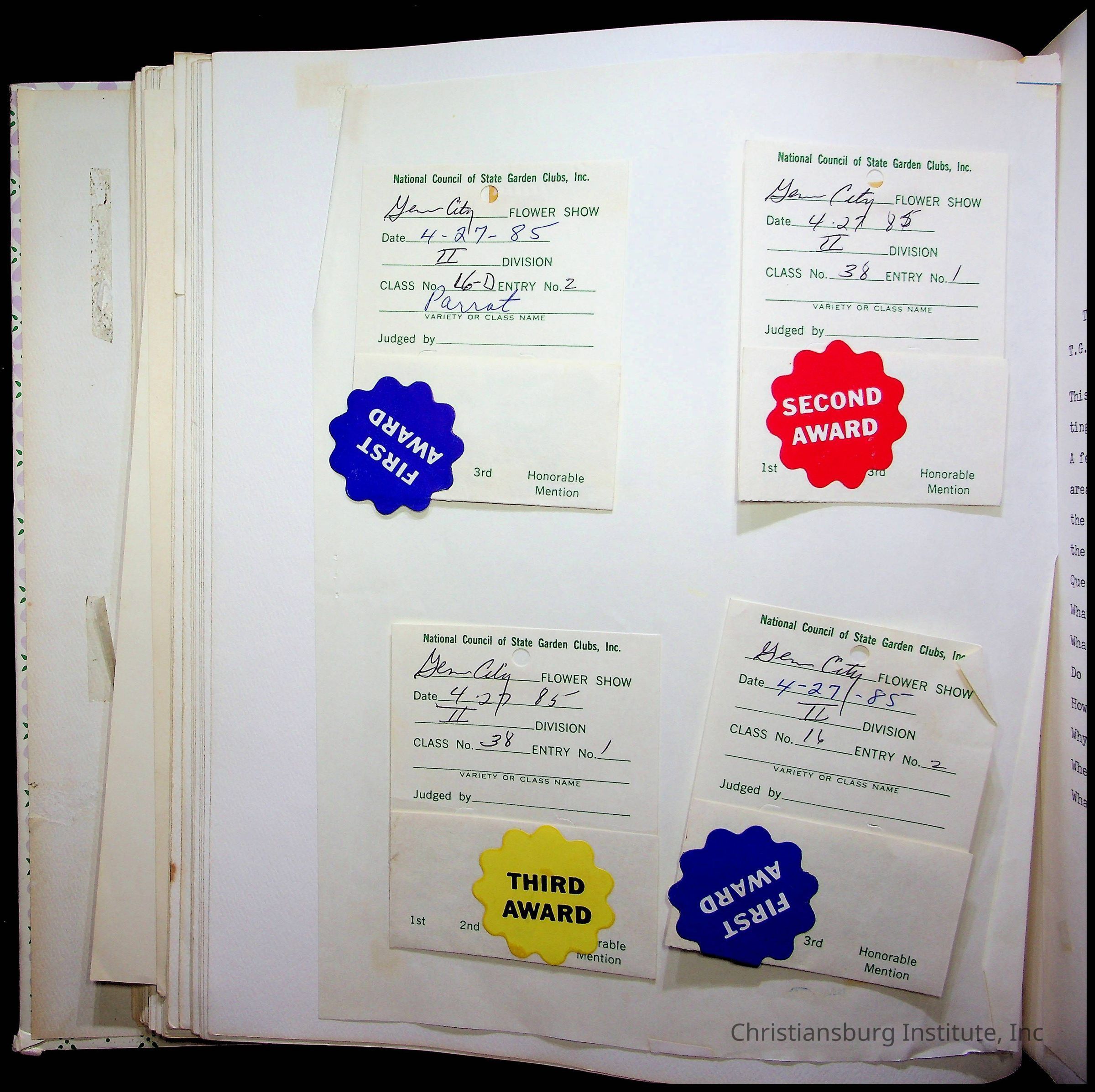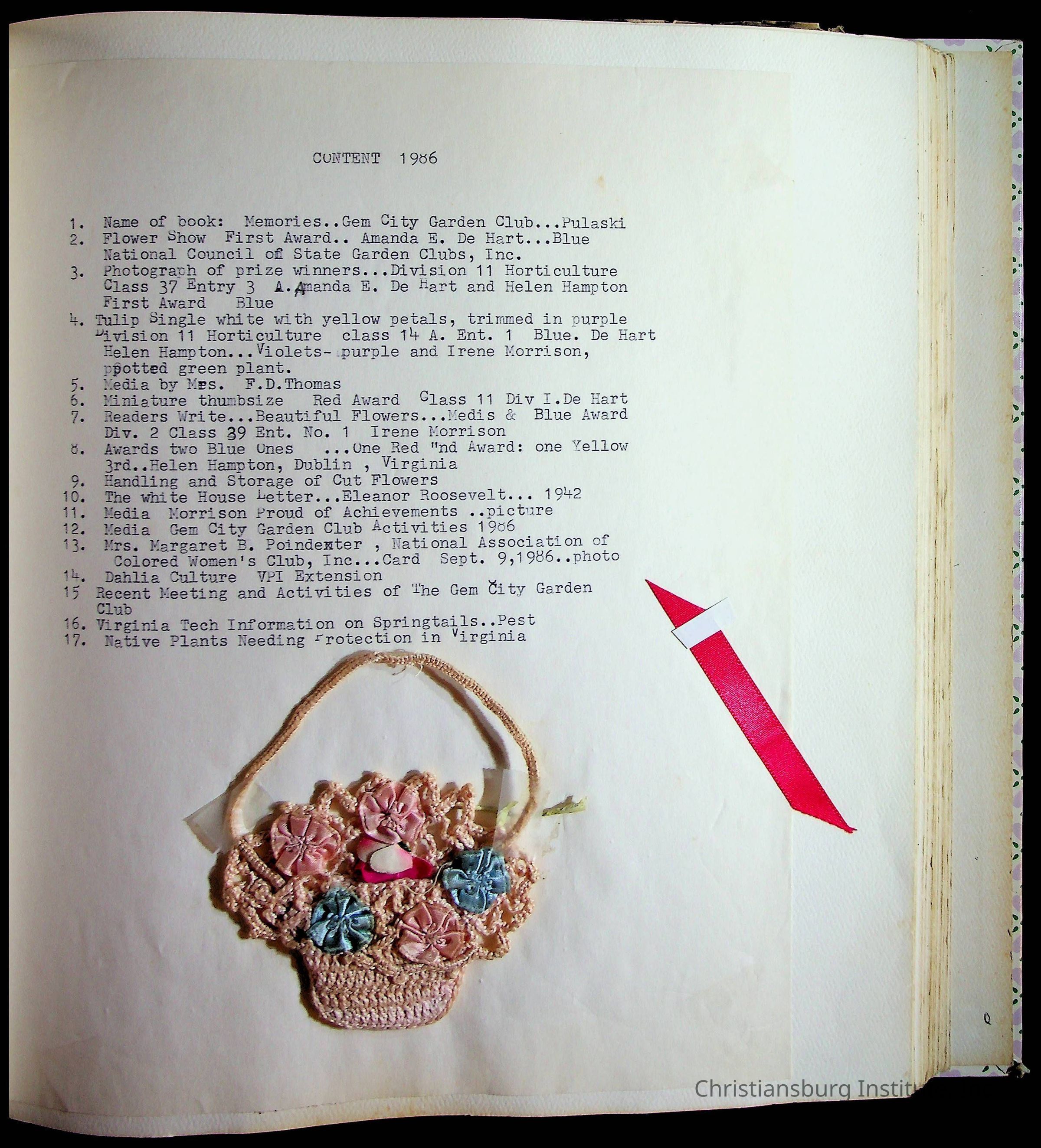 A scrapbook compiled by Amanda DeHart for the Gem City Garden Club of Pulaski, Virginia dated 1985-1989.