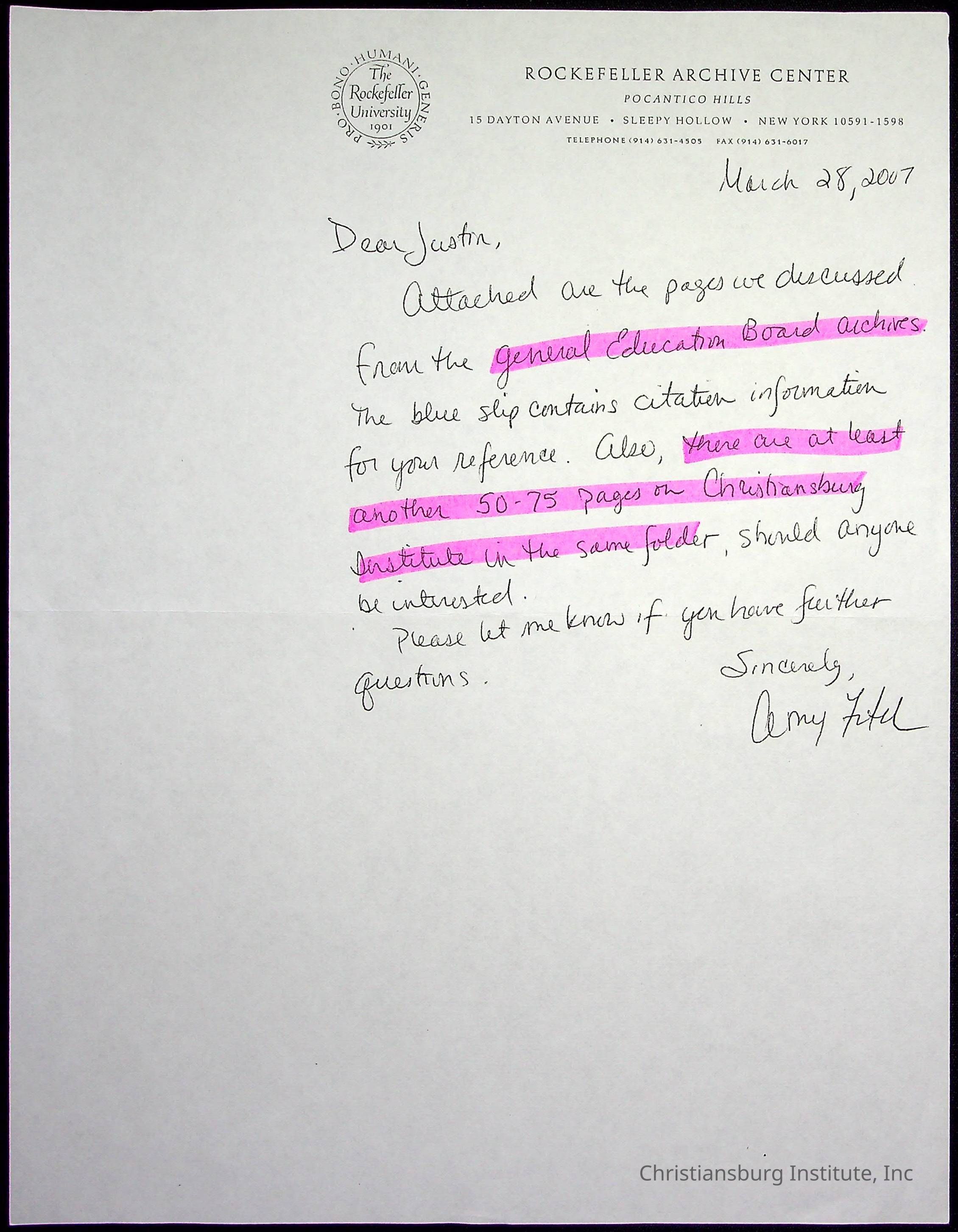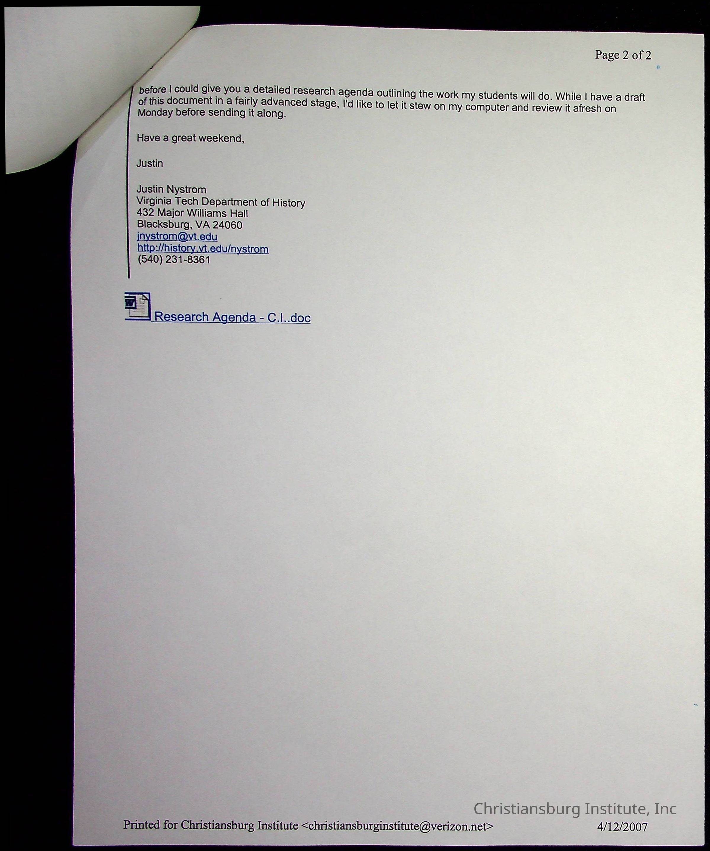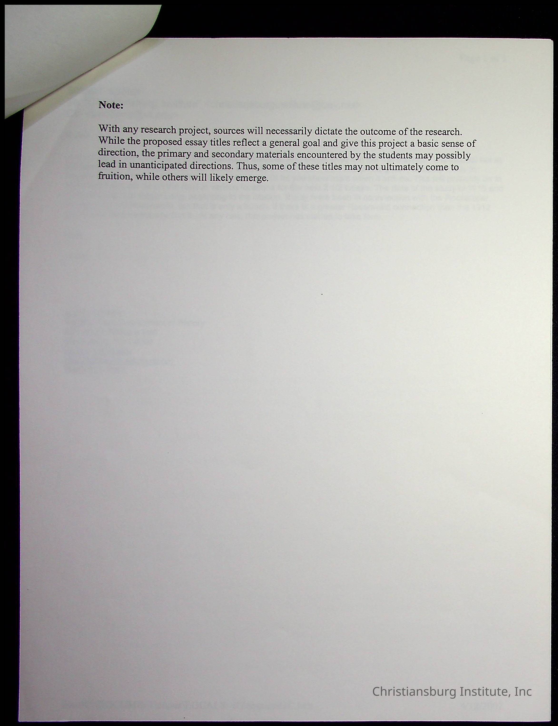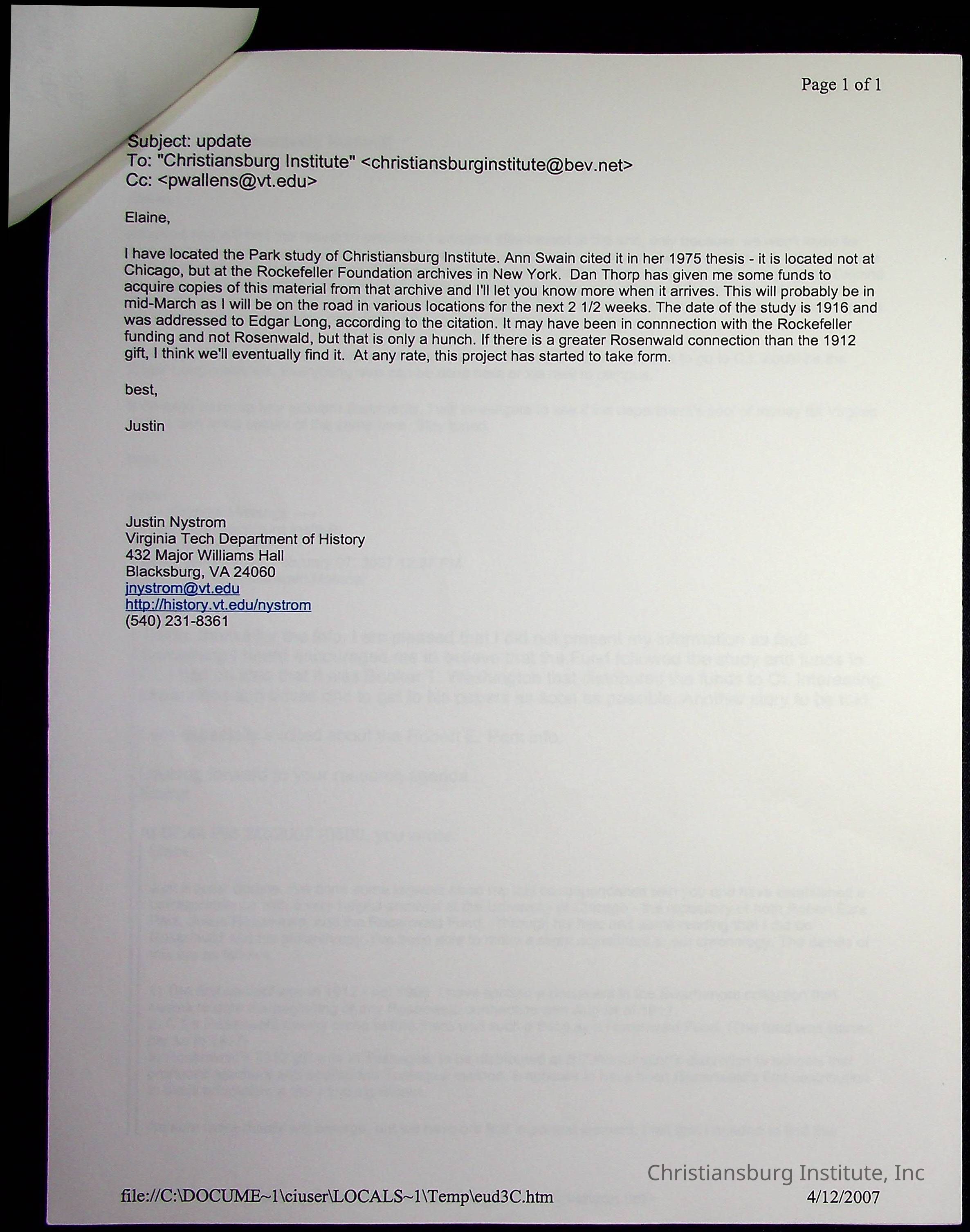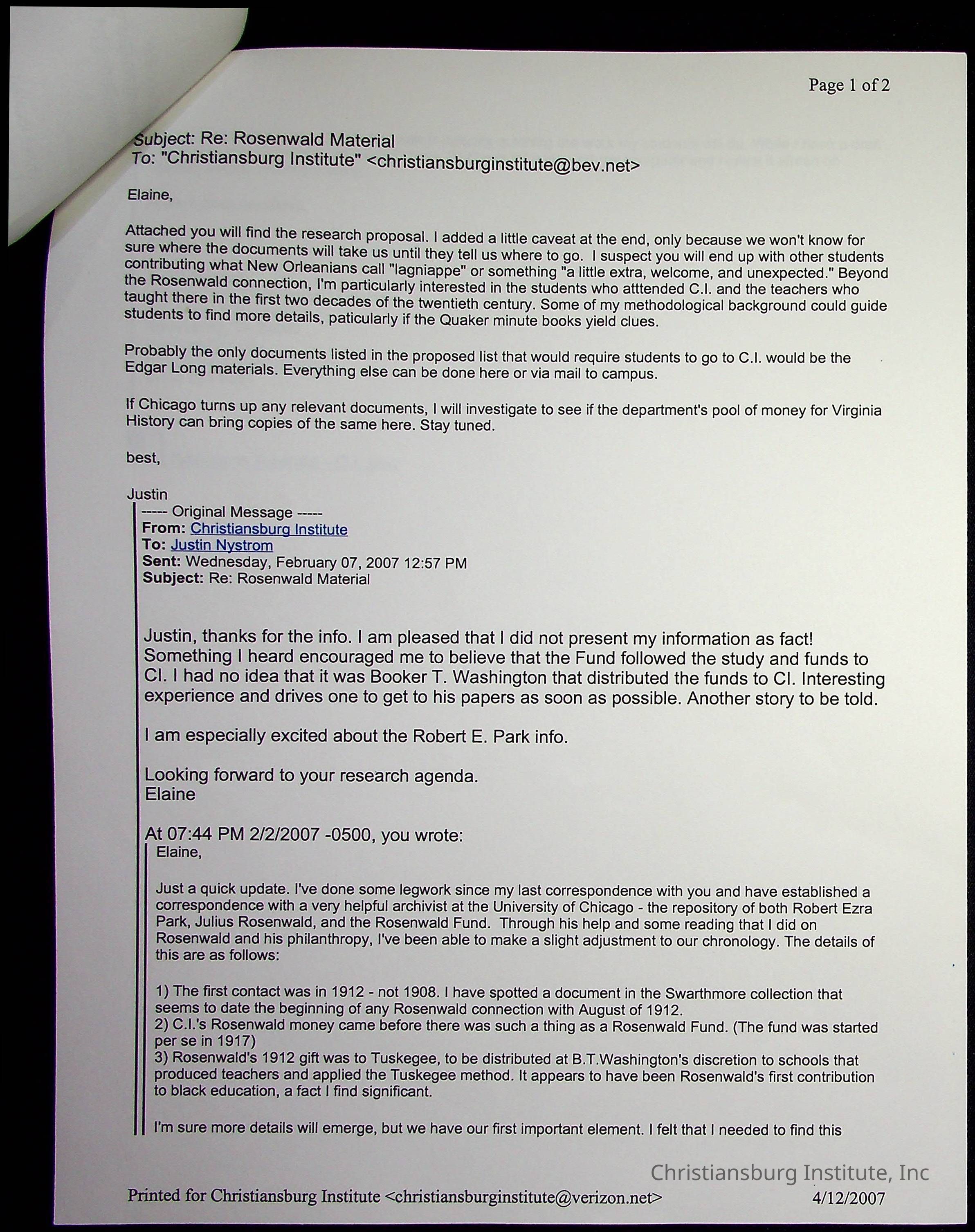 A series of research materials from the project titled "The Rosenwald Connection: Christiansburg Institute and the Philanthropy of Julius Rosenwald" written by Justin Nystrom, dated 2007.Creator