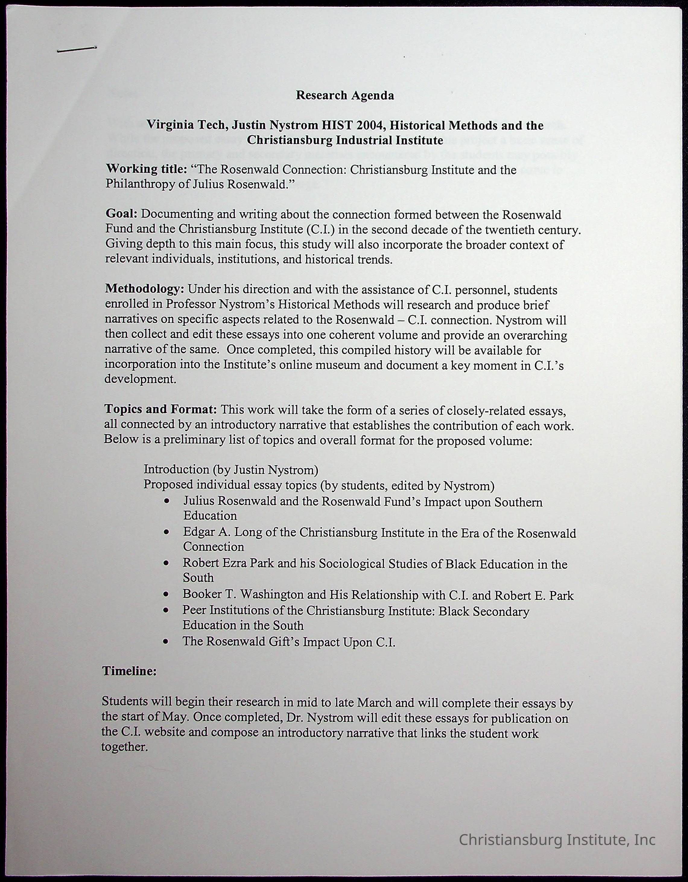 A series of research materials from the project titled "The Rosenwald Connection: Christiansburg Institute and the Philanthropy of Julius Rosenwald" written by Justin Nystrom, dated 2007.Collection