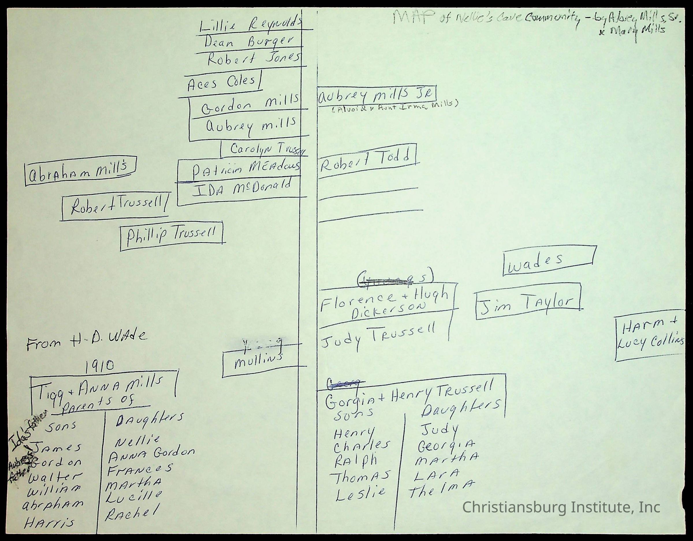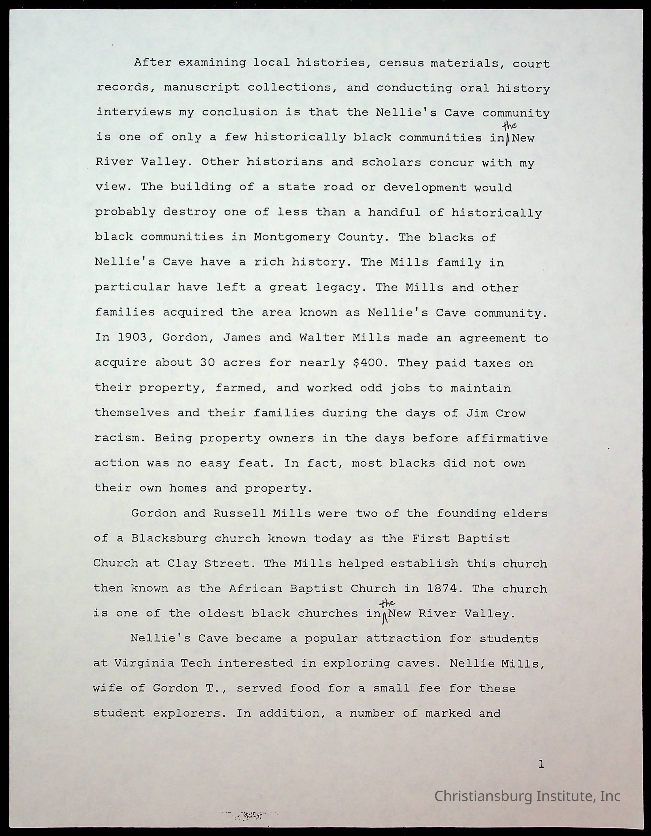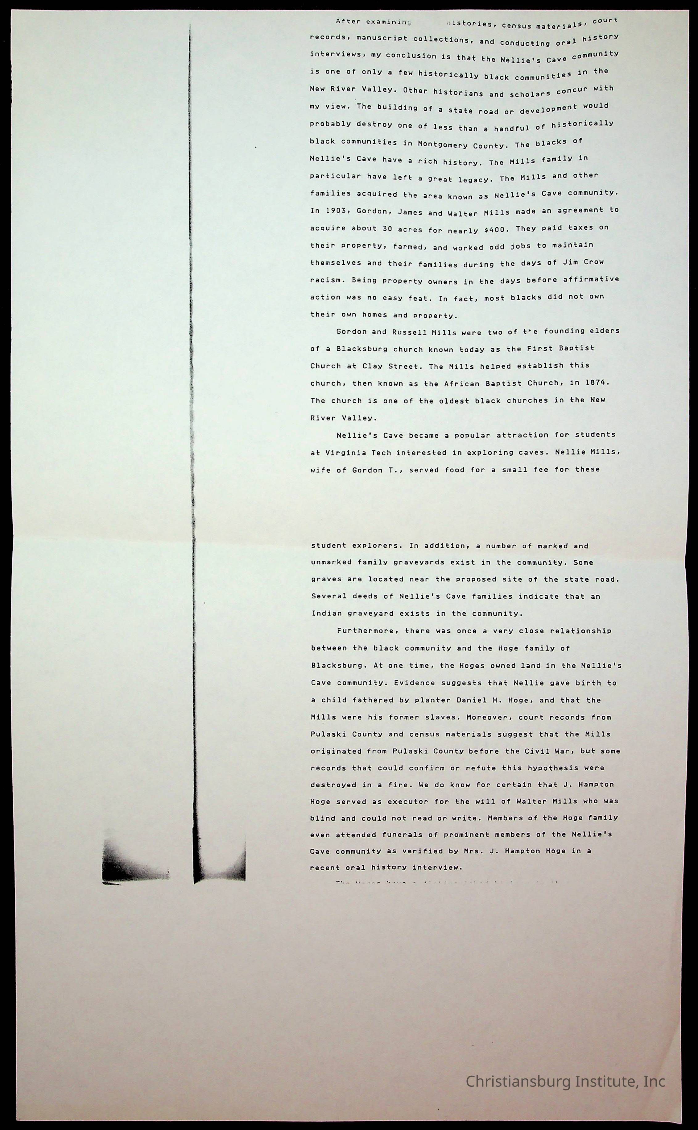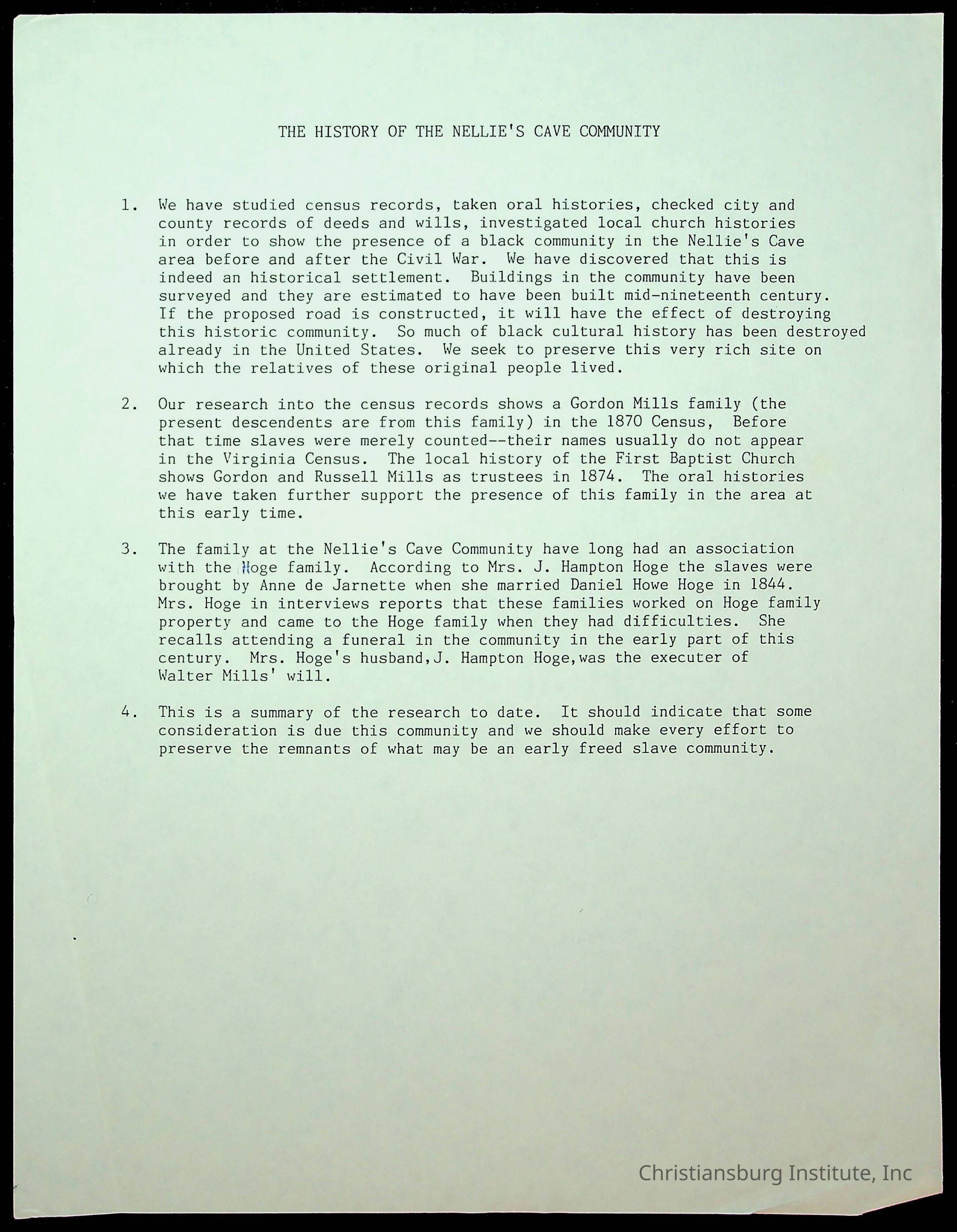 An archive of research materials about the history of Nellies Cave, the Black families that lived there, and maps of the Nellies Cave Community, compiled by Elizabeth Fine, undated.Collection