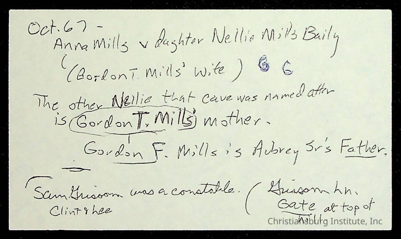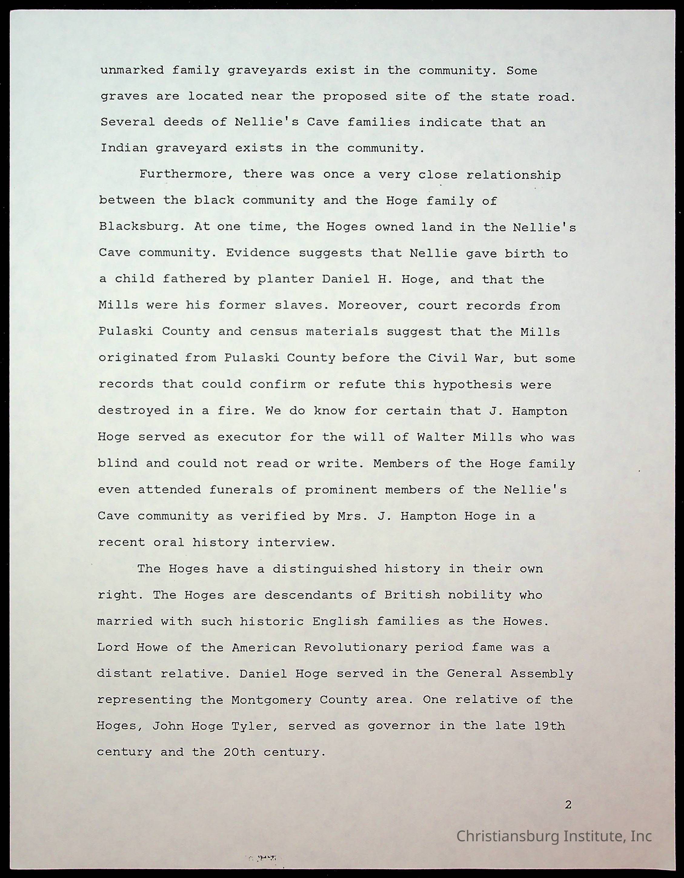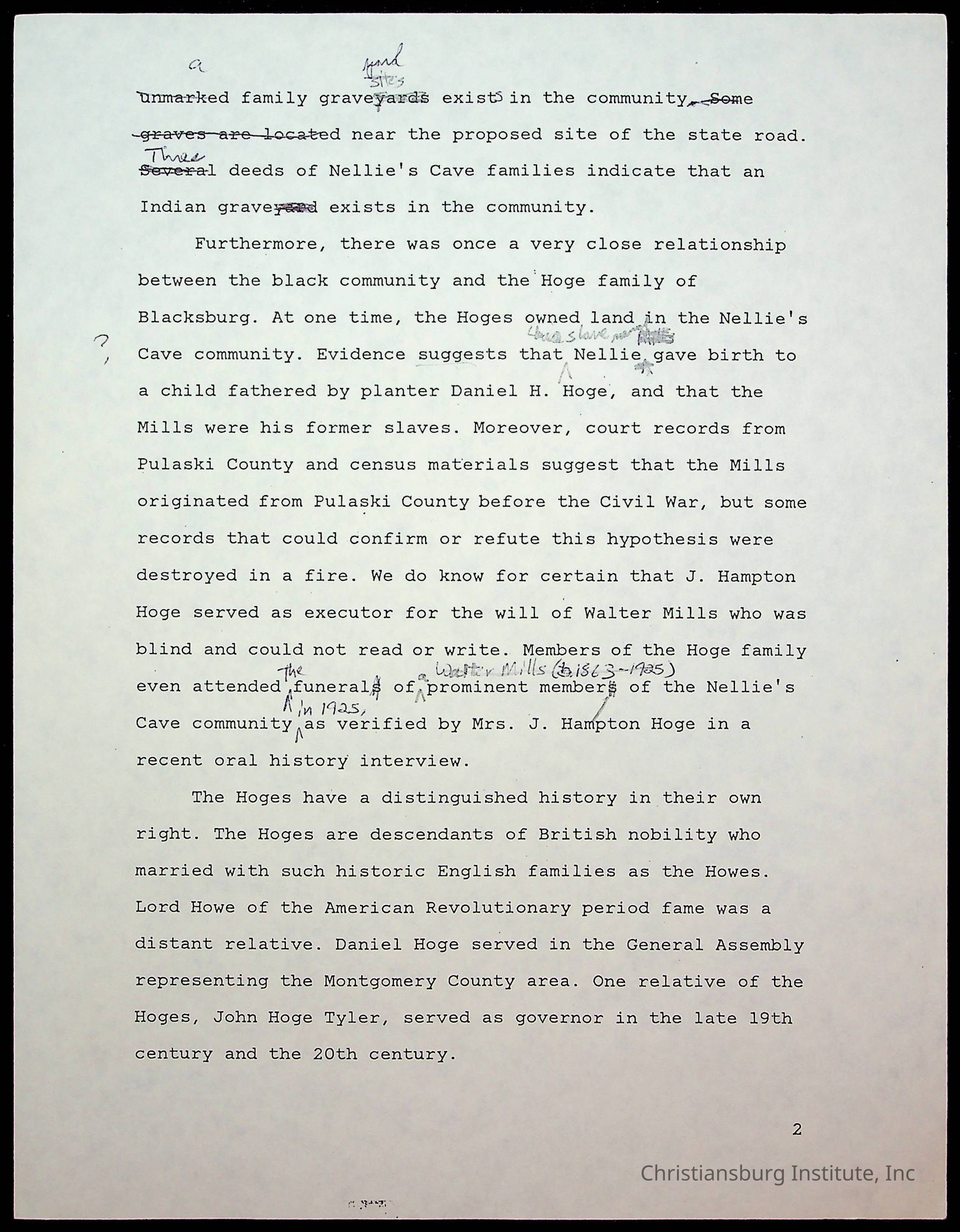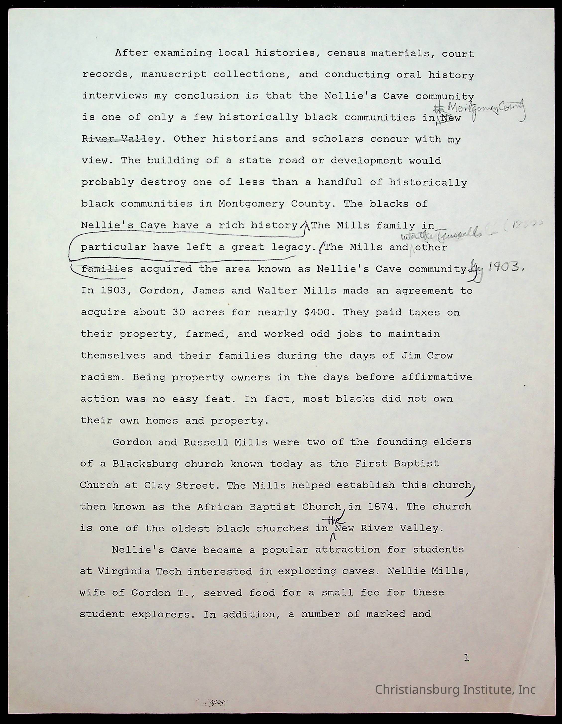 An archive of research materials about the history of Nellies Cave, the Black families that lived there, and maps of the Nellies Cave Community, compiled by Elizabeth Fine, undated.Collection