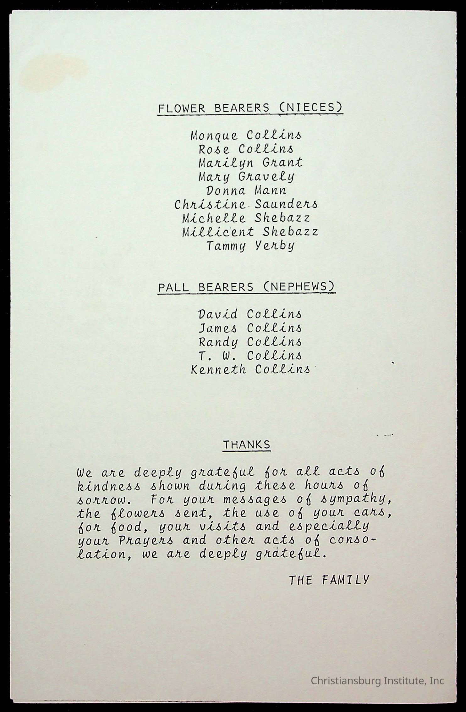 Copyright has been assigned to Christiansburg Institute Museum & Archives by Elizabeth Fine. For permission to publish materials created by the donor, contact CIMA@christiansburginstitute.com. Materials not created by Elizabeth Fine may still be under copyright.