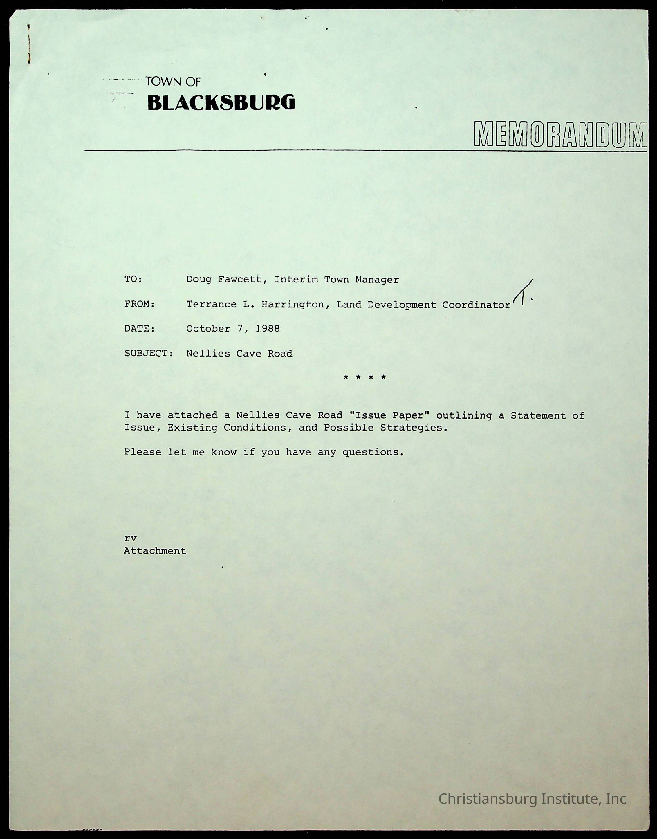 A memorandum from Terrance L. Harrington to Doug Fawcett with an attachment titled 'Nellies Cave Issue Paper' dated October 7th, 1988.