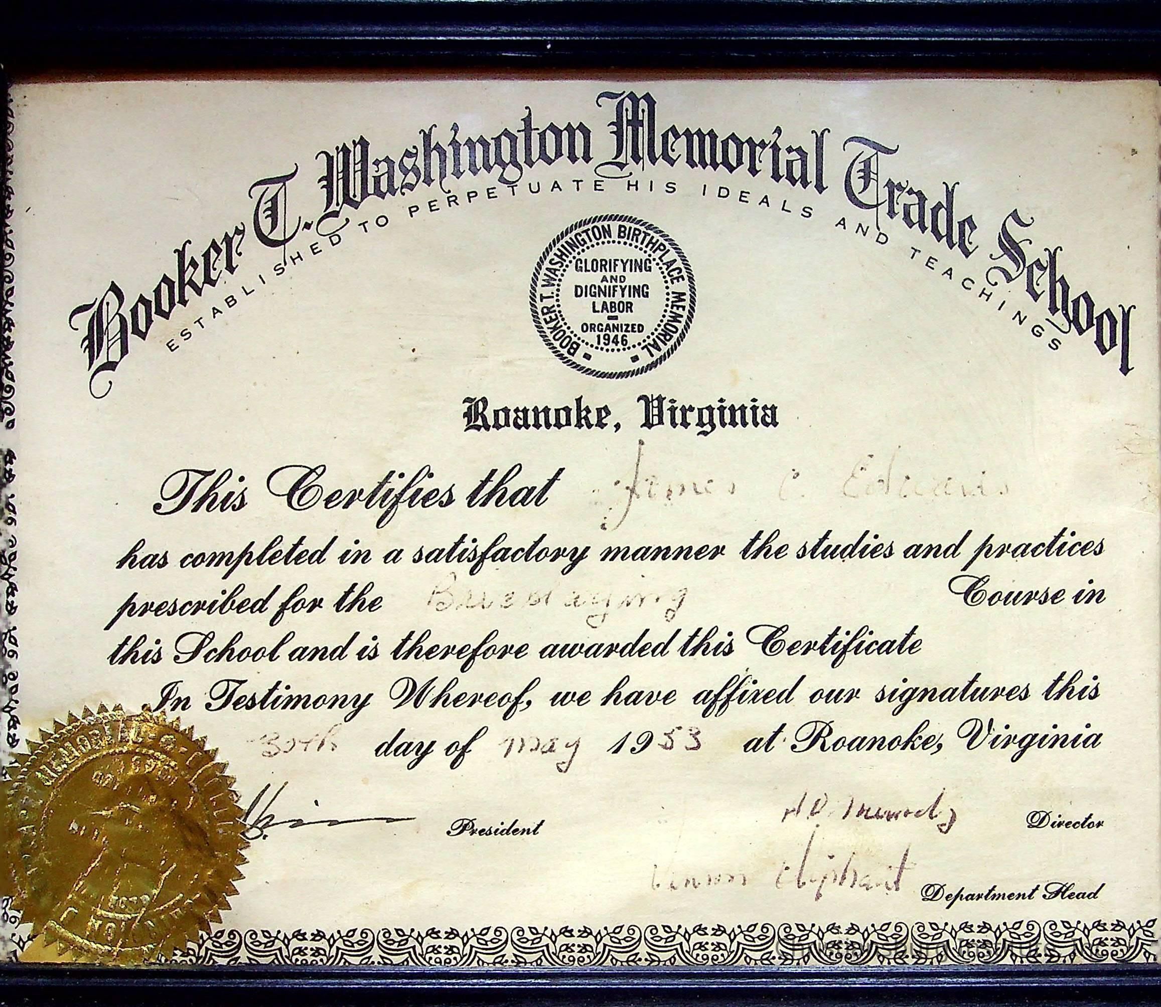 James C. Edwards, Booker T. Washington Memorial Trade School certificate, 1953Description