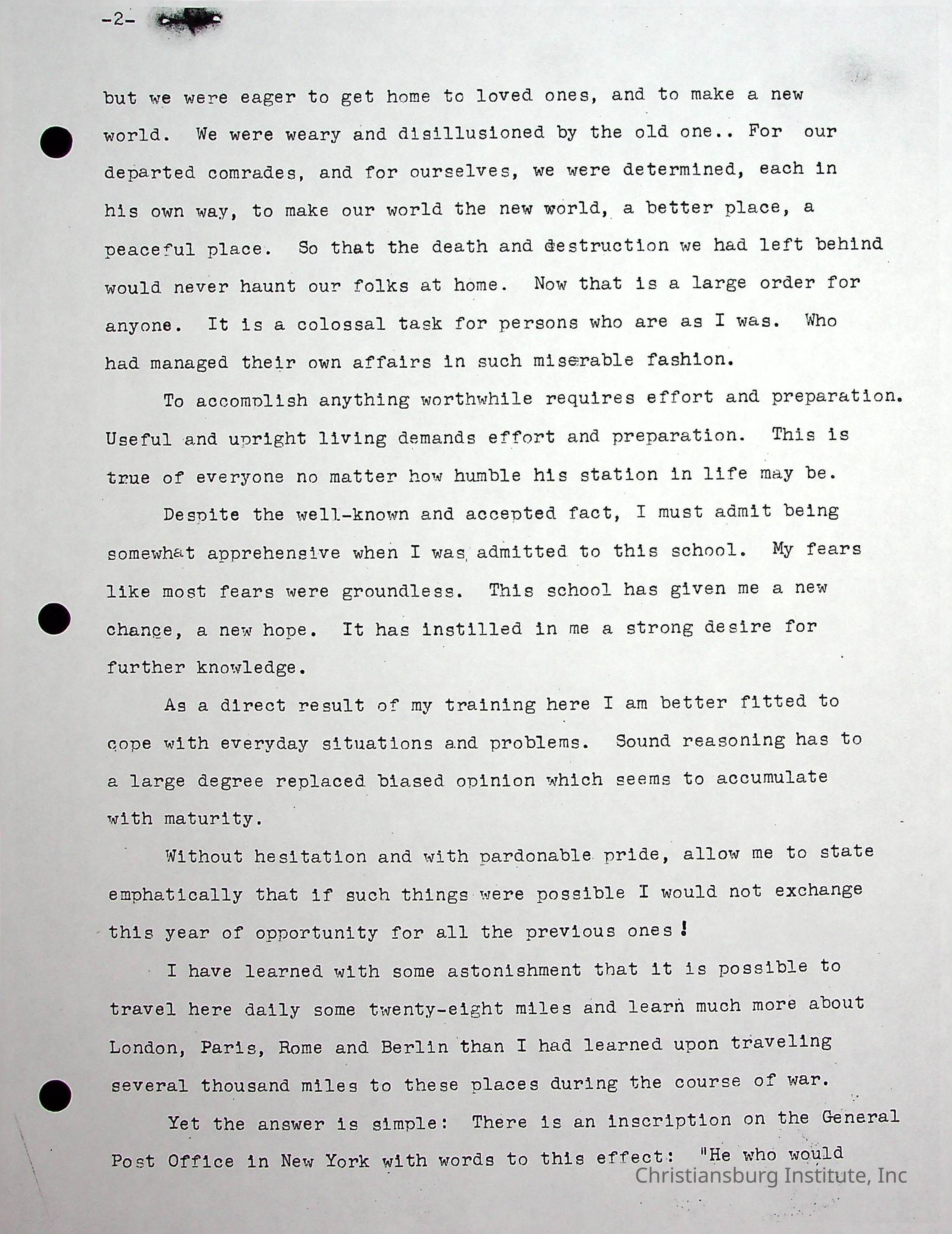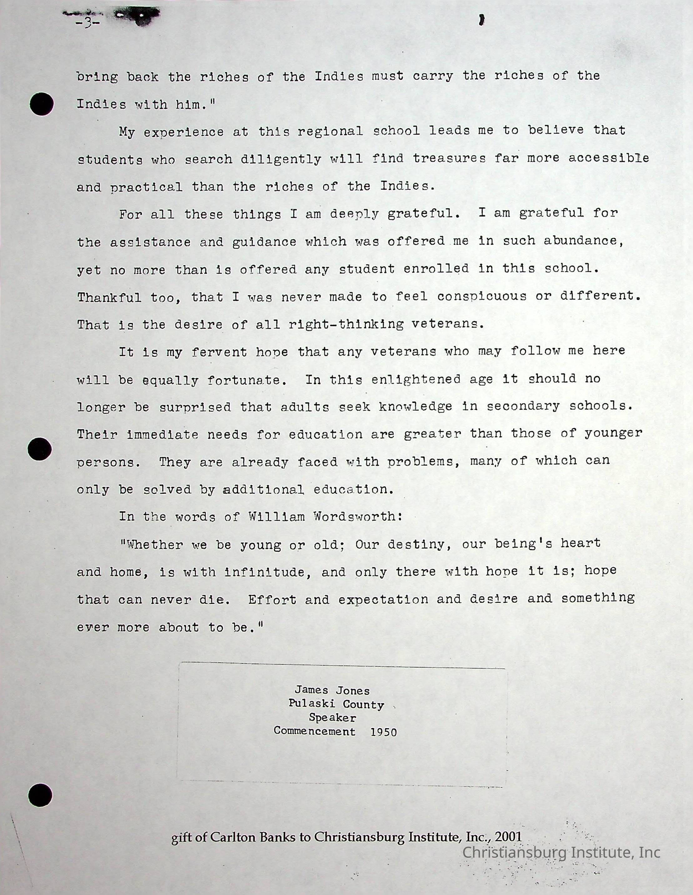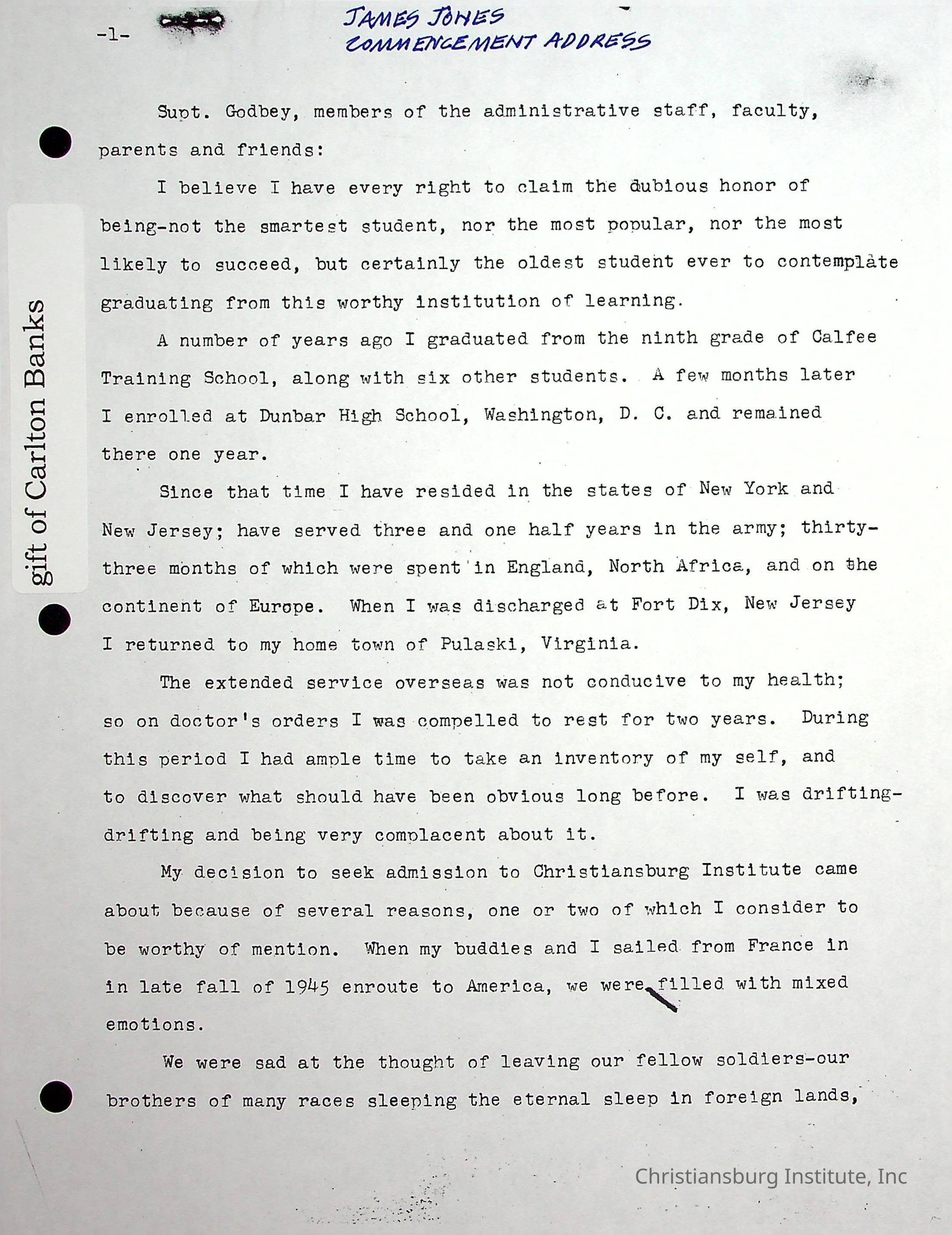 A copy of the commencement speech given by James Jones of Pulaski County at the 1950 commencement exercises. Gifted by Carlton Banks in 2001.Creator