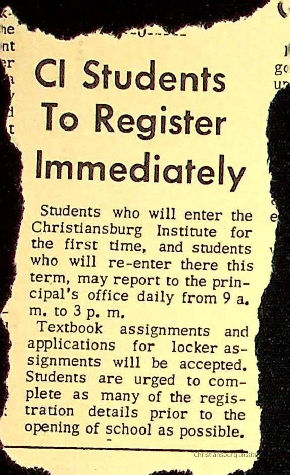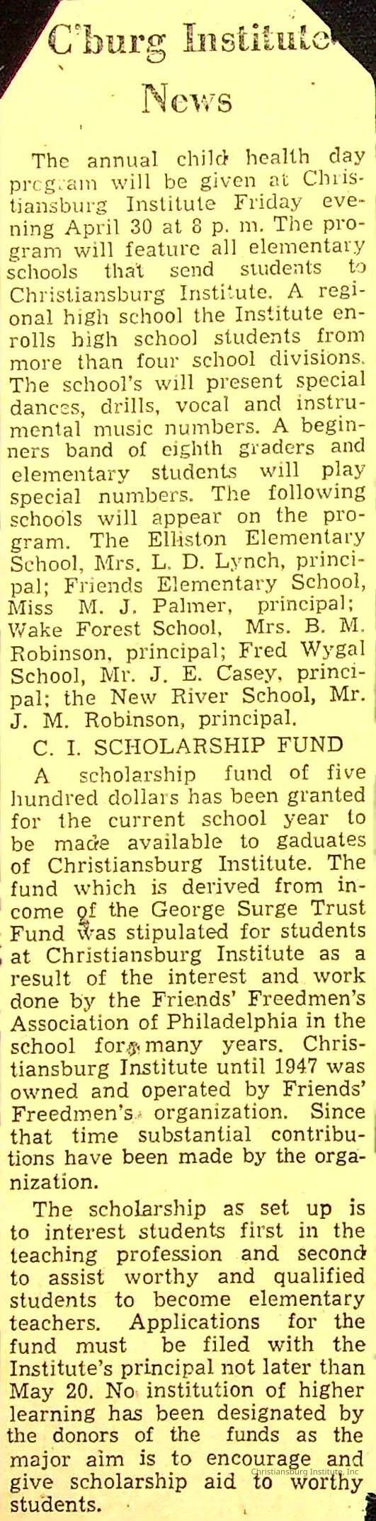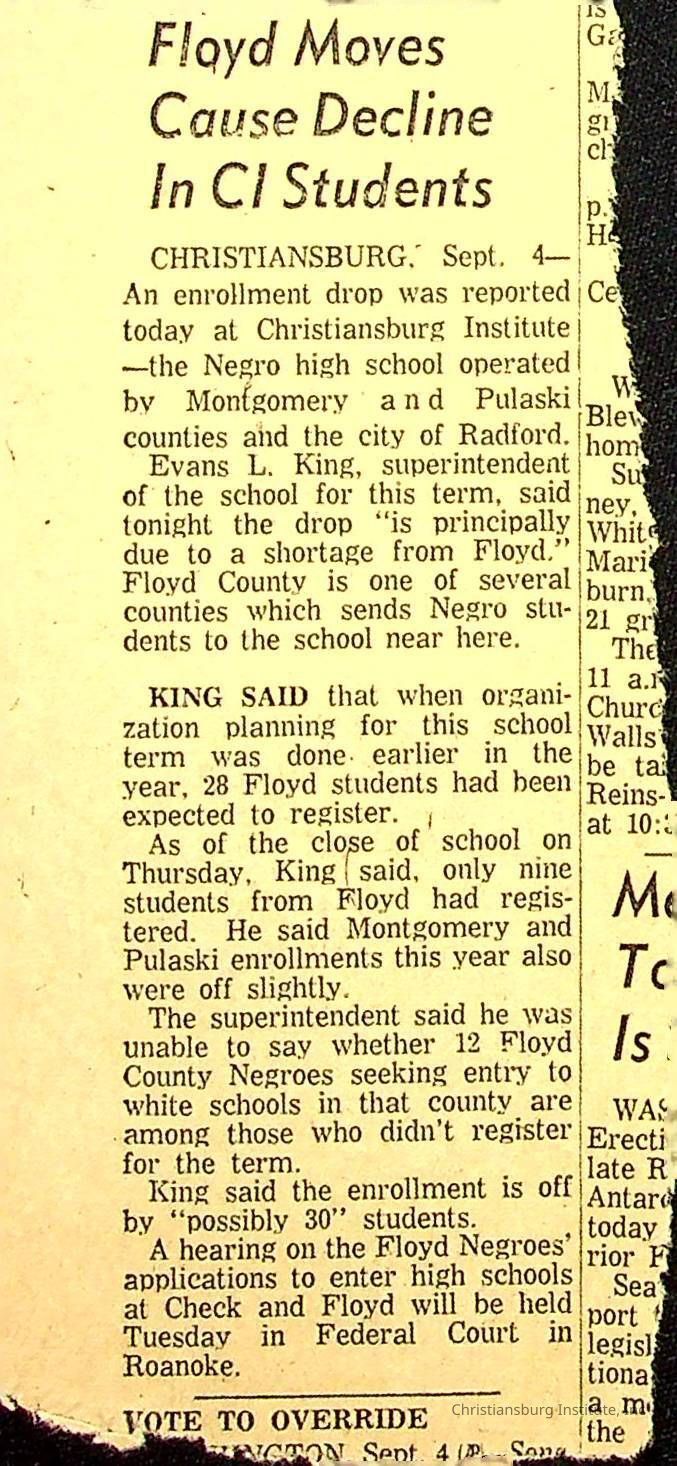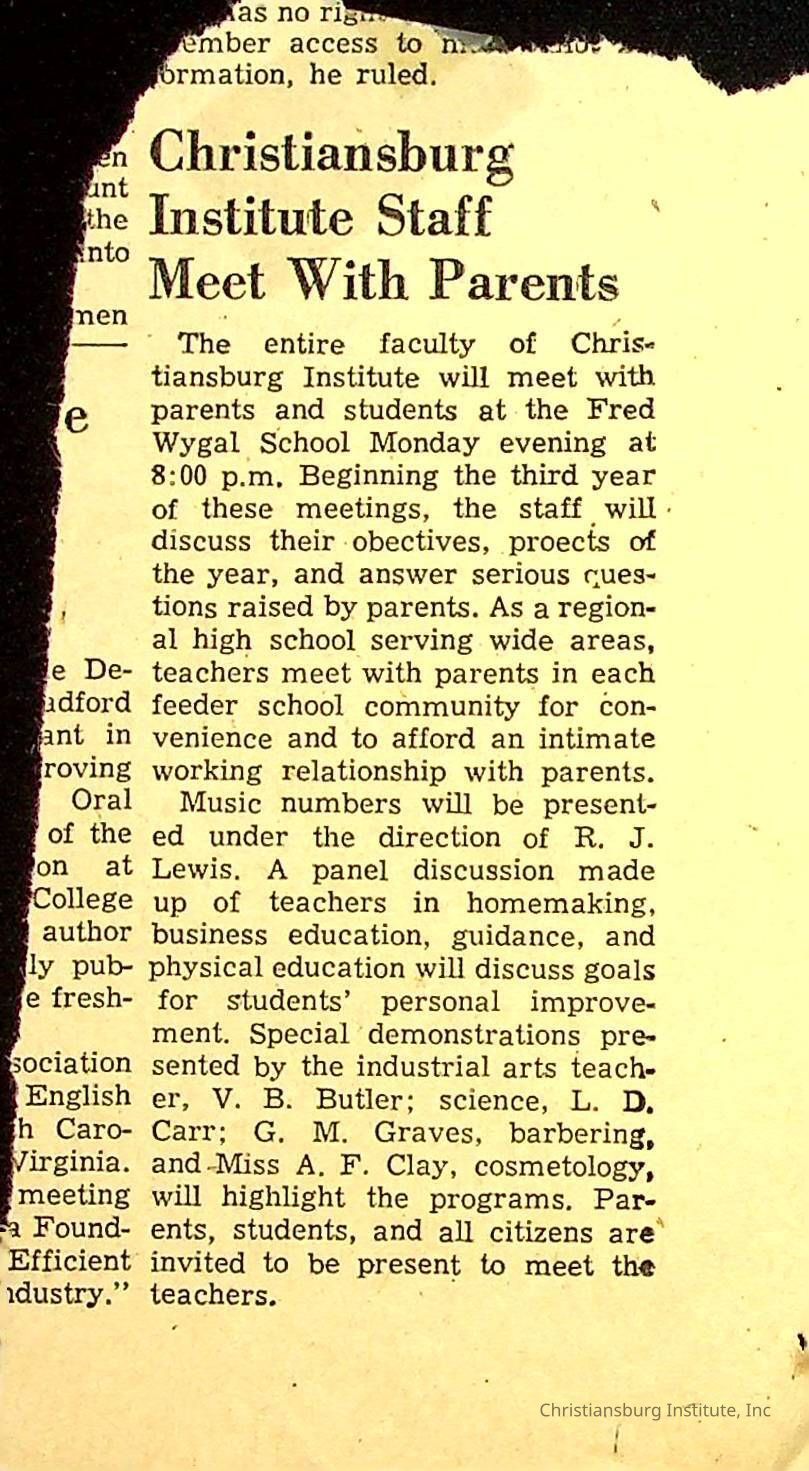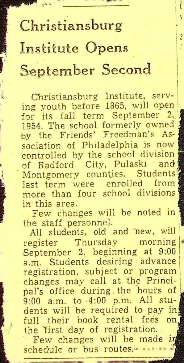 A series of newspaper clippings that feature stories about administrative news in regards to Christiansburg Institute circa 1950s-1960s.
