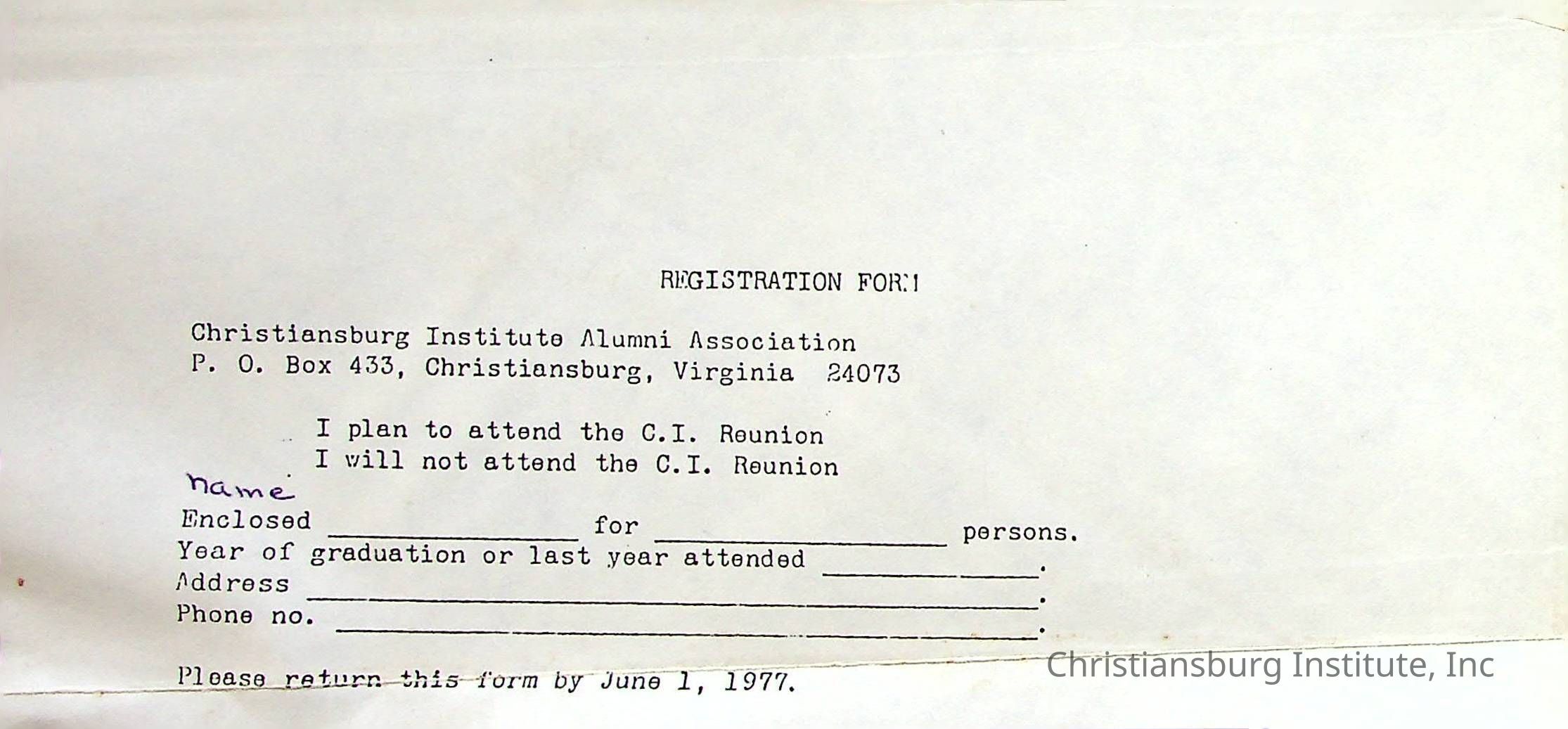 John F. Banks Correspondence: 1977 Christiansburg Institute Alumni Association reunion registration formDescription