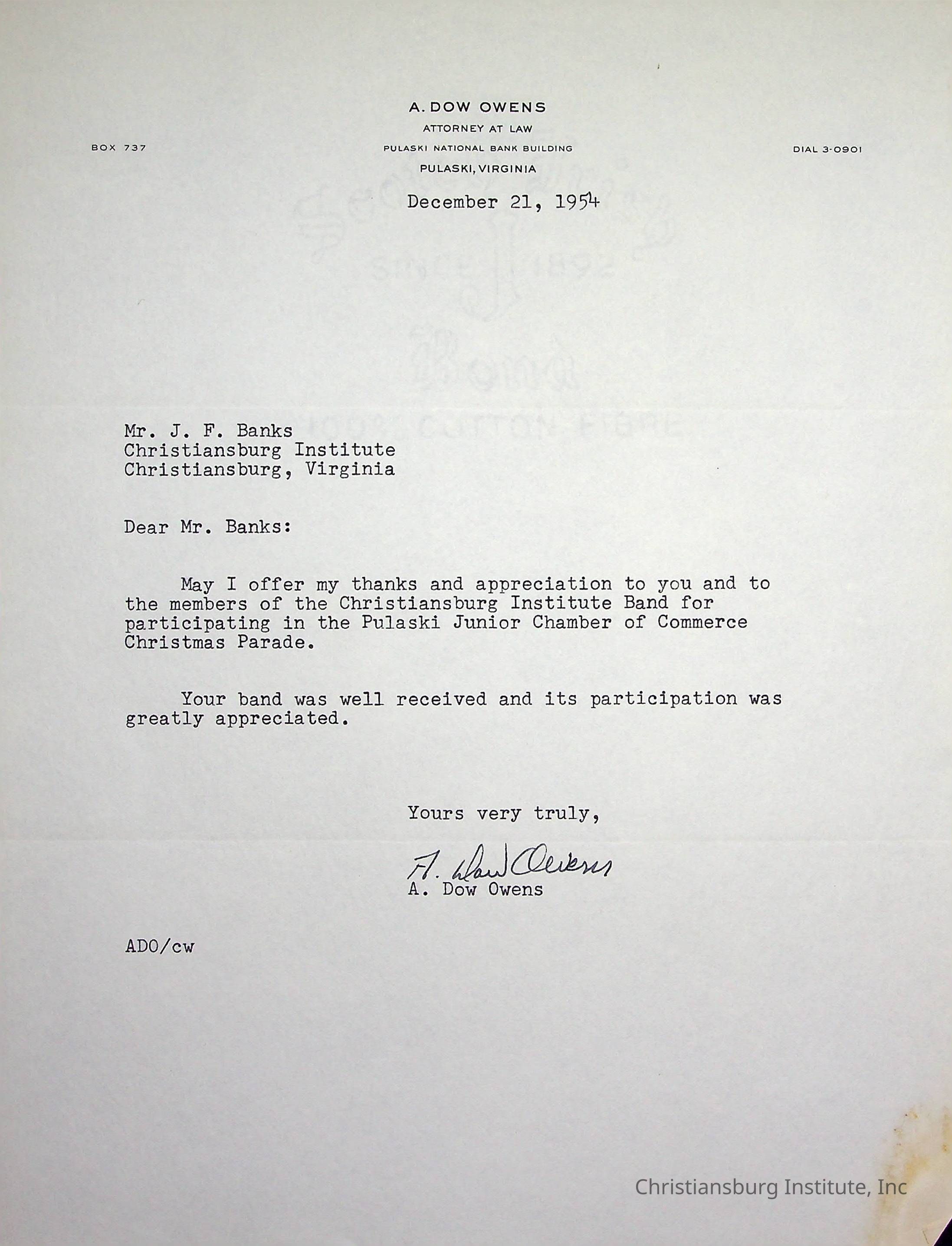 A letter from Pulaski attorney, A. Dow Owens to Christiansburg Institute's principal, John F. Banks dated December 21st, 1954.Creator
