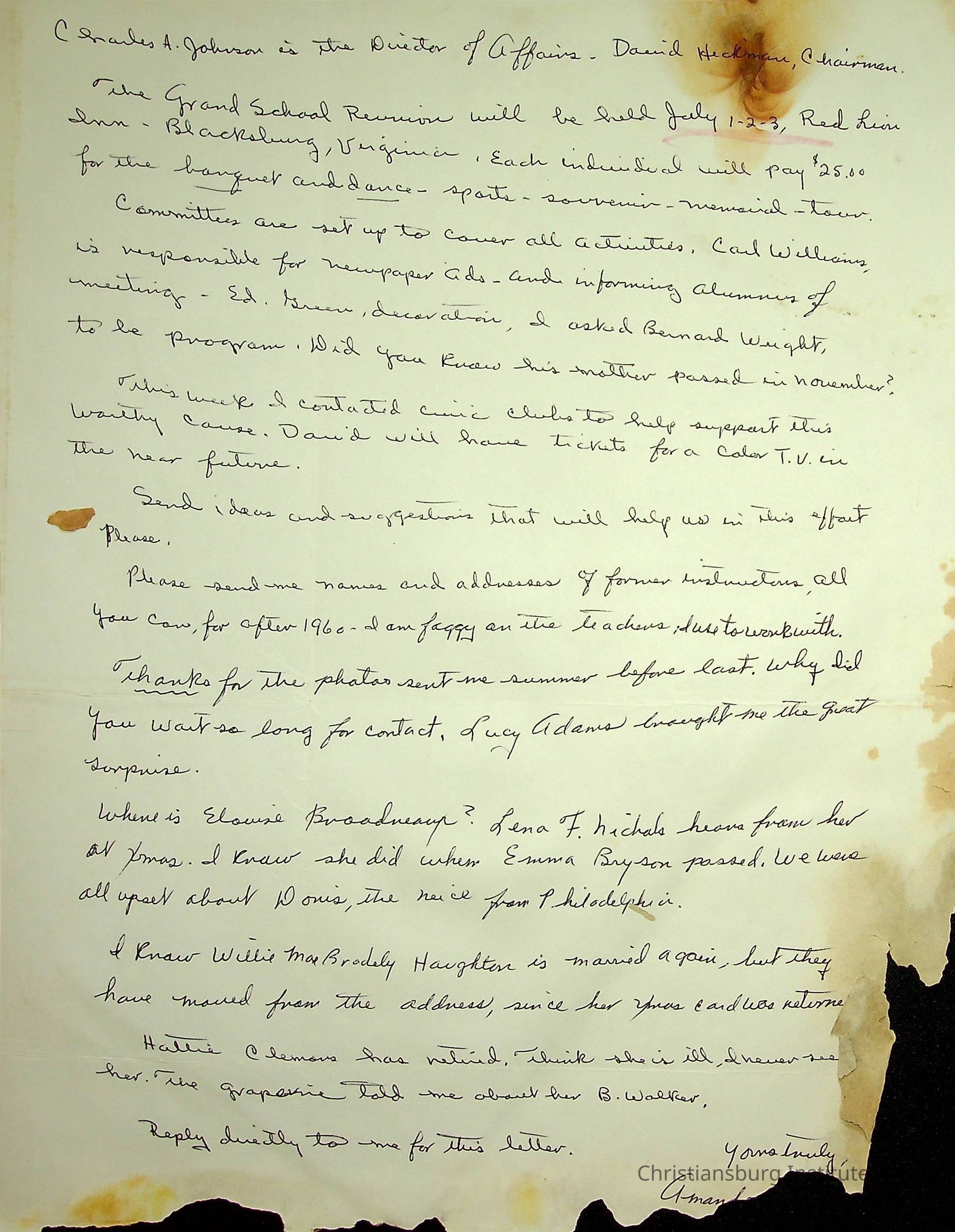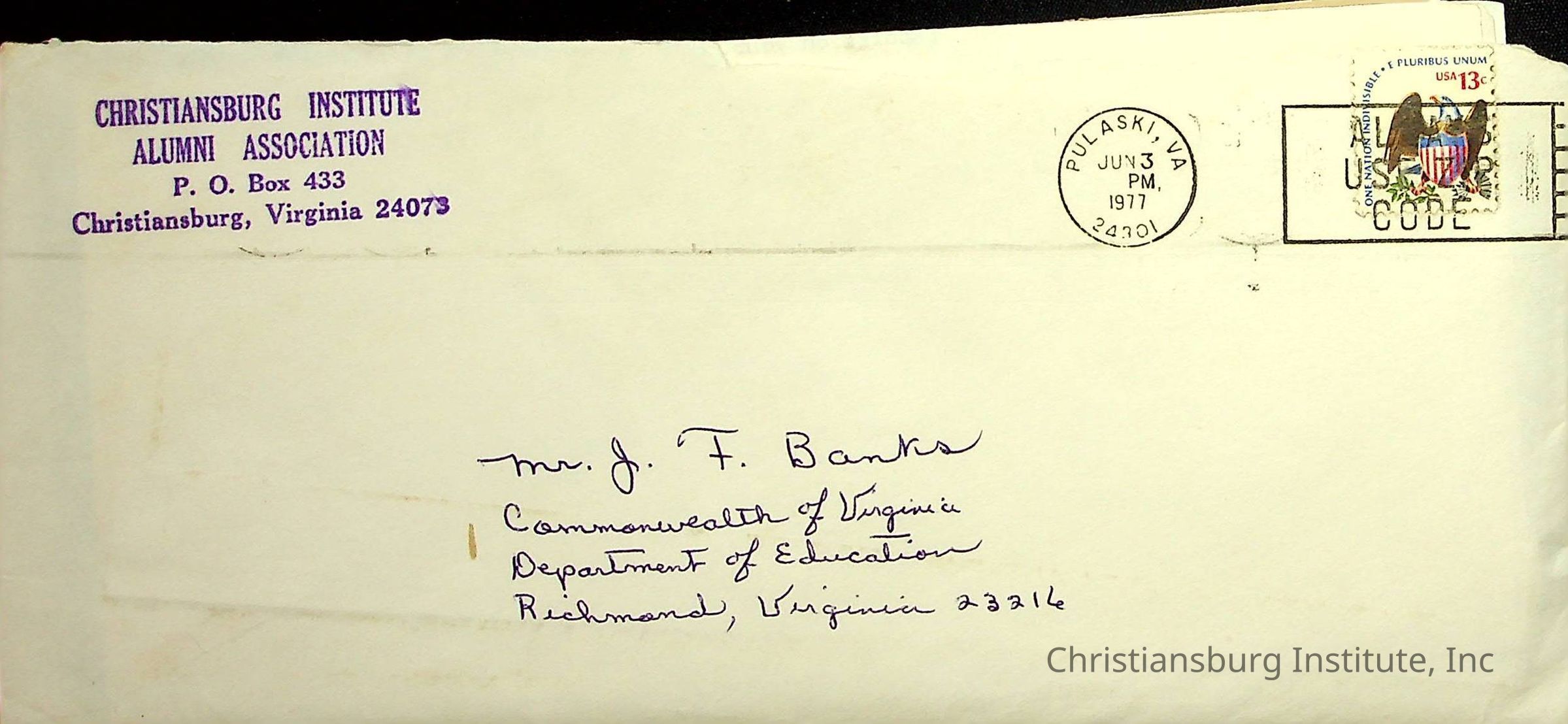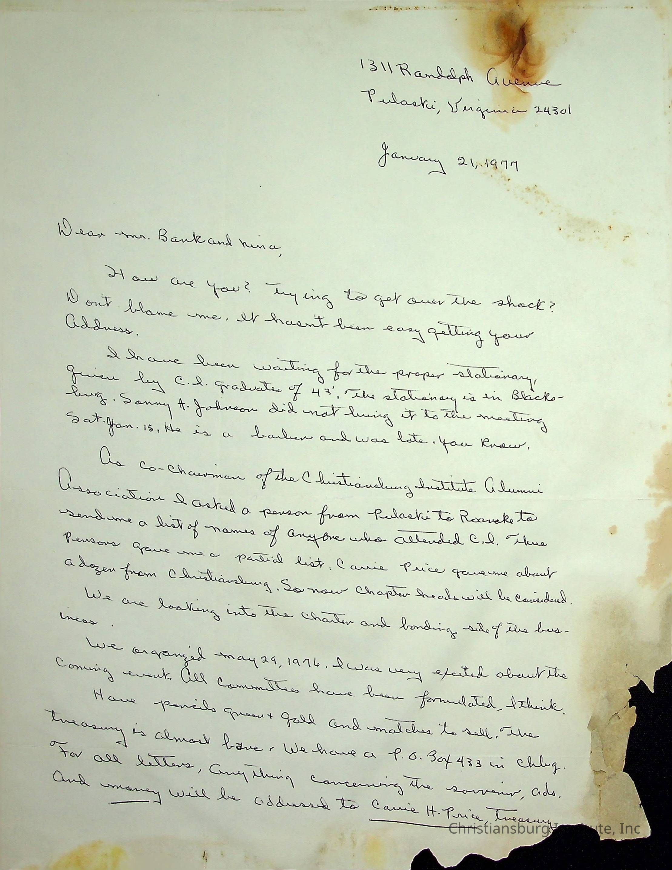 A letter from Amanda DeHart of the Christiansburg Institute Alumni Association to the former Christiansburg Institute principal, John F. Banks dated January 21st, 1977.Creator