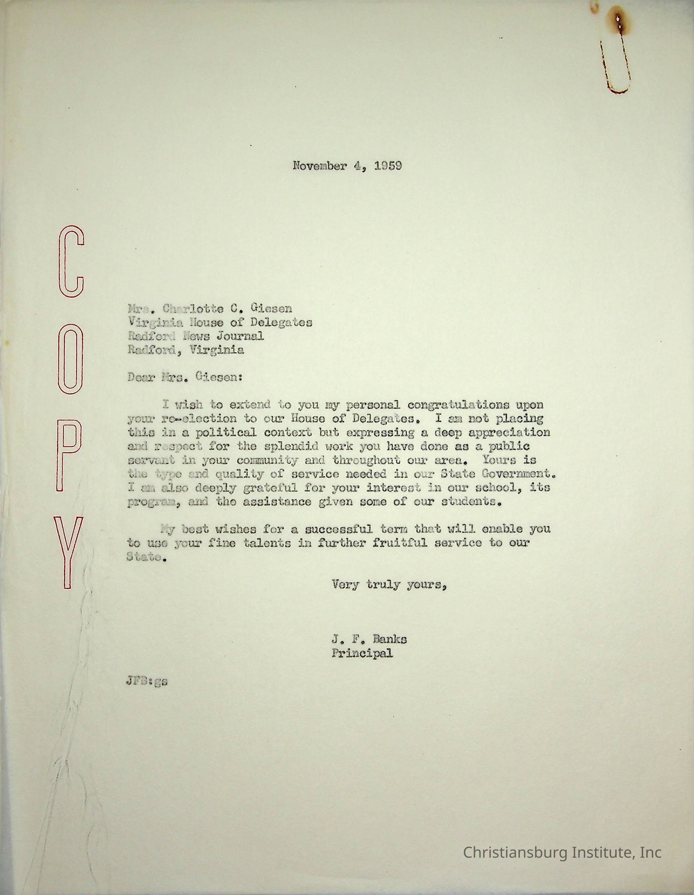A letter from Christiansburg Institute principal, John F. Banks to Charlotte C. Giesen of the Virginia House of Delegates dated November 4th, 1959.Creator