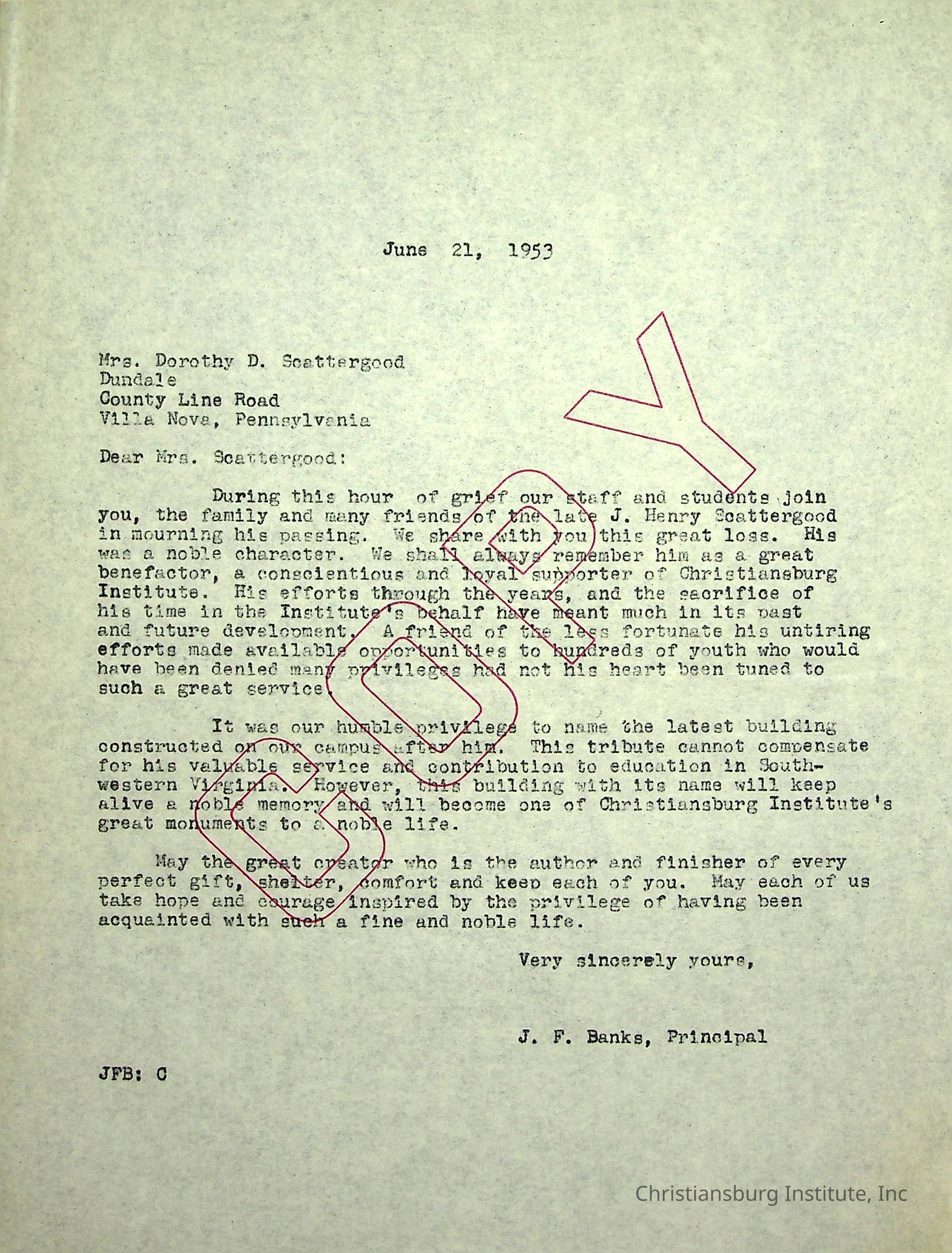 A letter from Christiansburg Industrial Institute principal, John F. Banks to Dorothy Scattergood dated June 21st, 1953.