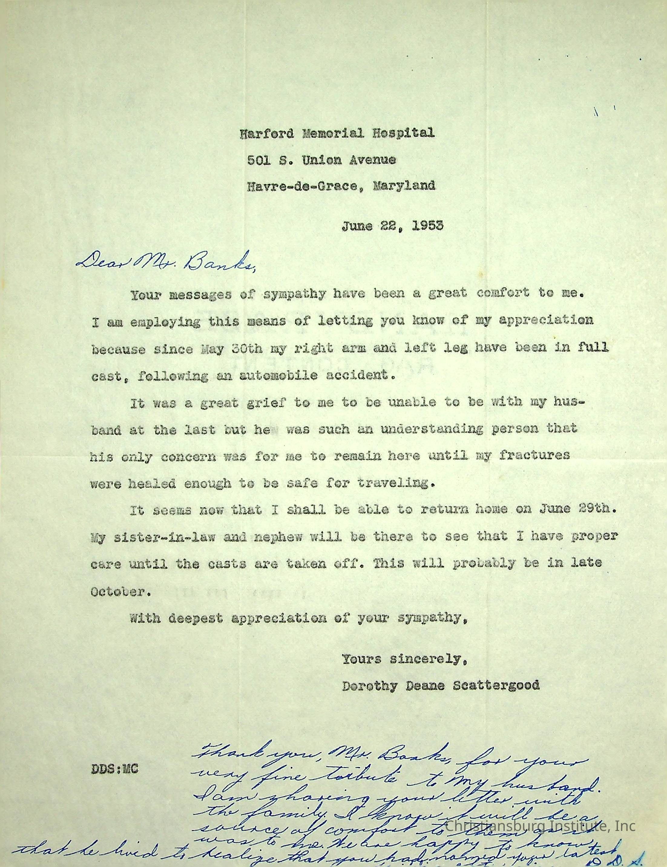 John F. Banks Correspondence: Dorothy Scattergood June 22nd, 1953Description