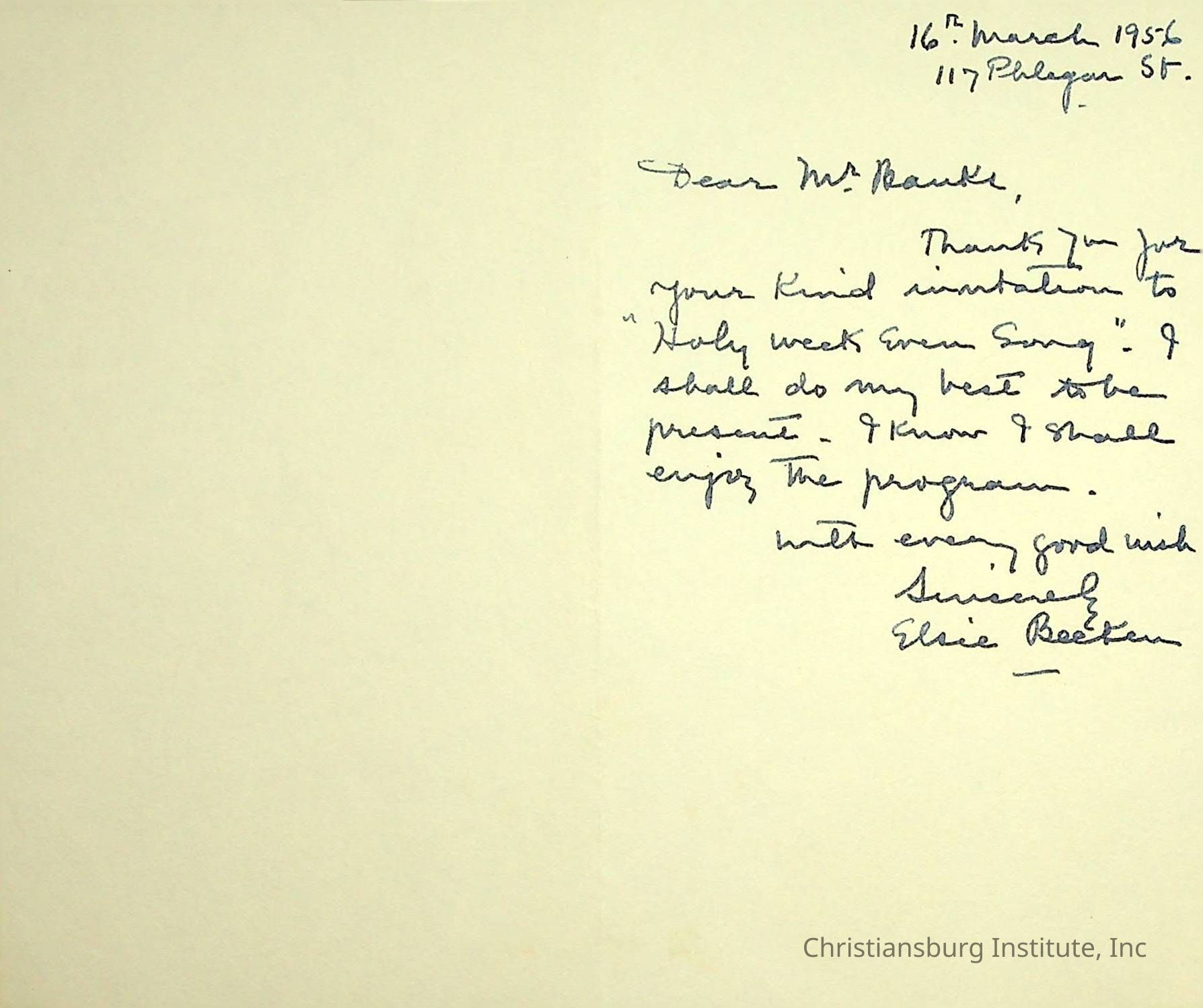 A letter from Elsie Beeken to the Christiansburg Institute principal John F. Banks dated March 16th, 1956.