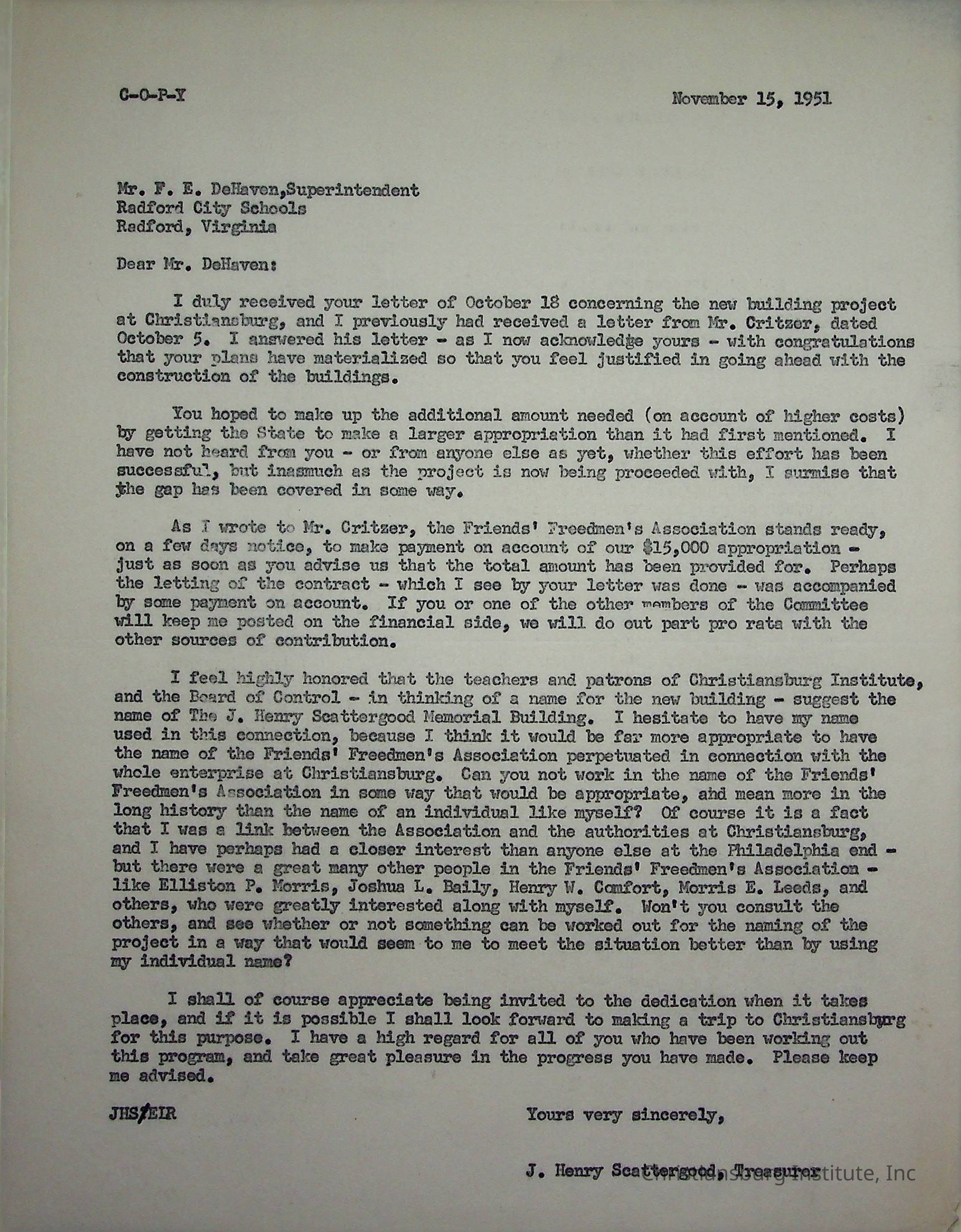 A letter from J. Henry Scattergood to the Radford City Schools superintendent, F. E. DeHaven dated November 15th, 1951.Creator