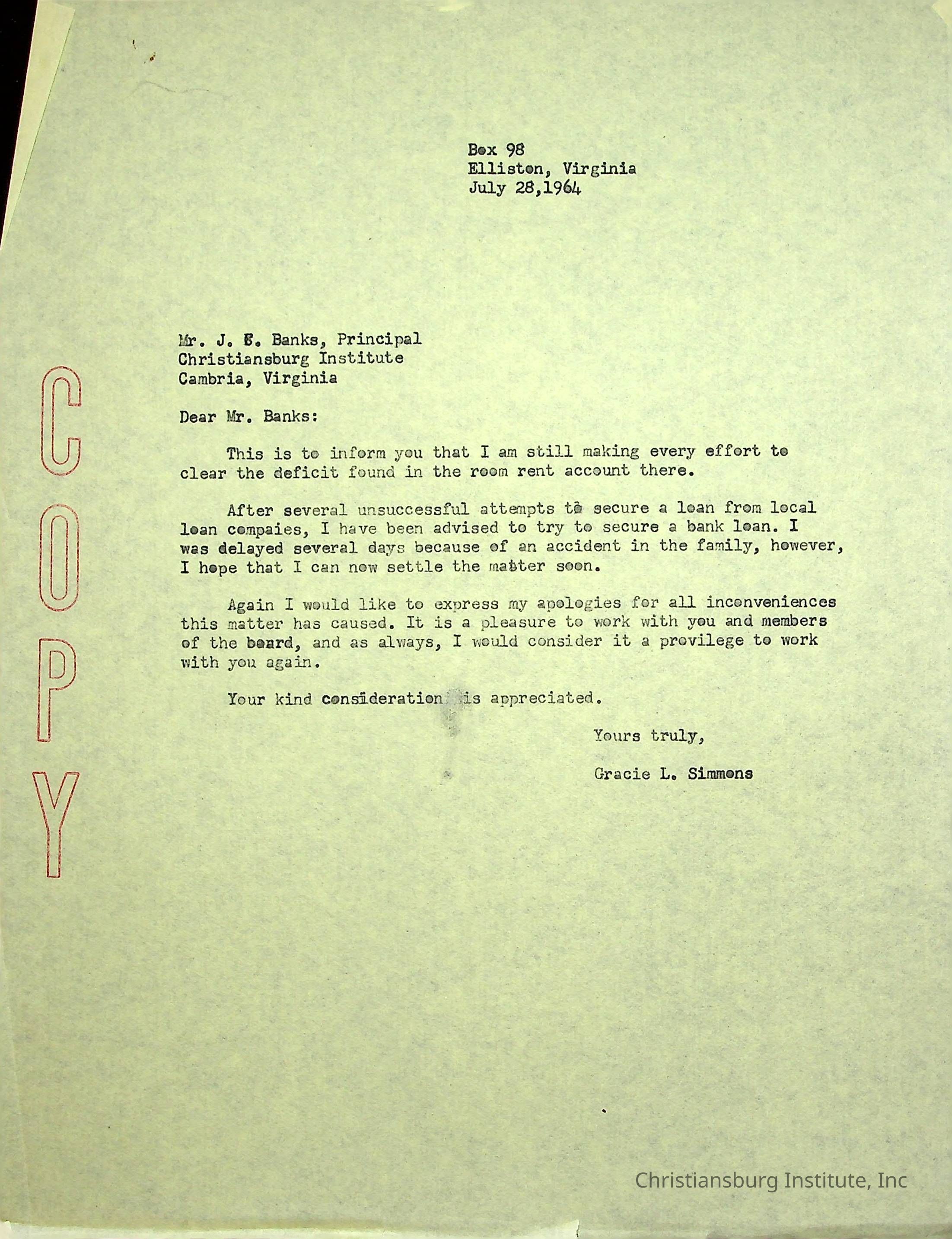 A letter from Gracie L. Simmons to Christiansburg Institute principal, John F. Banks in regards to paying room rent at Christiansburg Institute dated July 28th, 1964.Creator