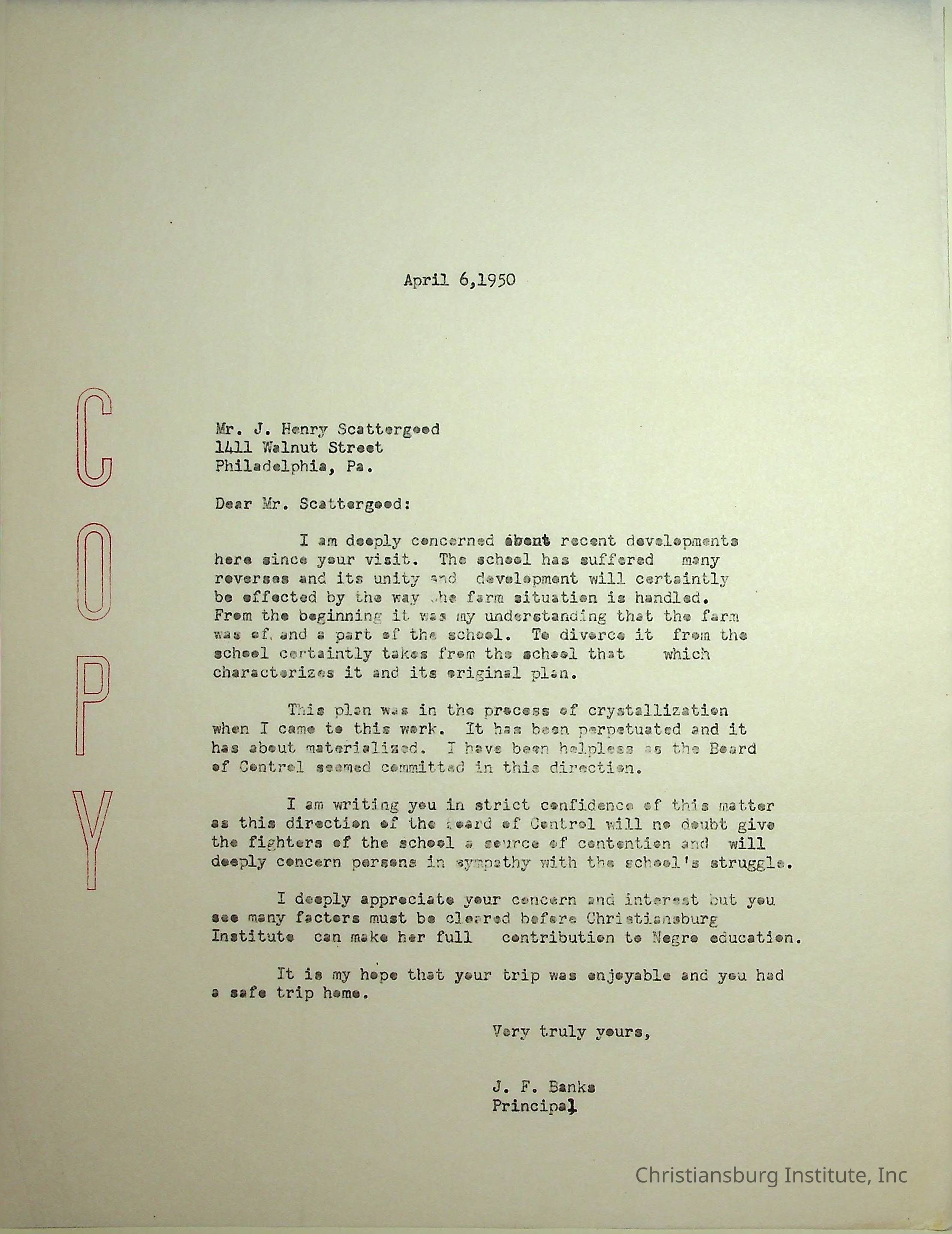A letter from Christiansburg Industrial Institute principal, John F. Banks to J. Henry Scattergood dated April 6th, 1950.Creator