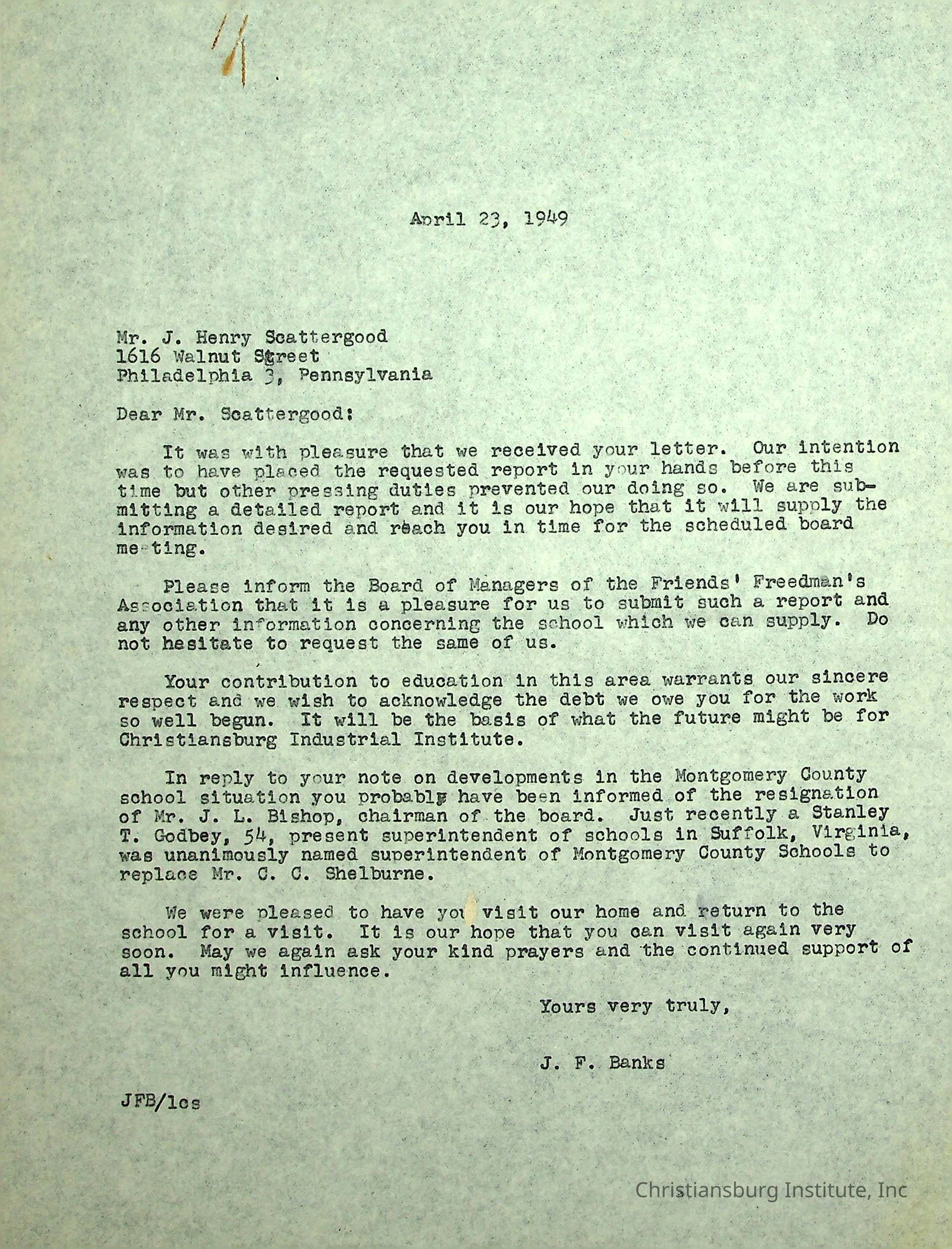 A letter from Christiansburg Industrial Institute principal, John F. Banks to J. Henry Scattergood dated April 23rd, 1949.Creator