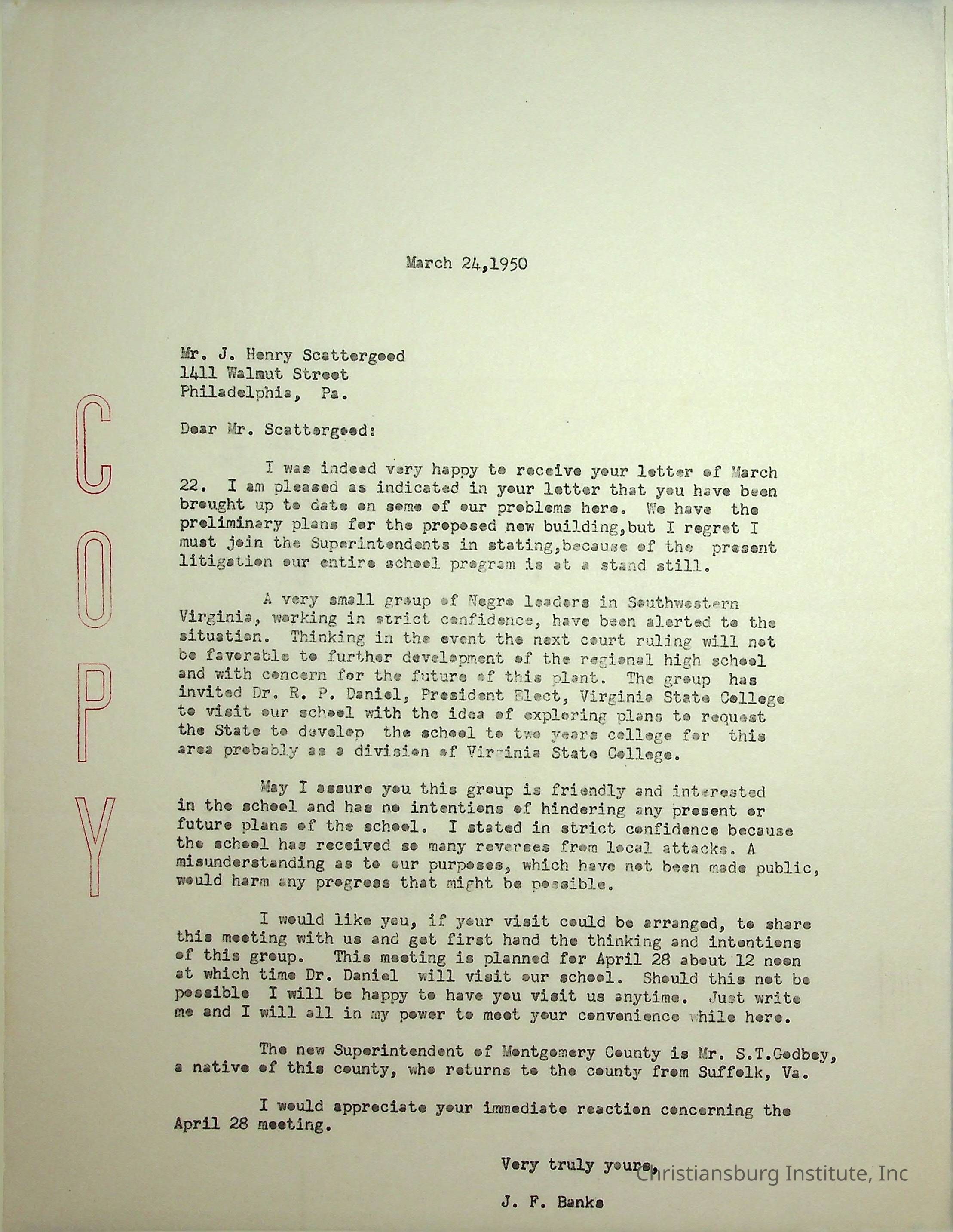 A letter from Christiansburg Industrial Institute principal, John F. Banks to J. Henry Scattergood dated March 24th, 1950.Creator