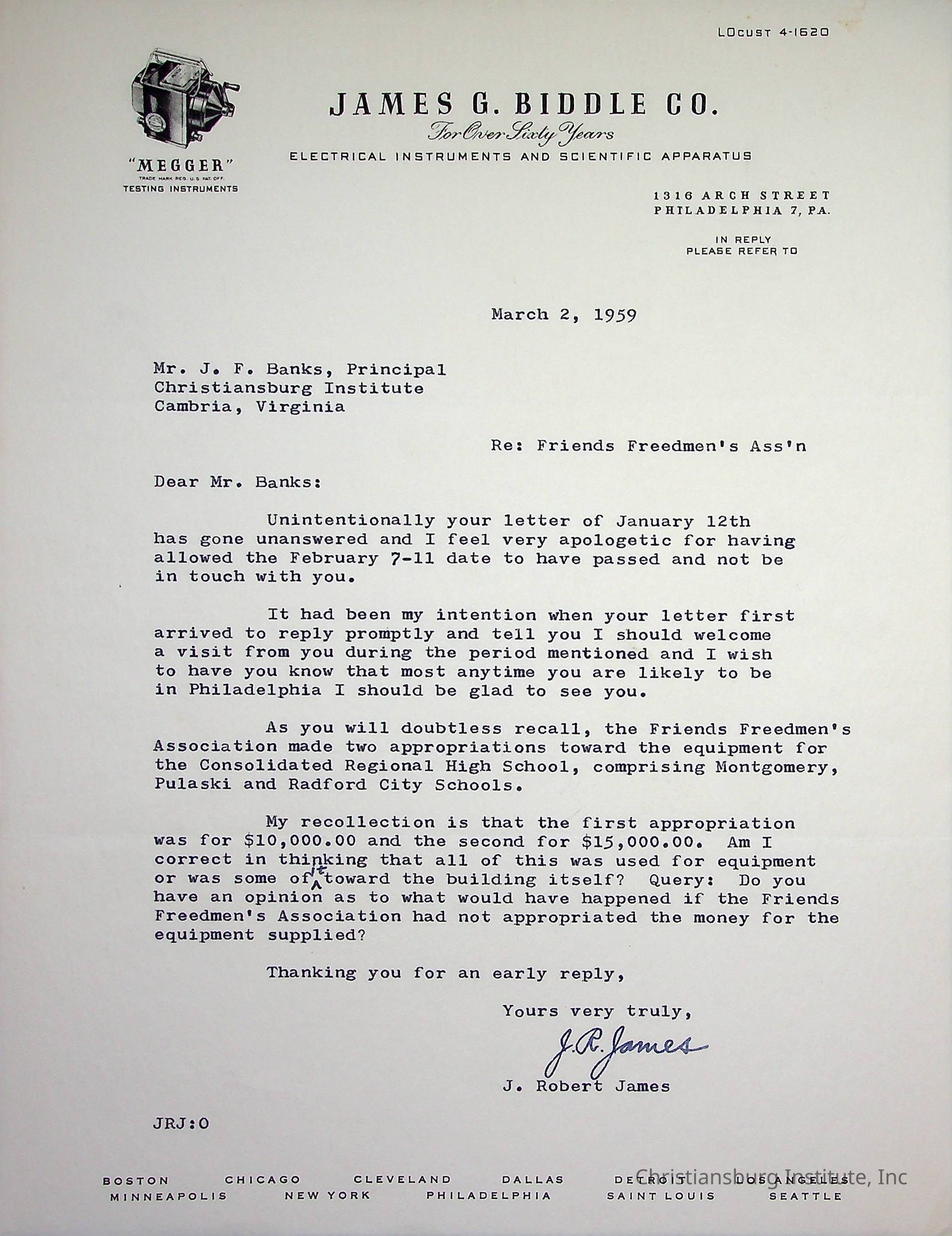 A letter from J. Robert James of the James G. Biddle Company to the Christiansburg Institute principal, John F. Banks dated March 2nd, 1959.Creator