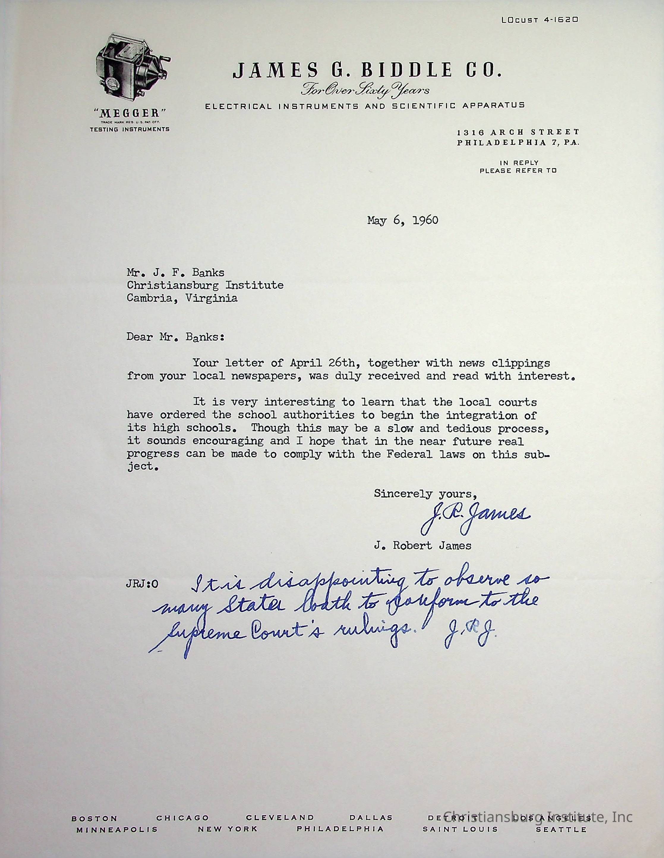 A letter from J. Robert James of the James G. Biddle Company to the Christiansburg Institute principal, John F. Banks dated May 6th, 1960.Creator