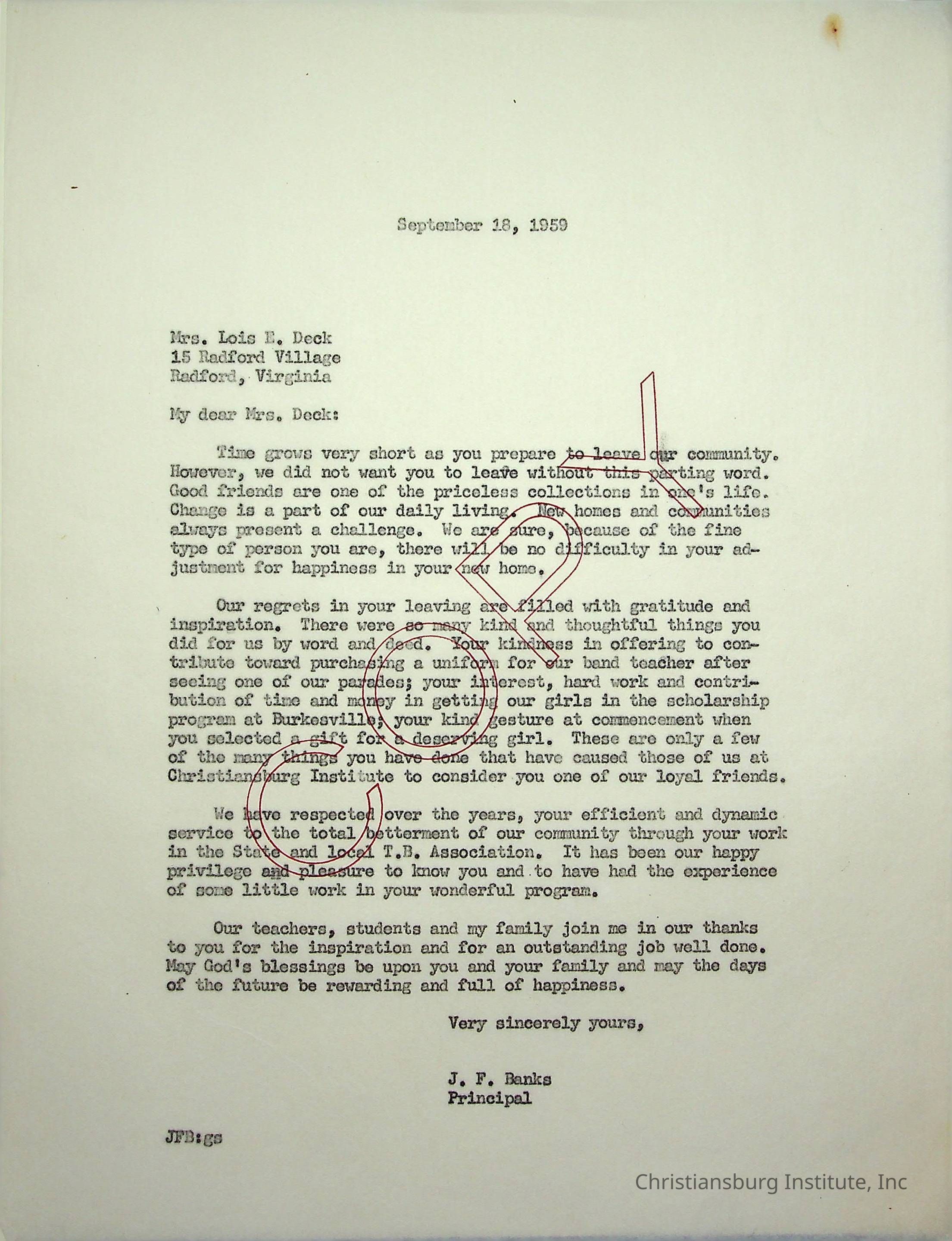 A letter from Christiansburg Institute principal, John F. Banks to Lois Deck dated September 18th, 1959.