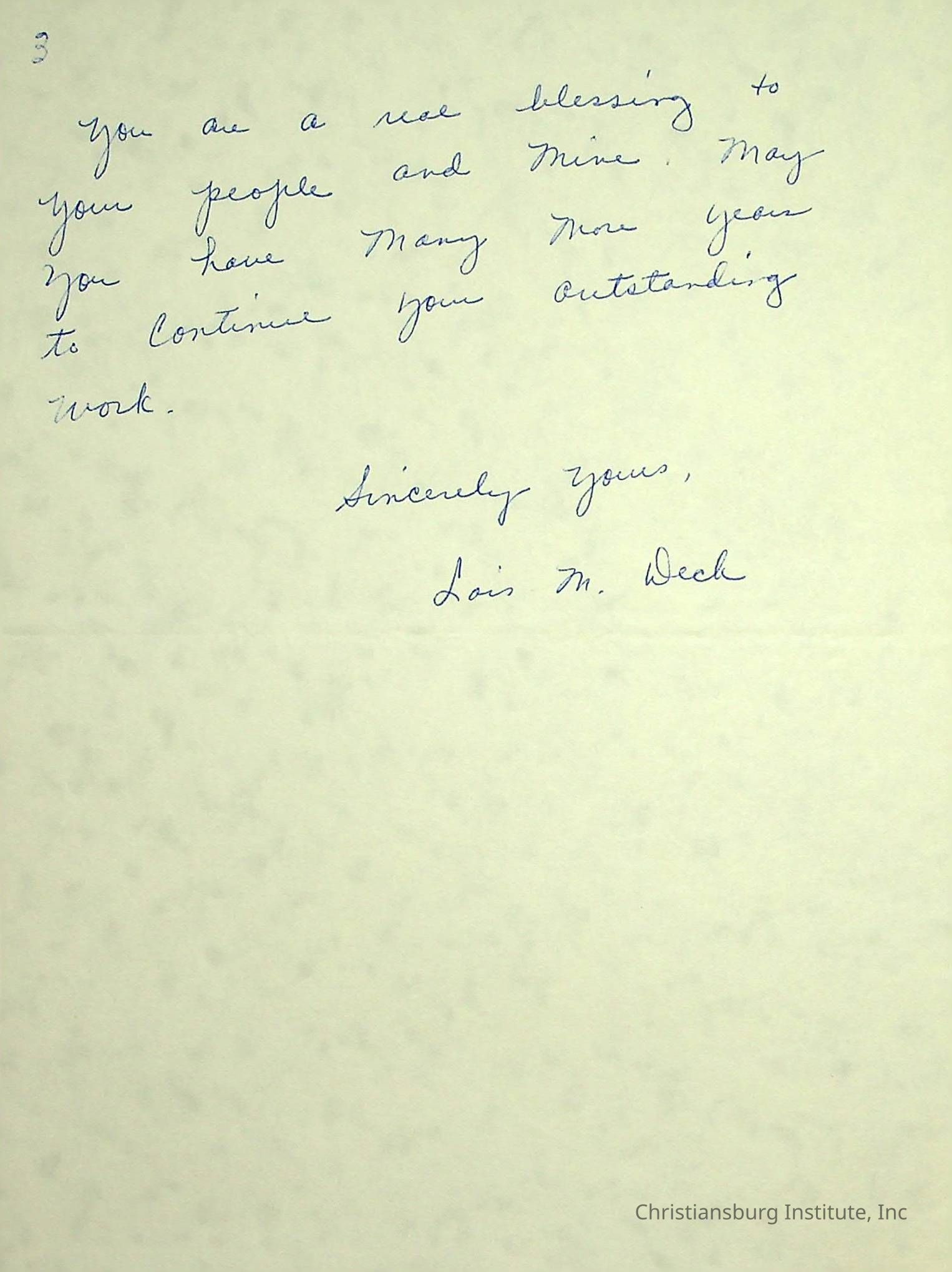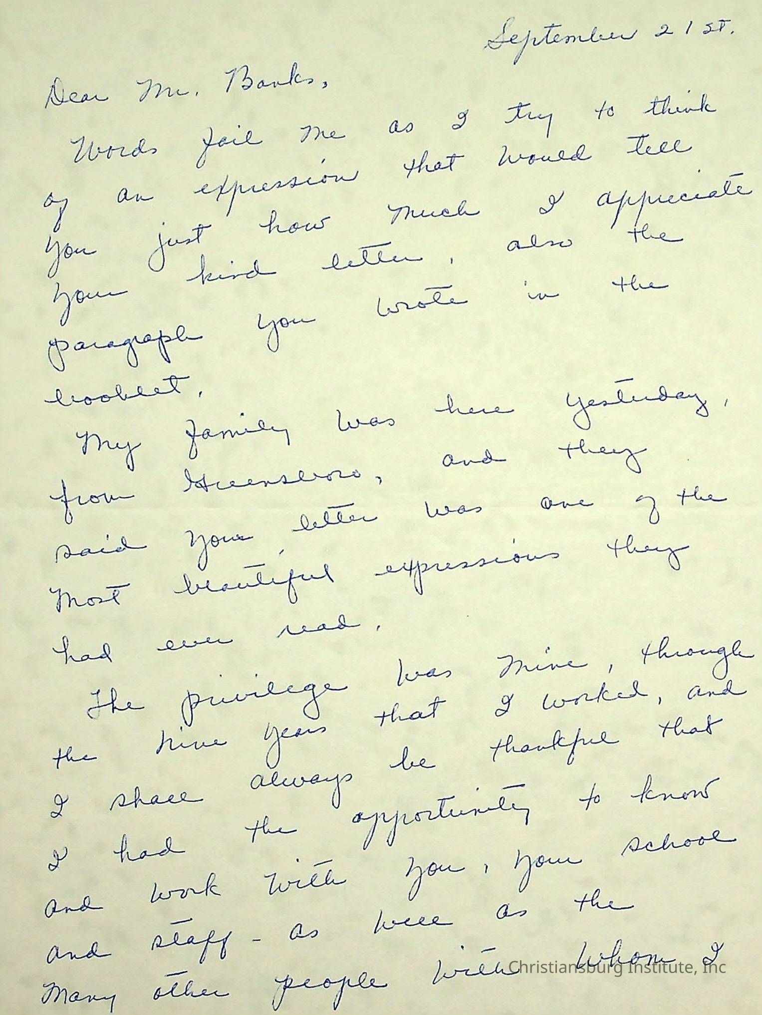 A letter from Lois Deck to Christiansburg Institute principal, John F. Banks dated September 21st, 1966.