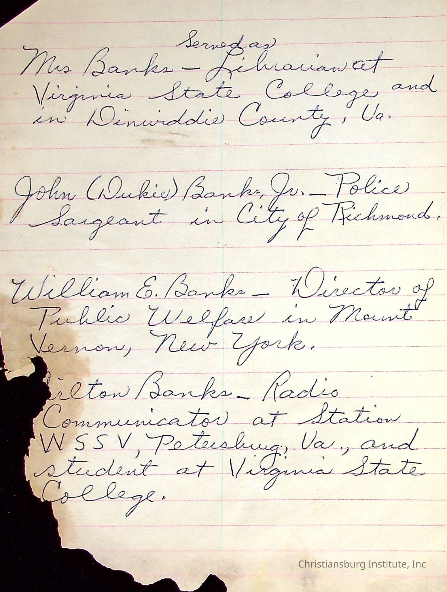 Copyright has been assigned to Christiansburg Institute Museum & Archives by Carlton Banks. For permission to publish materials created by the donor, contact CIMA@christiansburginstitute.com. Materials not created by John F. Banks may still be under copyright.