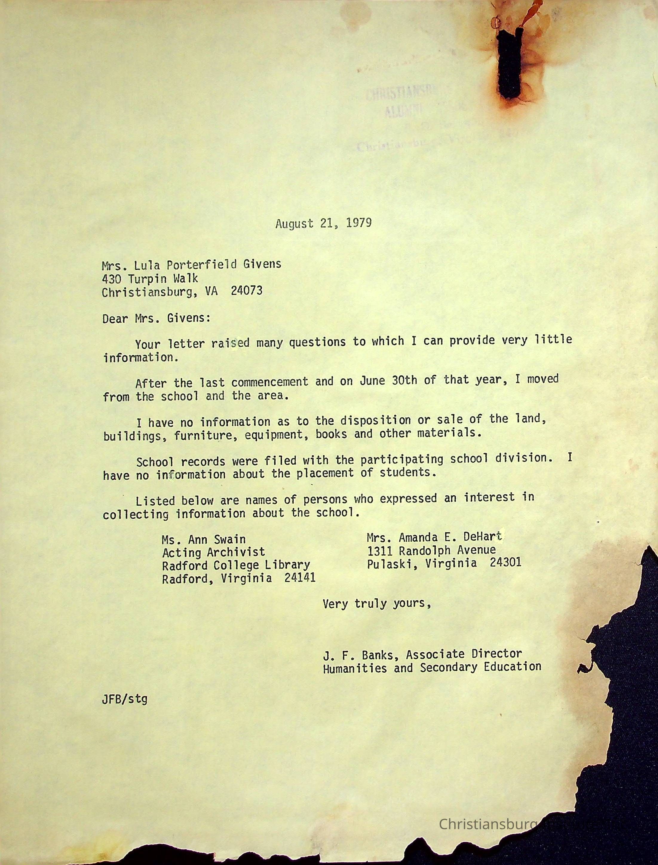 A letter from the former Christiansburg Institute principal, John F. Banks to Lula P. Givens dated August 21st, 1979.