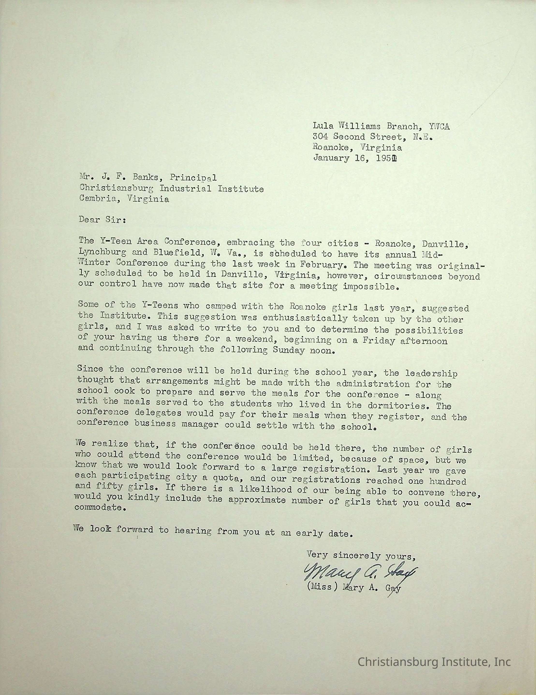 A letter from the YWCA Lula Williams Branch camp committee member, Mary Gay to Christiansburg Industrial Institute principal, John F. Banks dated January 16th, 1951.Creator