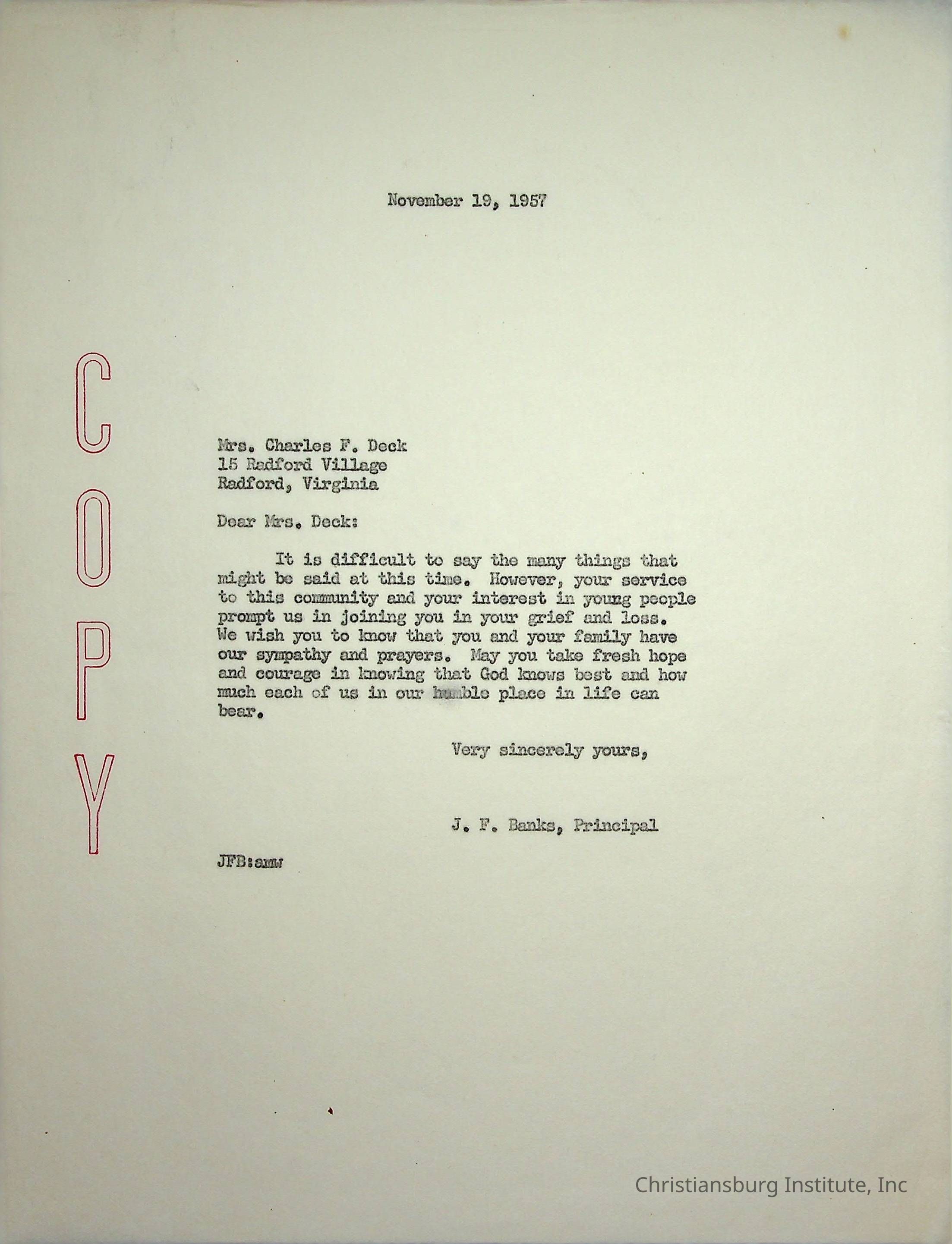 A letter from the Christiansburg Institute principal, John F. Banks to Mrs. Charles F. Deck (Lois Deck) dated November 19th, 1957.Creator