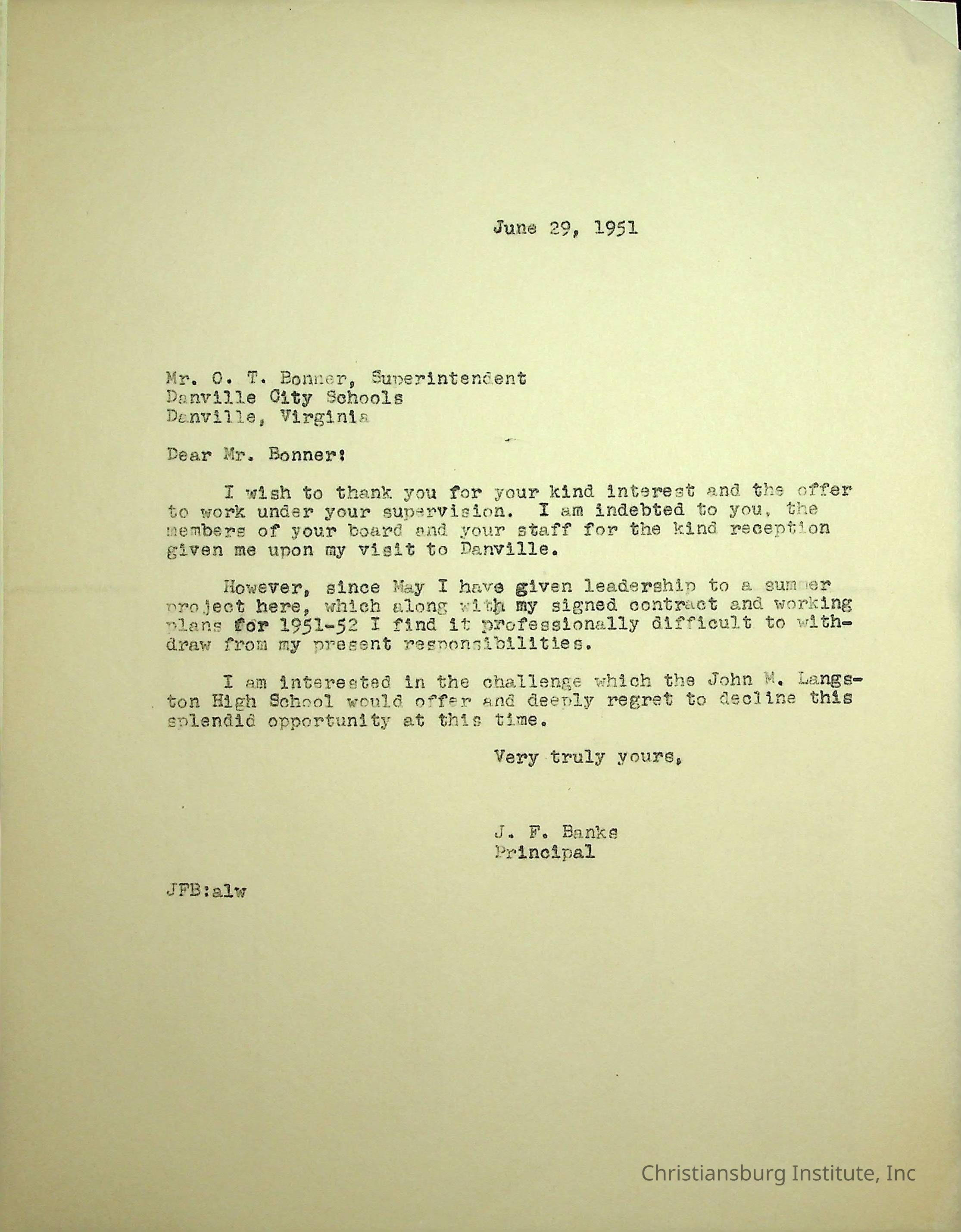 A letter from the Christiansburg Industrial Institute principal, John F. Banks to Danville City Schools Superintendent, O. T. Bonner dated June 29th, 1951.Creator