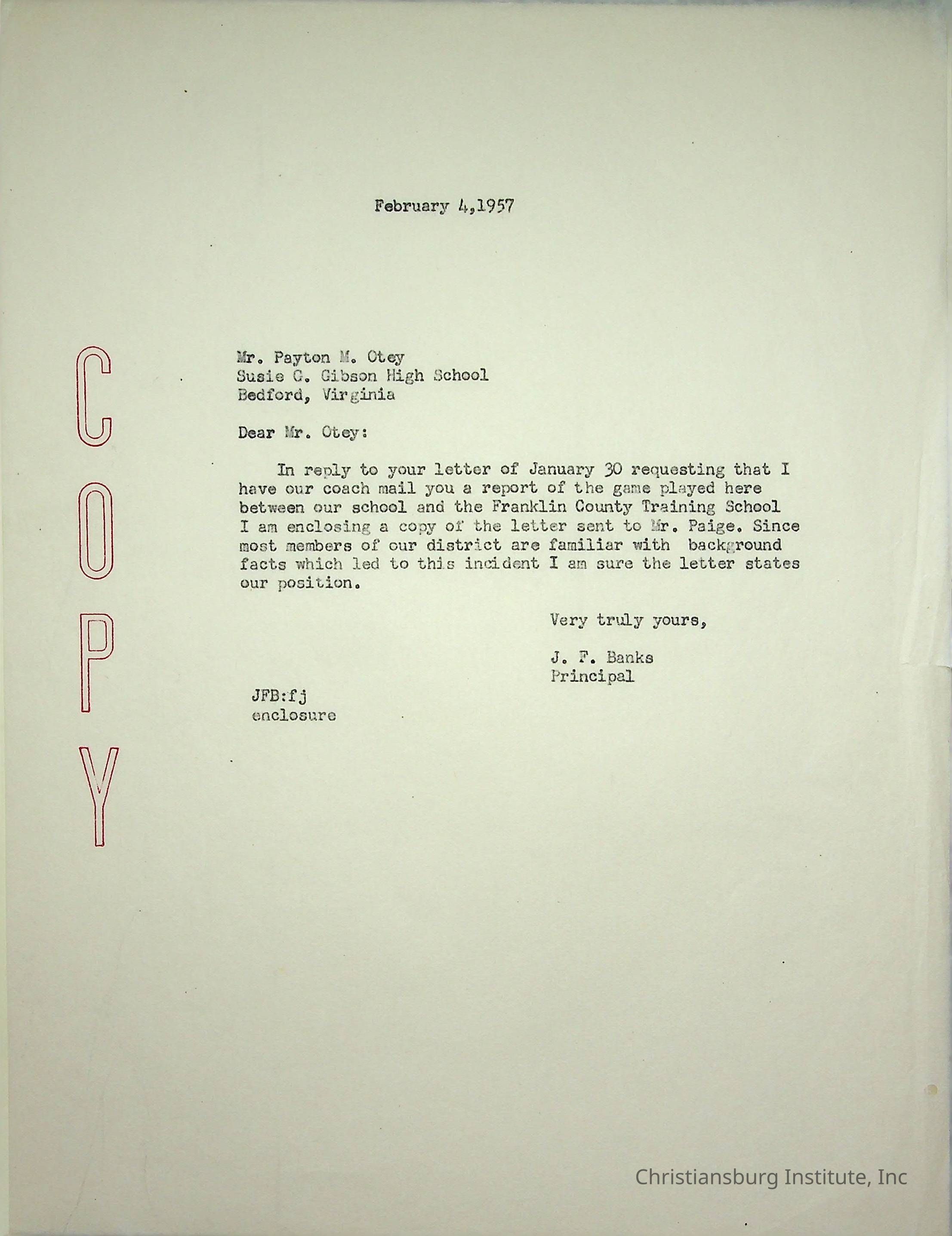 A letter from the Christiansburg Institute principal, John F. Banks to Payton M. Otey of Susie G. Gibson High School dated February 4th, 1957.Creator